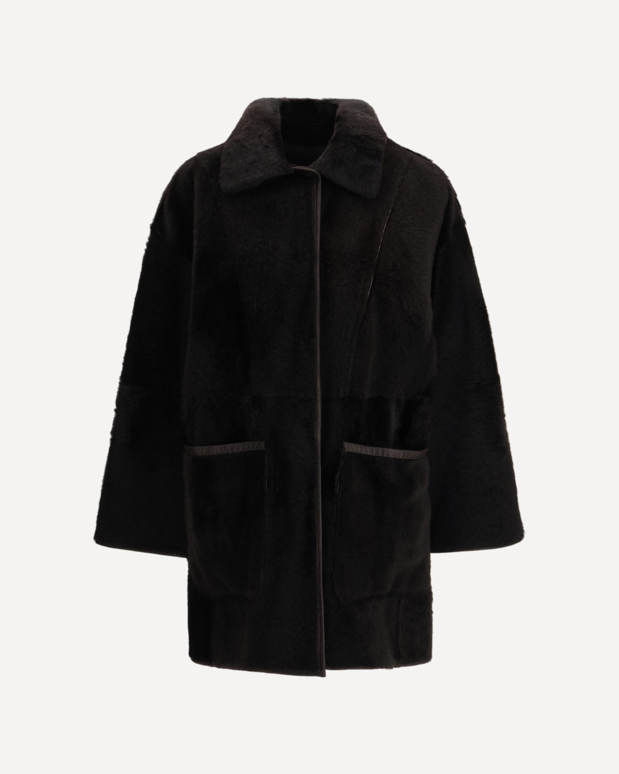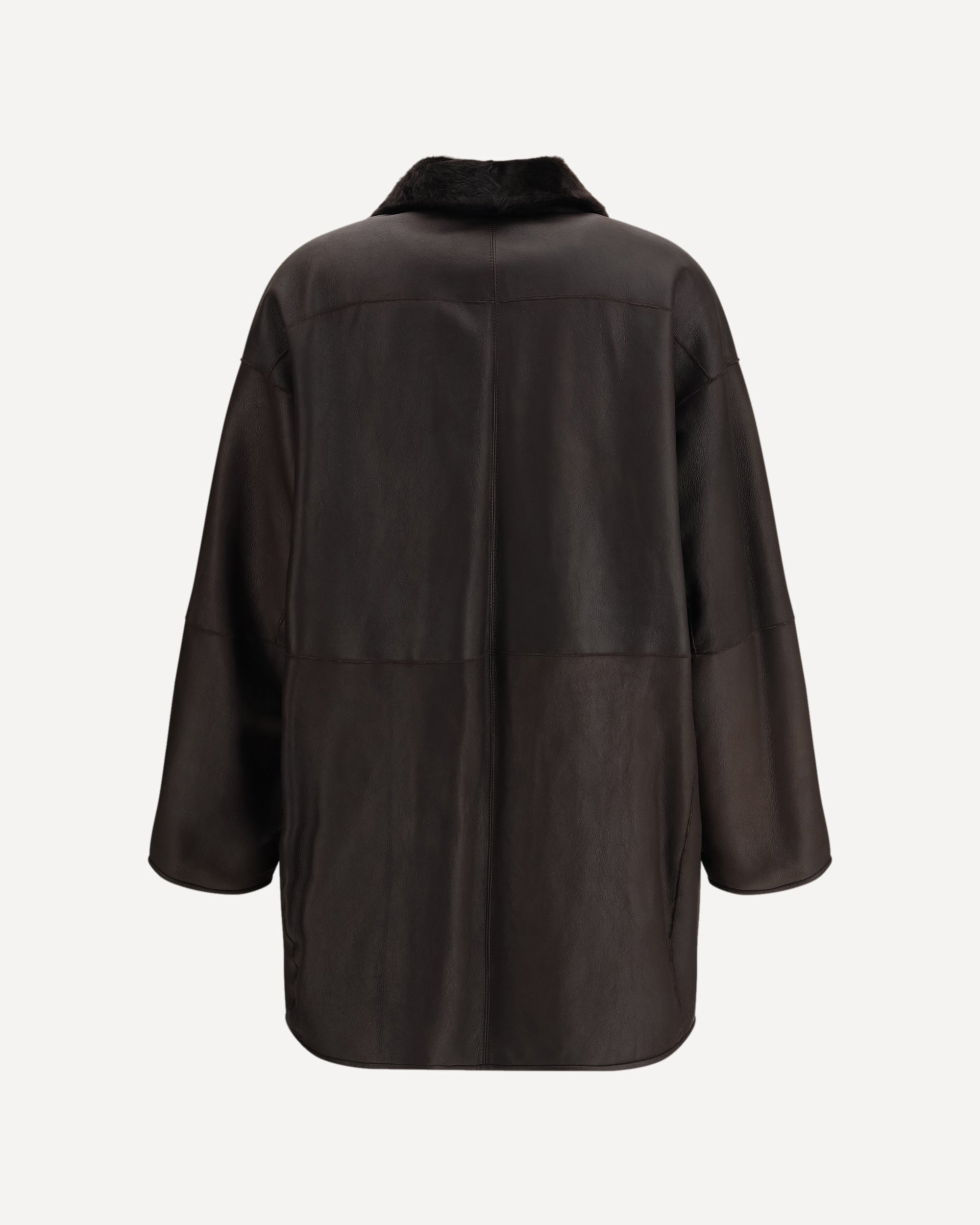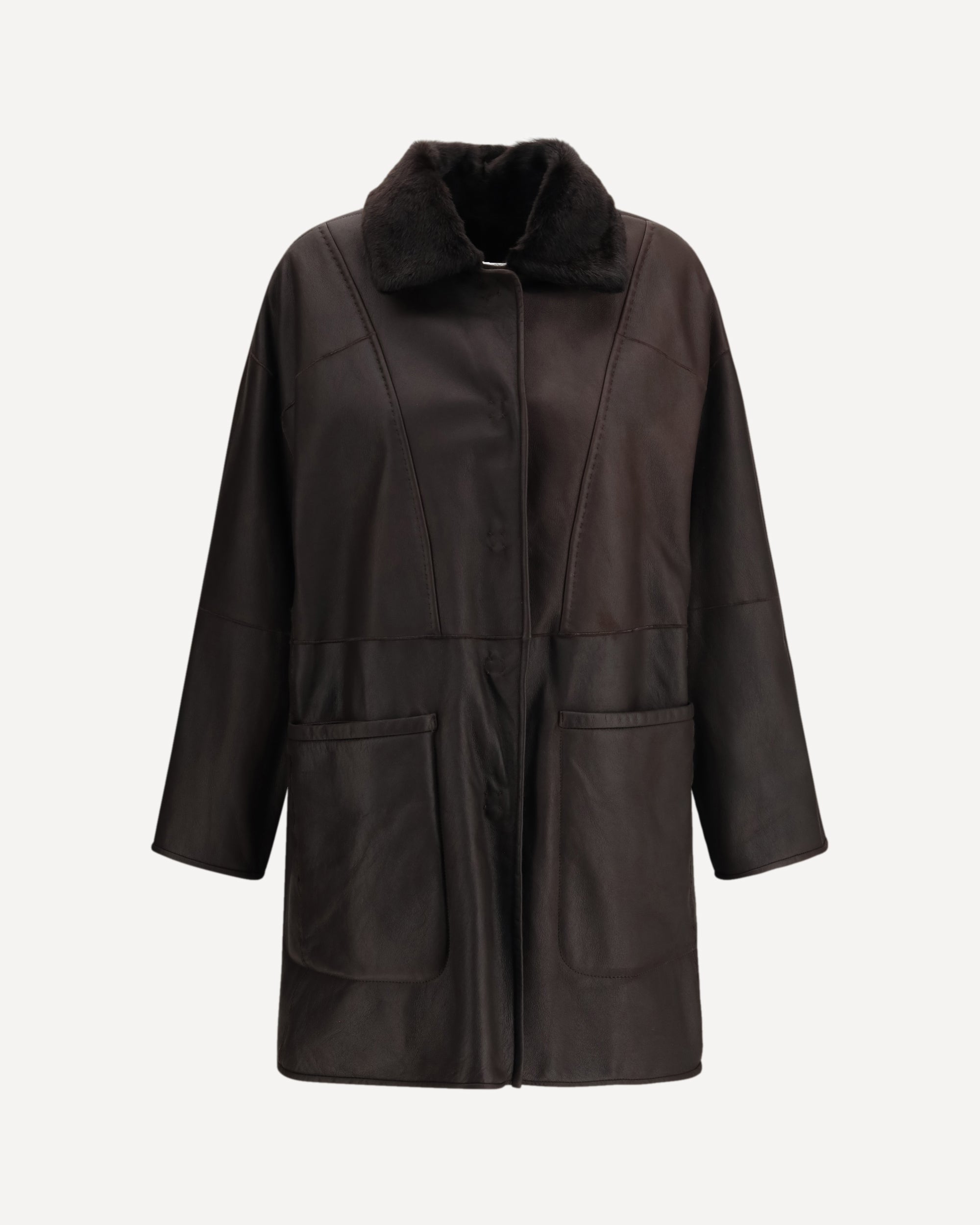 The Pirenei shearling Coat by Max Mara blends leather and camel fur in a contemporary, enveloping silhouette. Its reversible construction offers two distinct styling options in a single garment, while the dropped shoulders and long sleeves create a soft, relaxed line. Button fastening and welt “American-style” pockets add clean, functional refinement. Finished with a straight hem and presented in a solid hue, this shearling coat embodies the essential luxury and signature craftsmanship of the Maison.