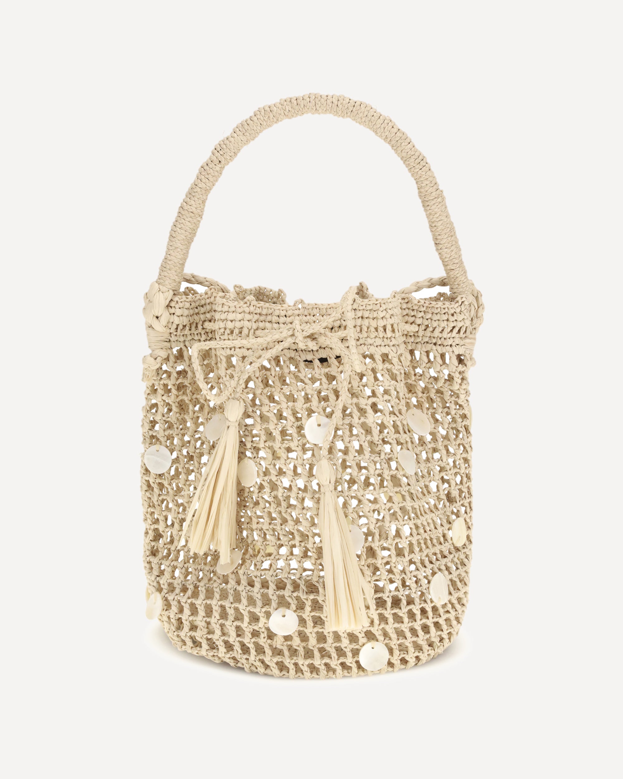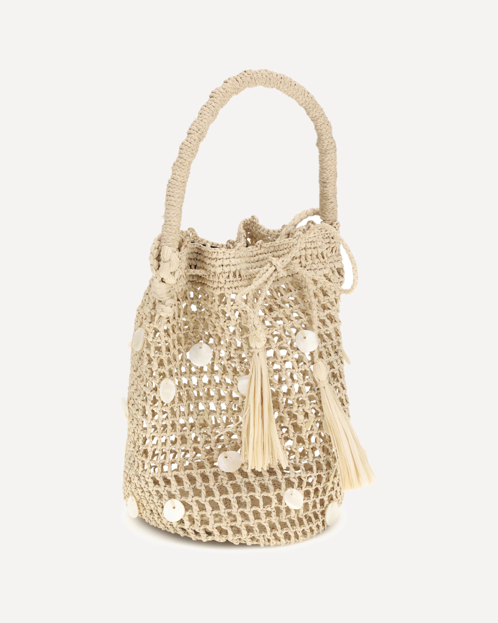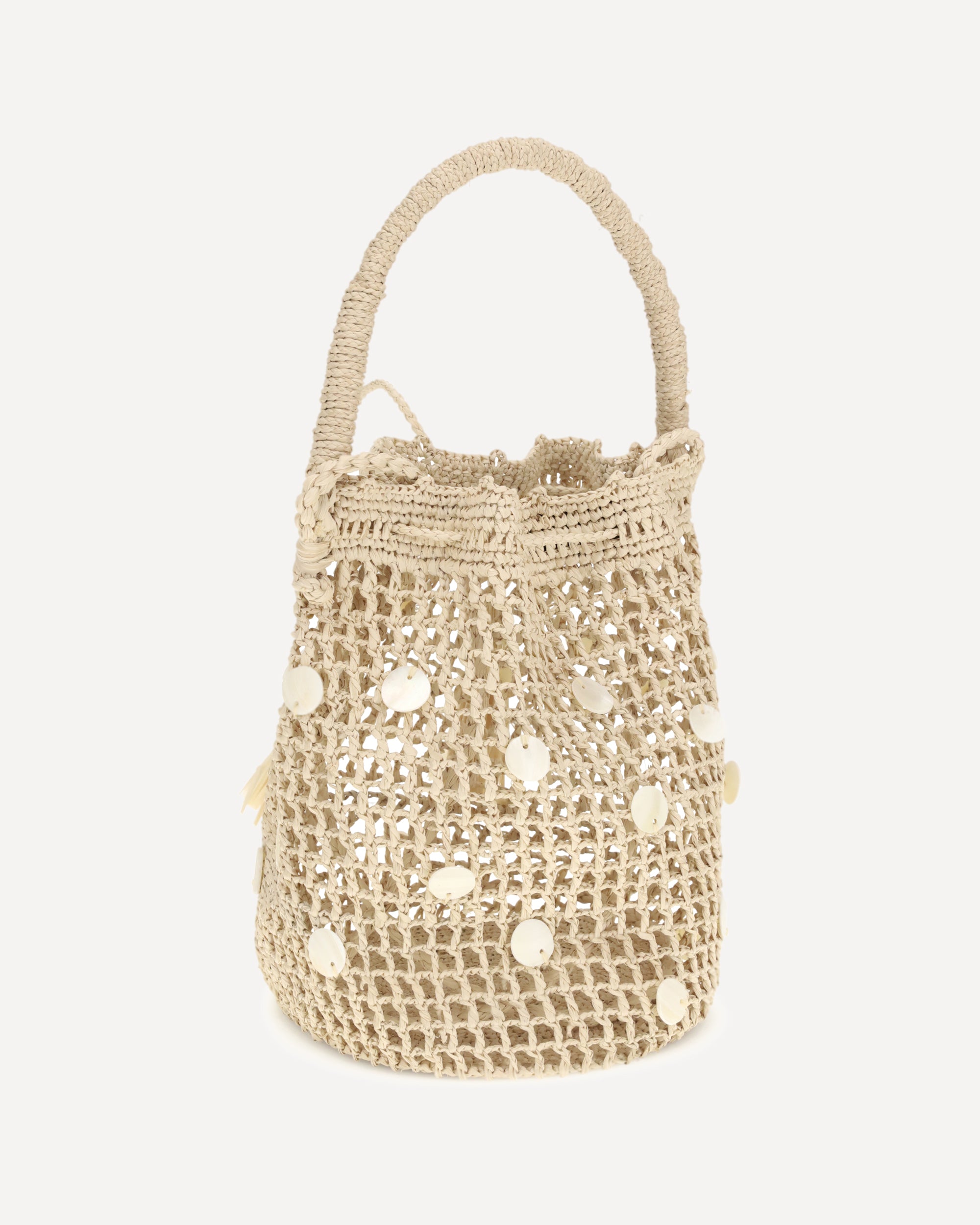 The Precious Moments Bucket Bag by Alanui is handcrafted from natural raffia and embellished with elegant mother-of-pearl details. Equipped with a handle and shoulder strap, it features a practical drawstring closure that combines functionality and style.