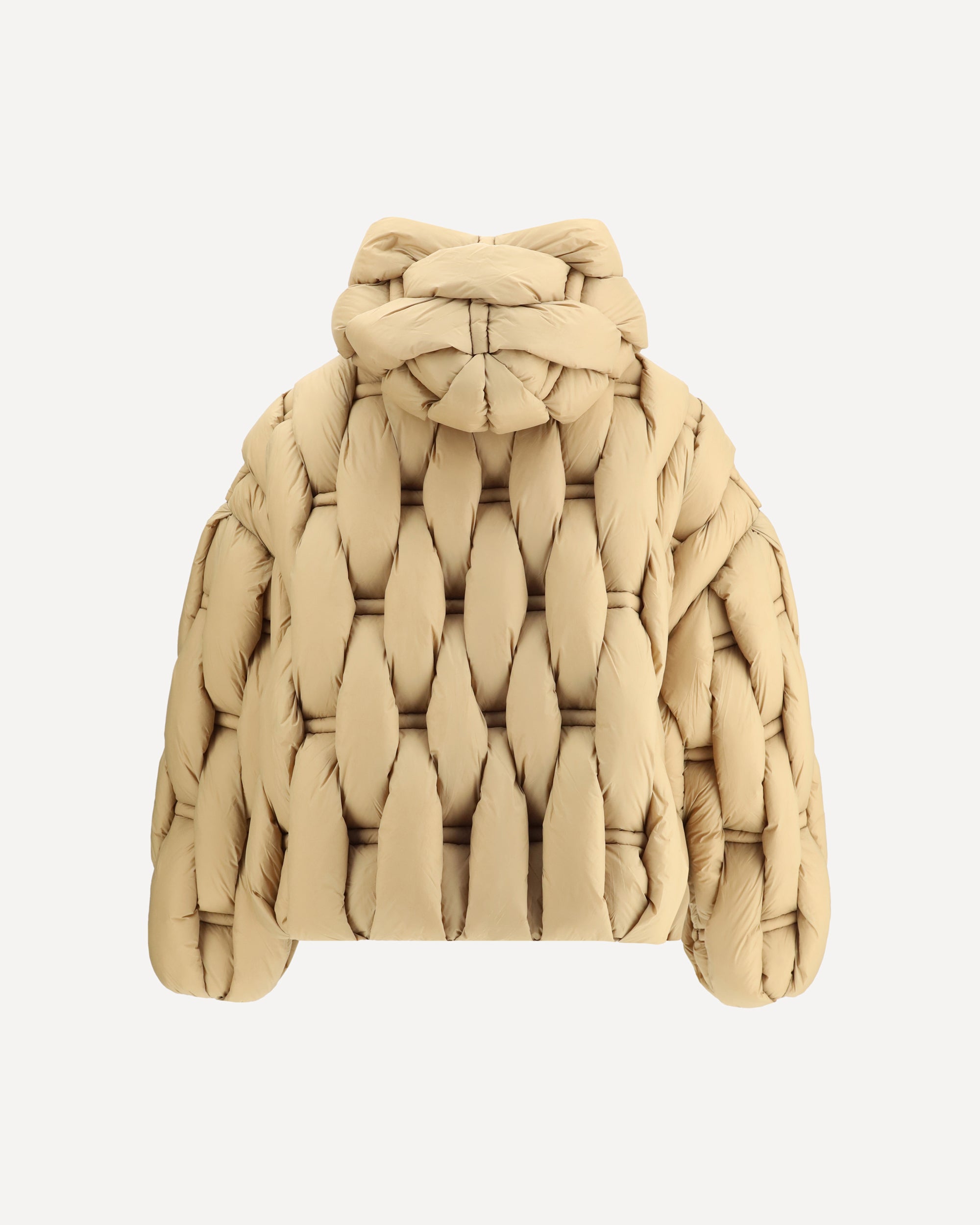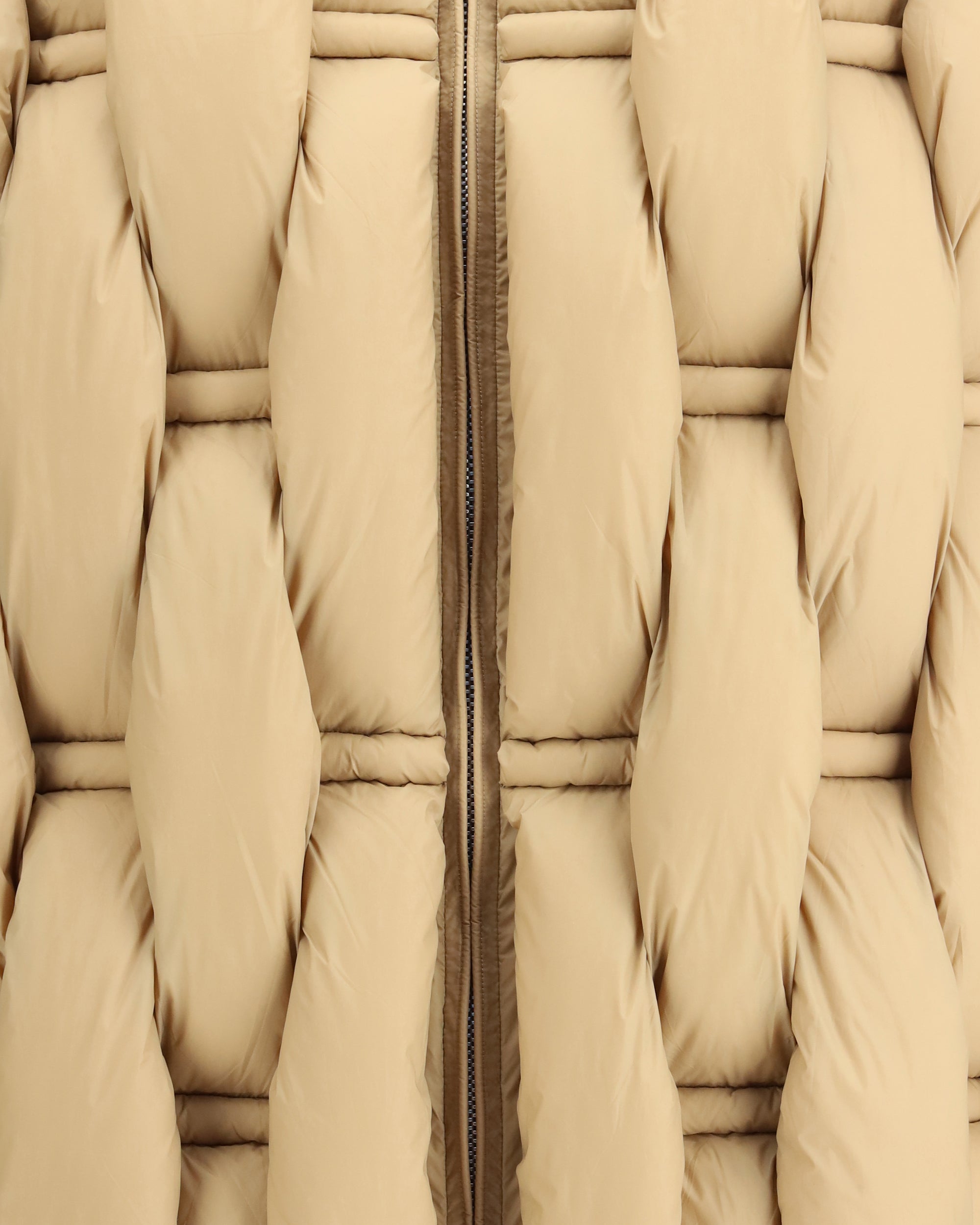 The Raxxy 3D Down Jacket is crafted in nylon with an exclusive woven three-dimensional structure, padded with premium goose down to ensure warmth and lightness. Its contemporary design is enhanced by a hood and high collar, while the front zip closure and practical side pockets highlight its functionality. Long sleeves with cuffs and dropped shoulders, along with a drawstring hem, create a modern and enveloping silhouette, perfect for facing the cold season in style.