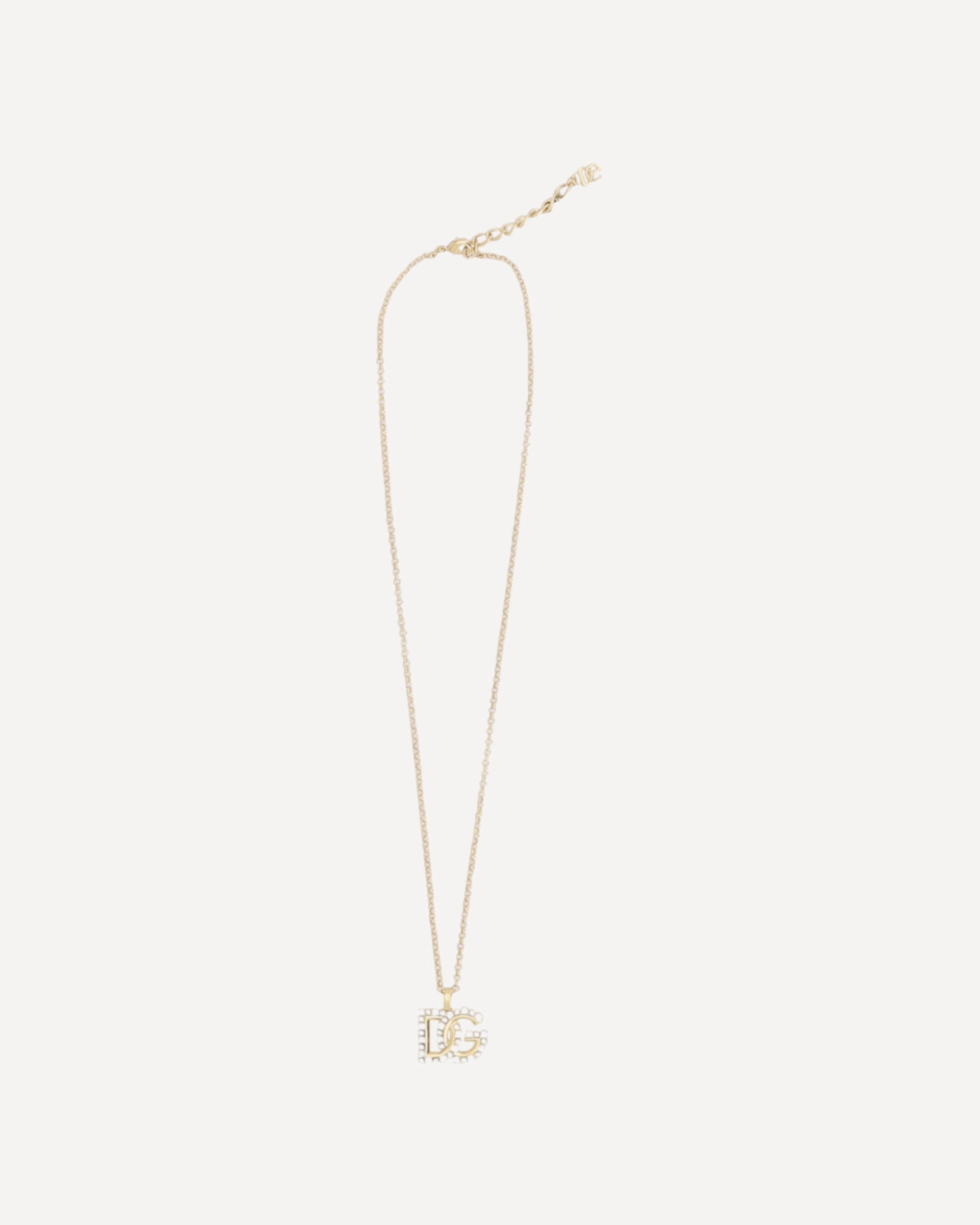 Dolce & Gabbana's Rhinestone Logo Necklace features a lobster clasp closure and a pendant with the brand's iconic logo embellished with rhinestones. The fine chain link lends a delicate and sophisticated look, making the accessory elegant and distinctive.
