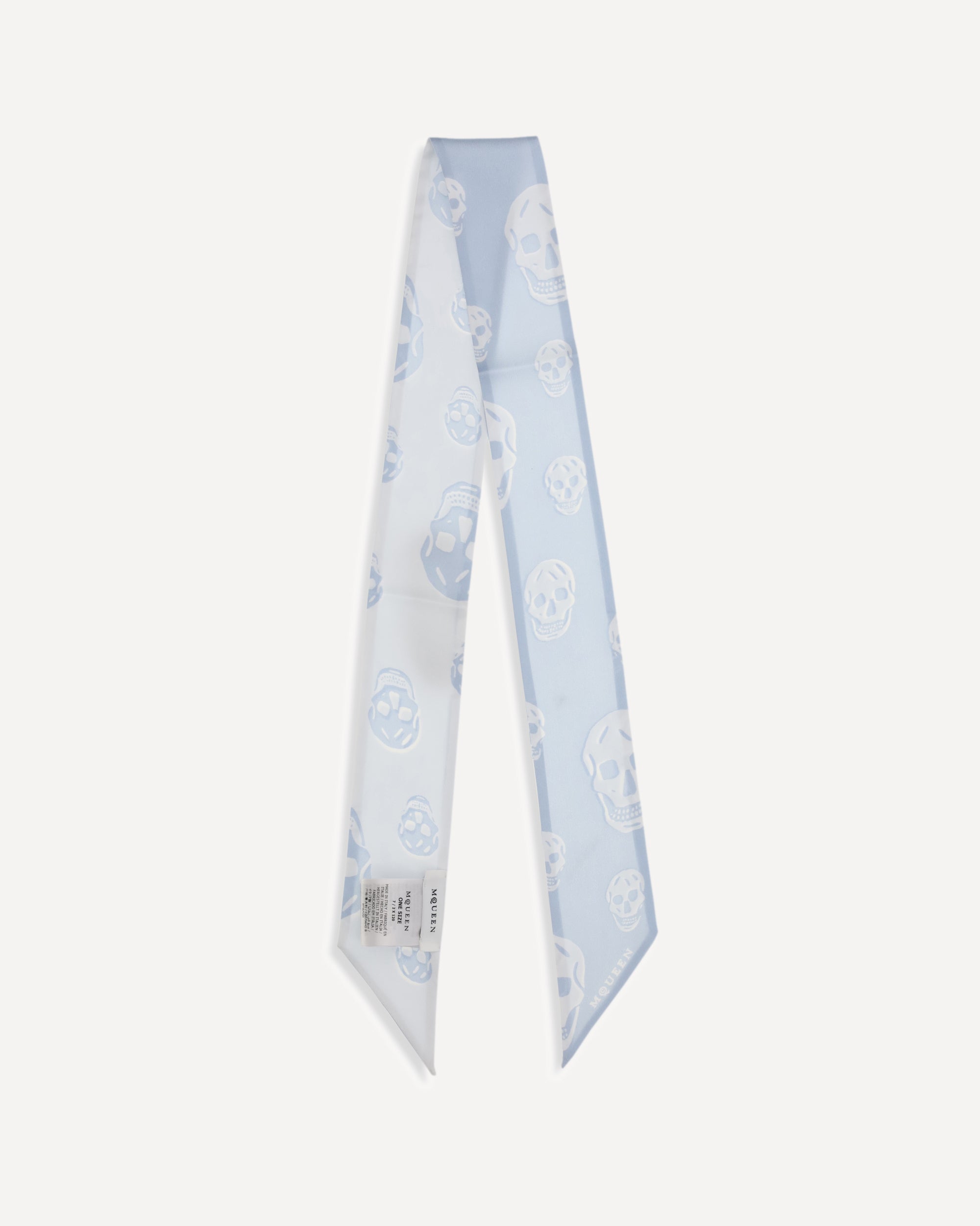 The Skull Ribbon Scarf by Alexander McQueen is made of silk twill with an all-over black and ivory Skull pattern. Finished with the McQueen logo on the bottom, it can be wrapped around the wrist or over bags from the collection, adding a distinctive and versatile touch to the look.