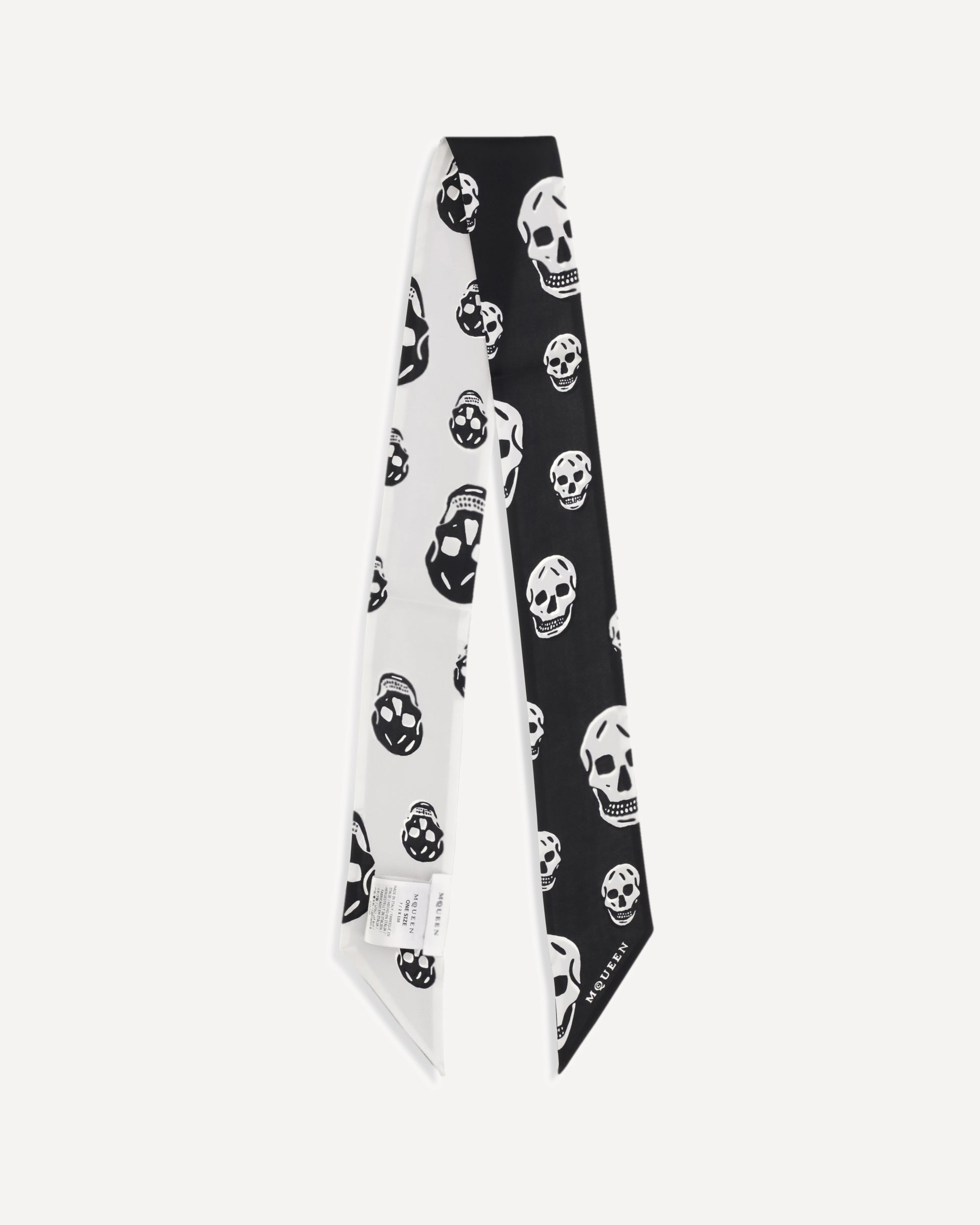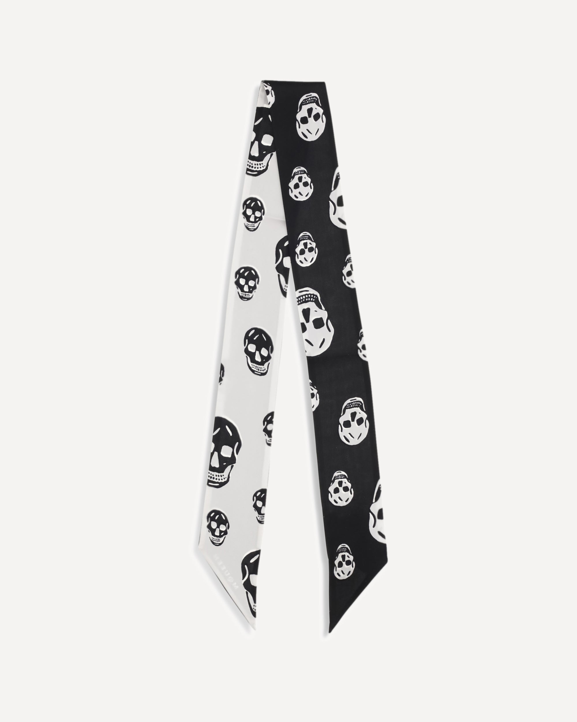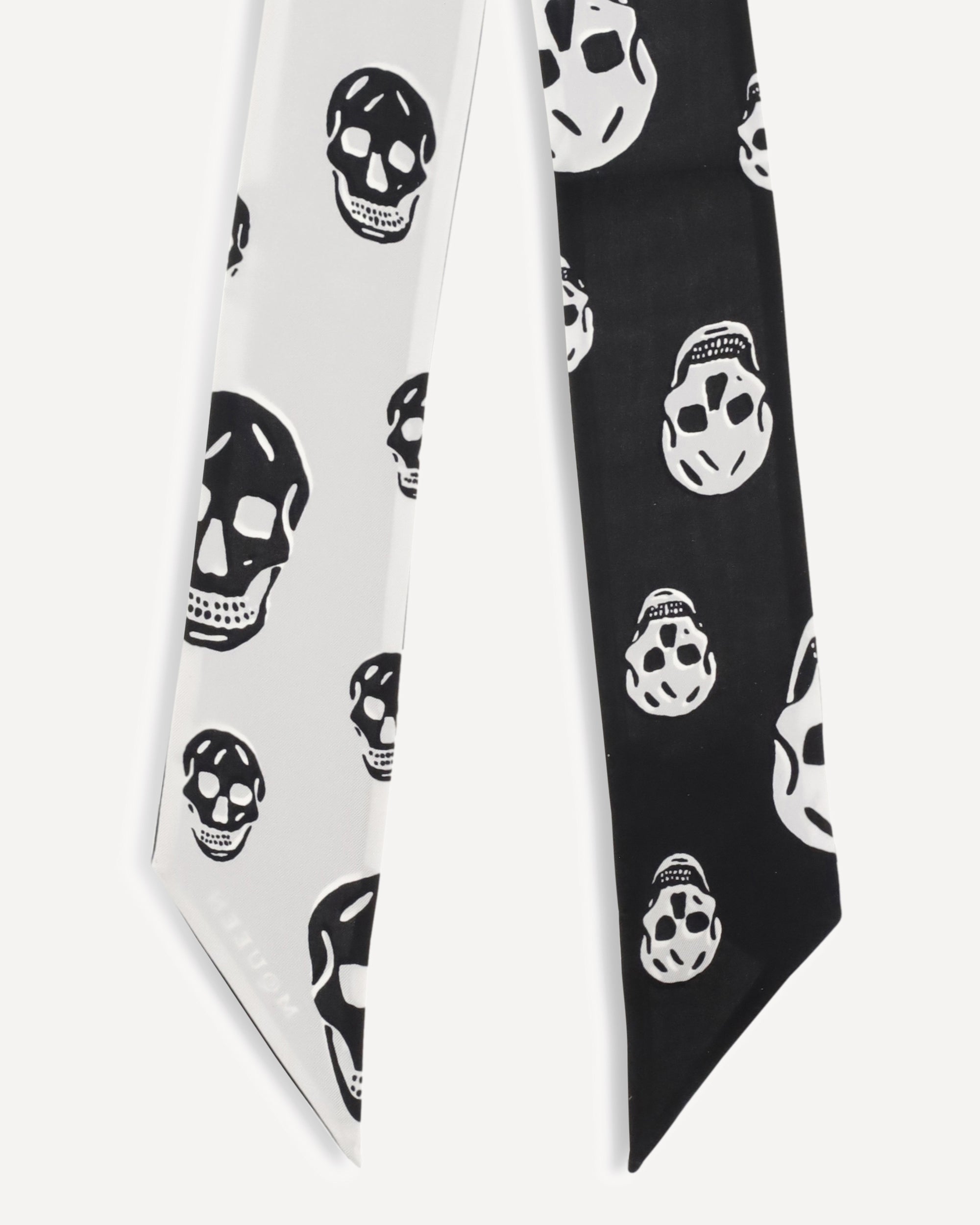 The Skull Ribbon Scarf by Alexander McQueen is made of silk twill with an all-over black and ivory Skull pattern. Finished with the McQueen logo on the bottom, it can be wrapped around the wrist or over bags from the collection, adding a distinctive and versatile touch to the look.