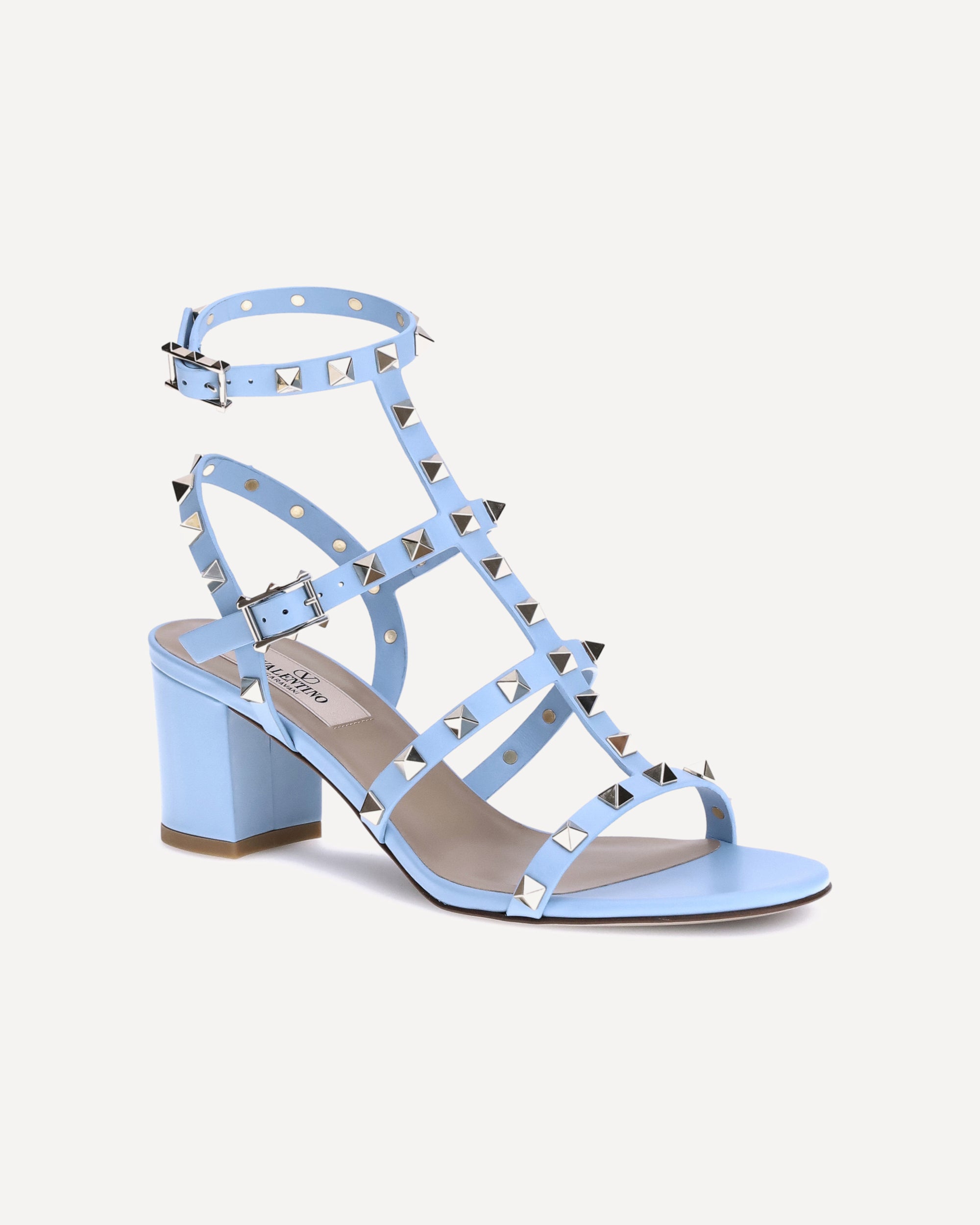 Valentino Garavani's Rockstud leather Sandals are the perfect expression of bold and sophisticated elegance. The round toe and adjustable ankle strap closure with a side buckle offer a secure and personalized fit. The chunky leather heel provides stability and comfort, while the iconic Rockstud studs applied all-over add a distinctive and bold touch, making these sandals a true style statement. The branded insole completes the design with a luxurious detail.