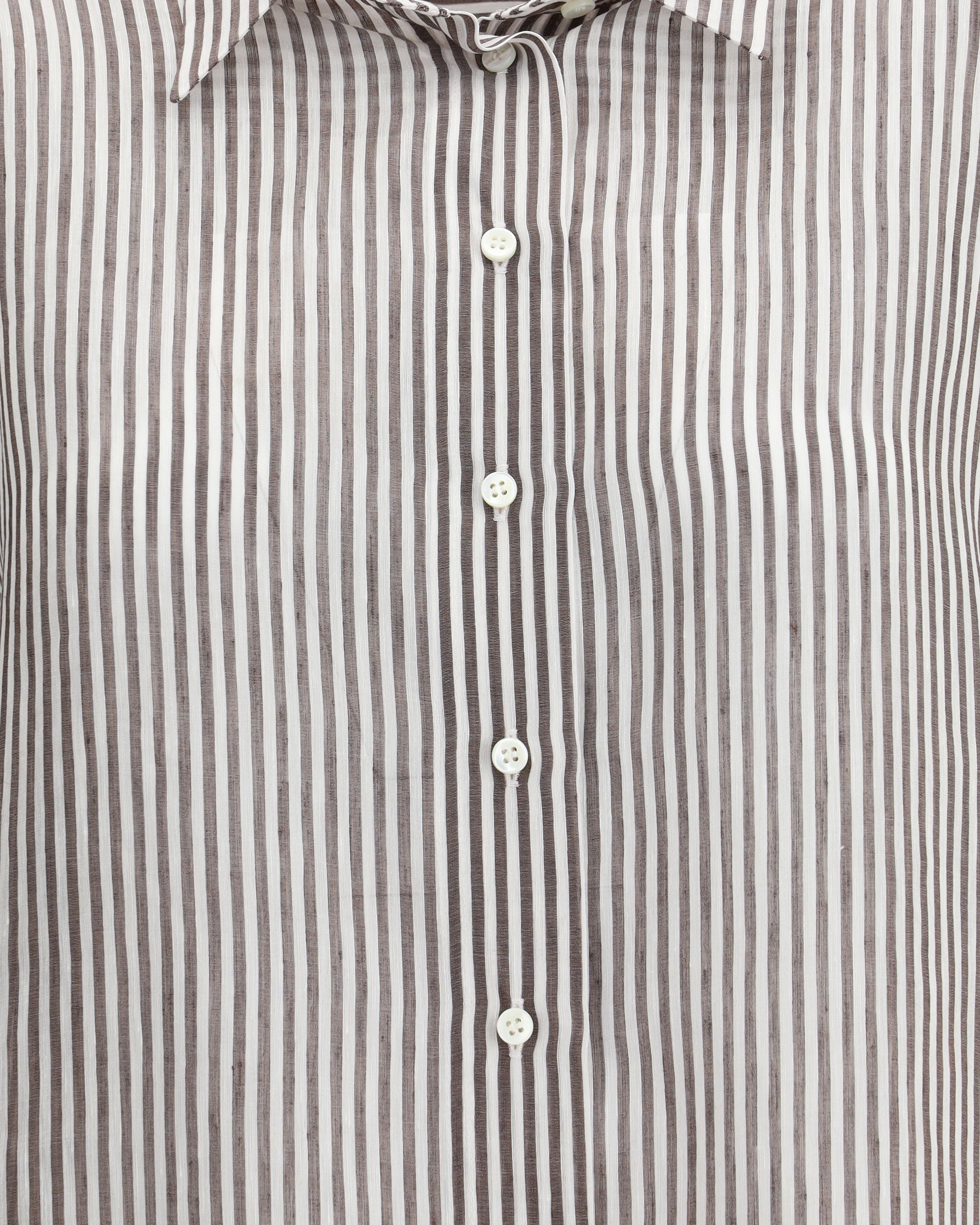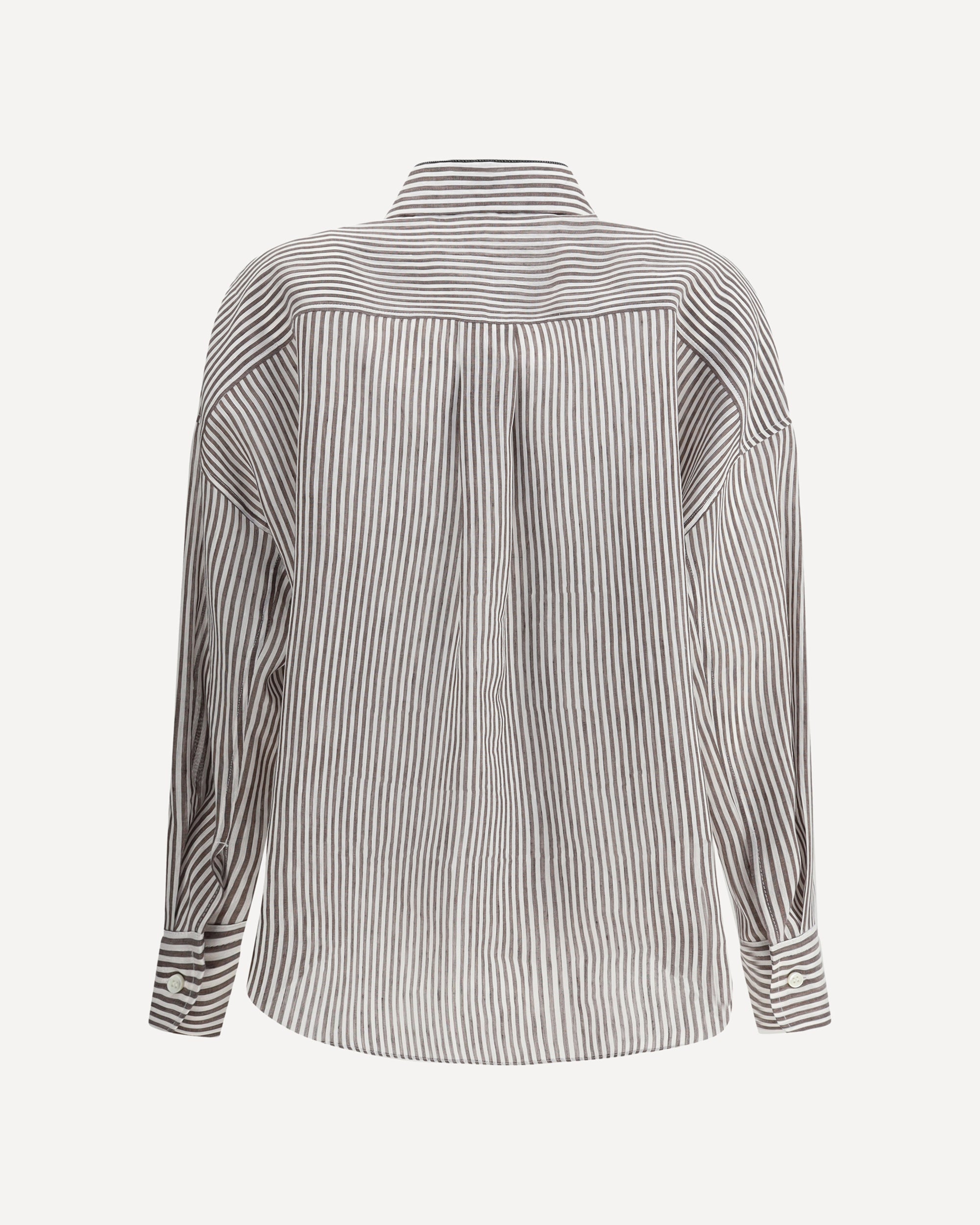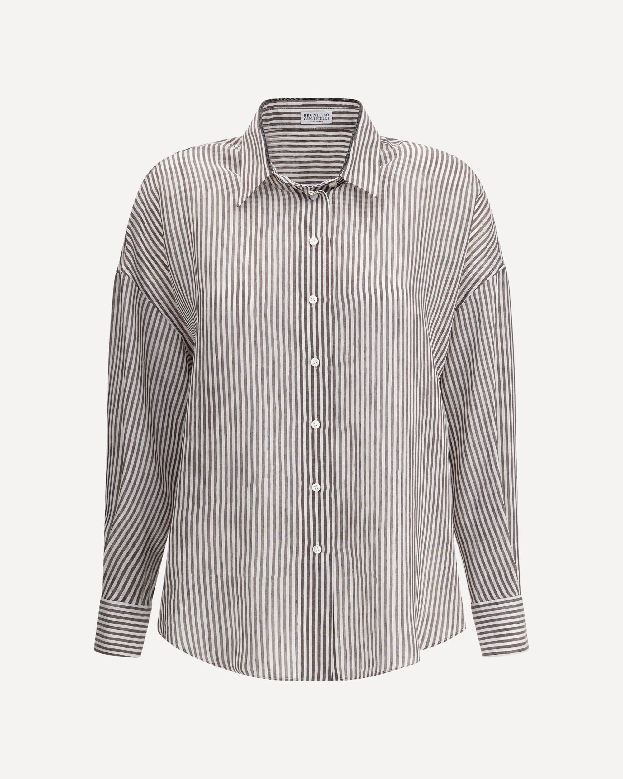 Brunello Cucinelli's Striped Shirt is a refined garment that plays with elegance and transparency. Featuring a classic collar embellished with the iconic shiny jewel detail, it has a front button closure and a semi-transparent design that lends lightness and sophistication to the look.