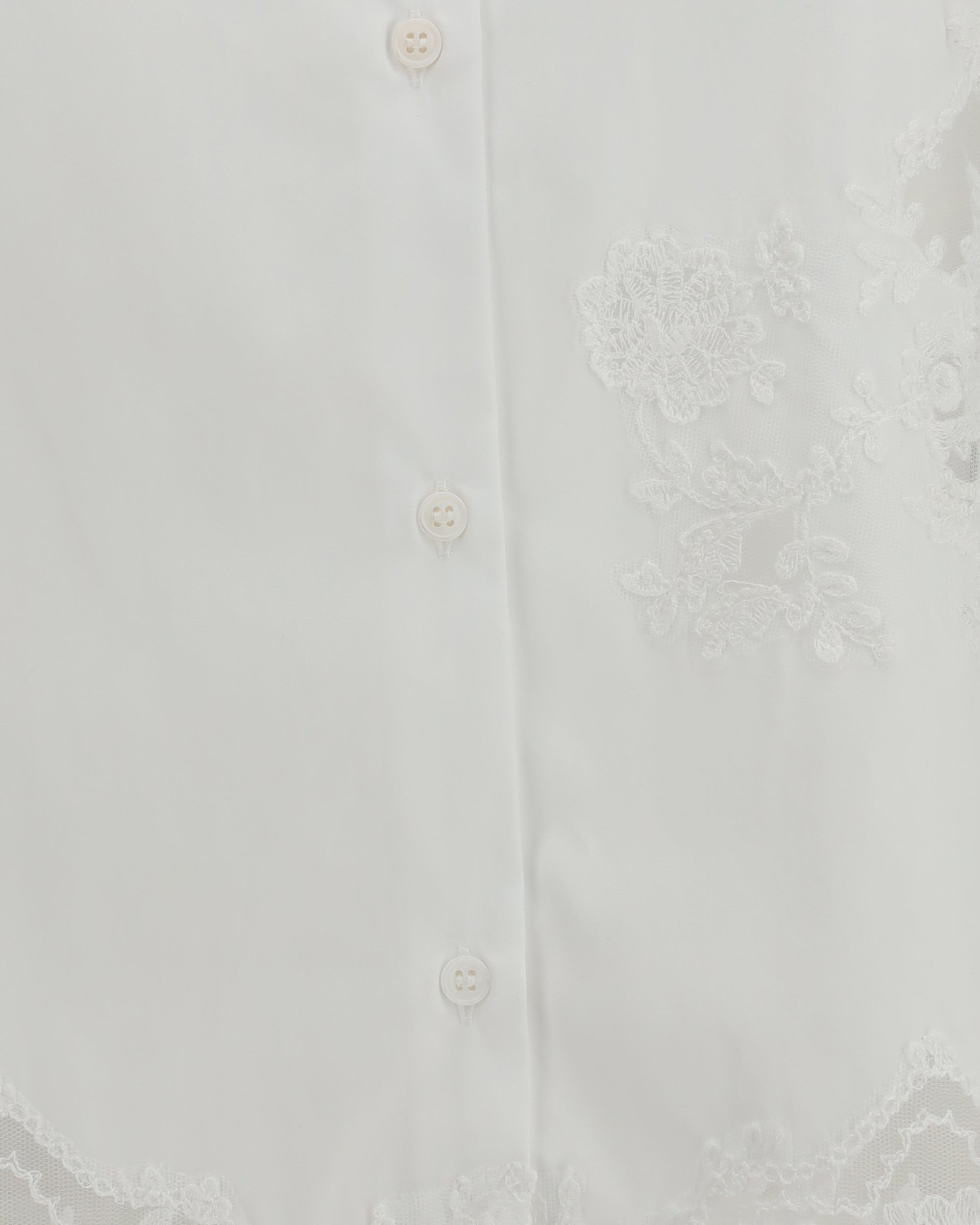 The cotton Shirt with lace detail by Ermanno Scervino conveys refined elegance with a couture-inspired touch. Crafted from cotton poplin, it features a tulle insert with exclusive floral and geometric lace, hand-placed to highlight the craftsmanship of the design. Long sleeves with buttoned cuffs complement the relaxed, wide fit, while the scalloped hem and front button fastening complete the piece with delicate, contemporary femininity.