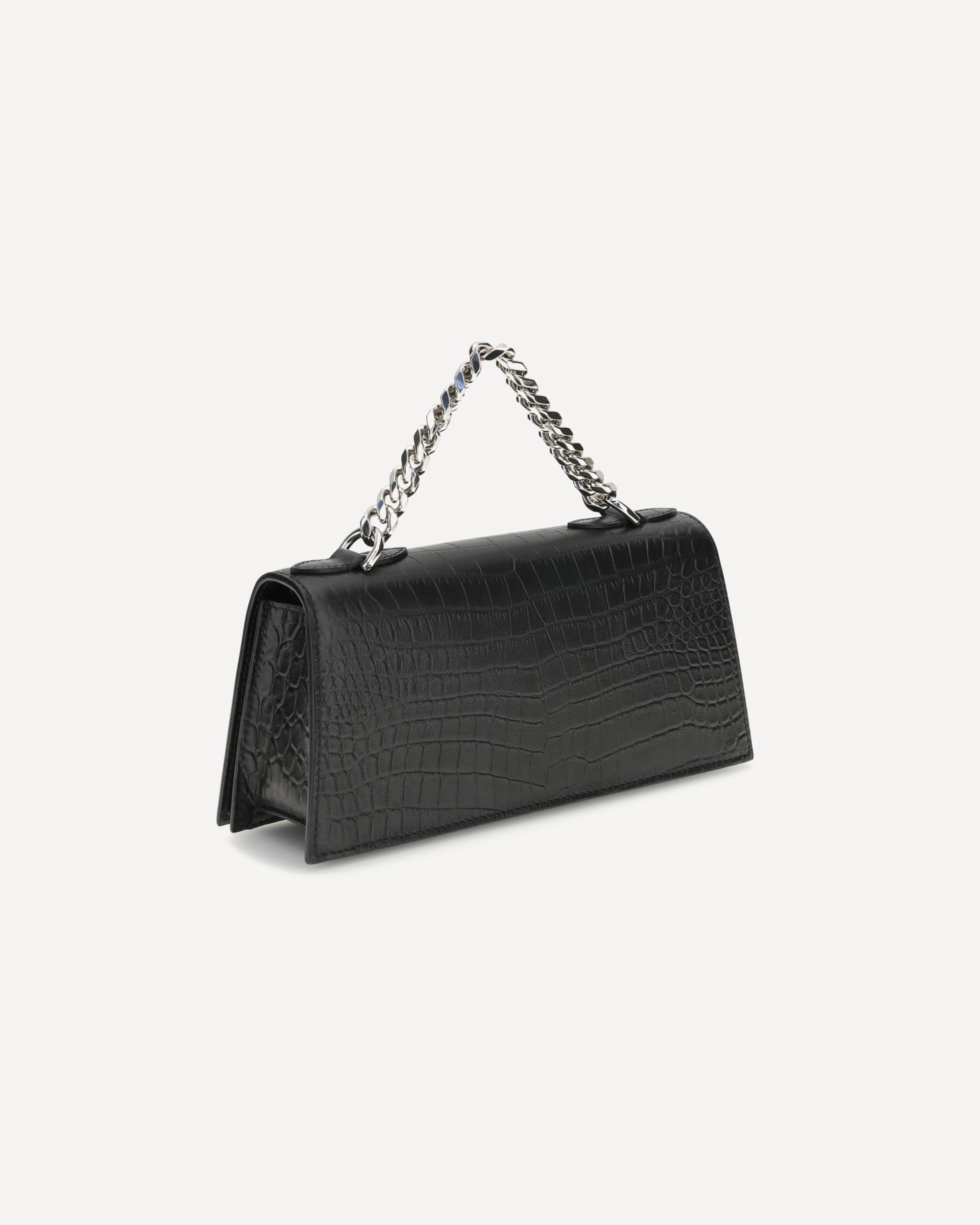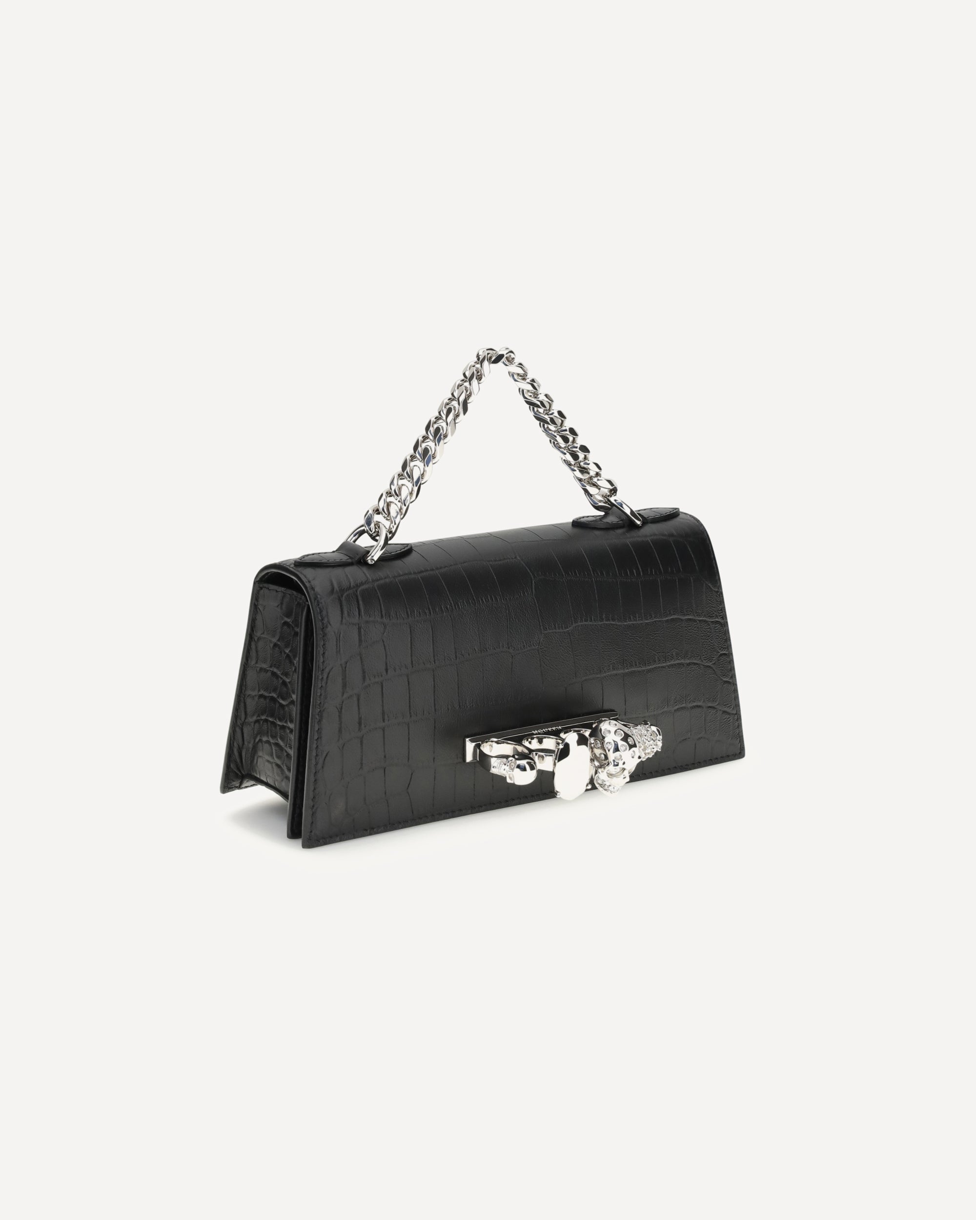 The Jeweled mini Shoulder Bag by Alexander McQueen is an elegant accessory featuring the iconic silver-tone Knuckle hardware and distinctive chain. It features a main compartment and an internal card slot, while the adjustable and removable leather shoulder strap and magnetic closure combine practicality and refined style in a compact and sophisticated design.