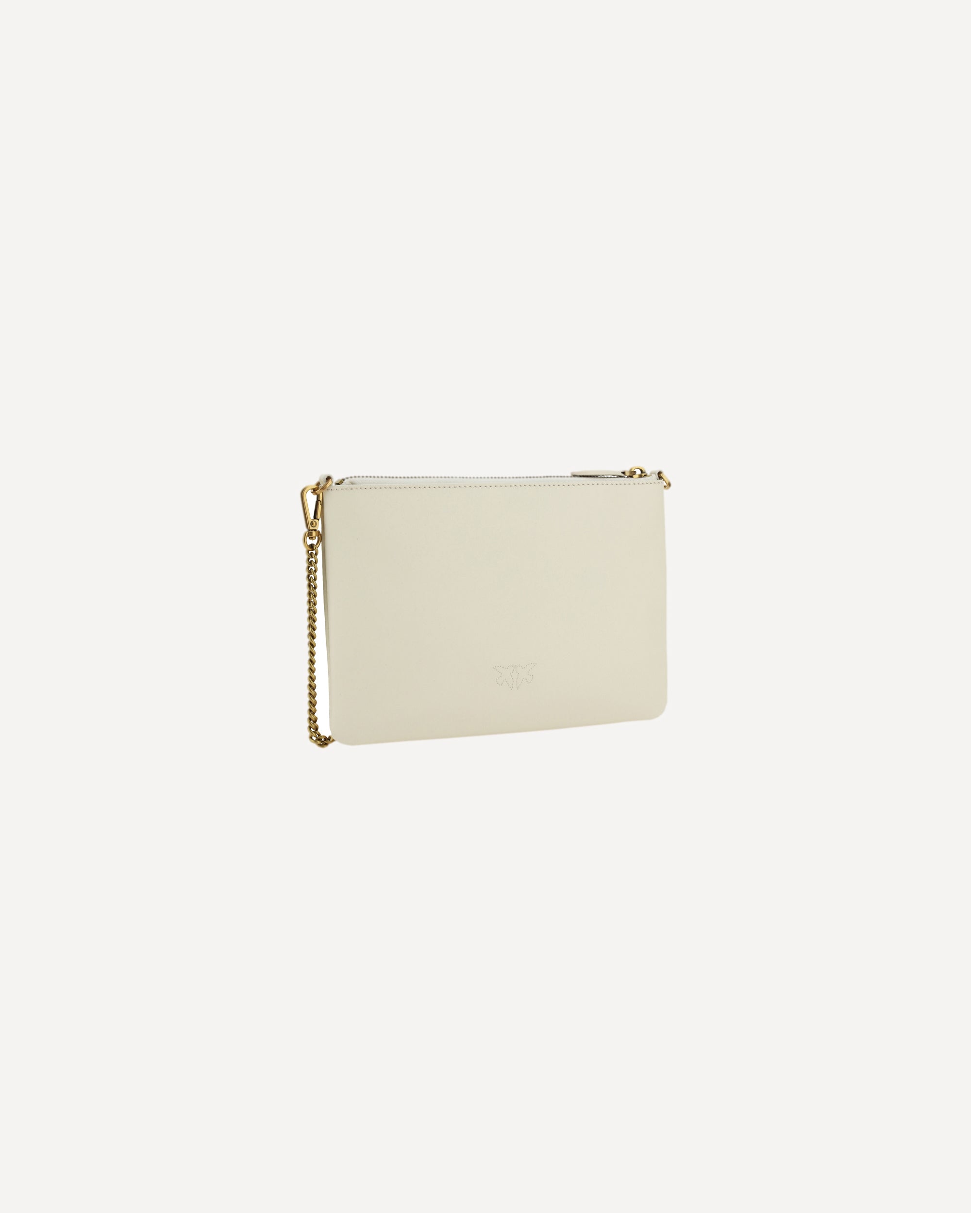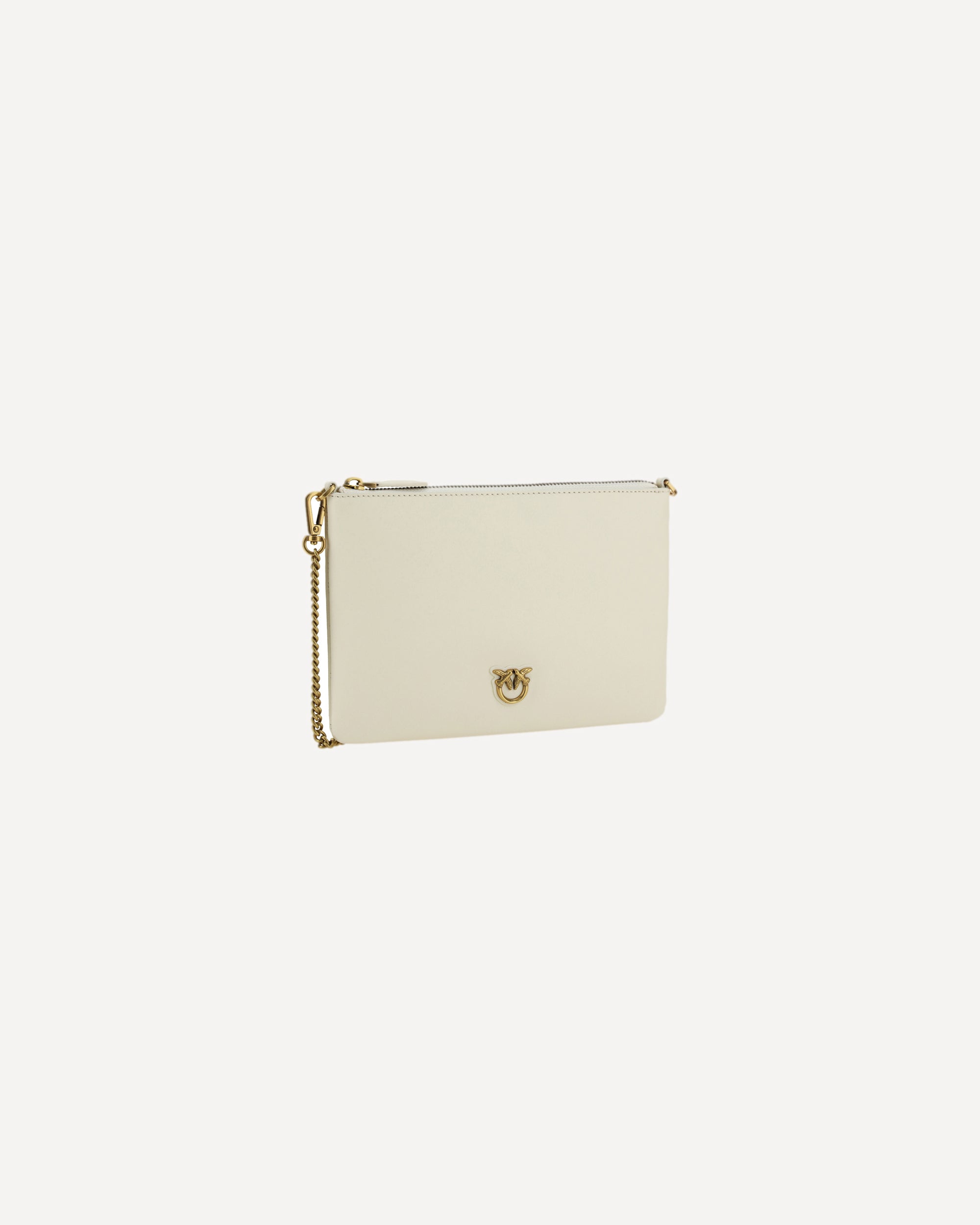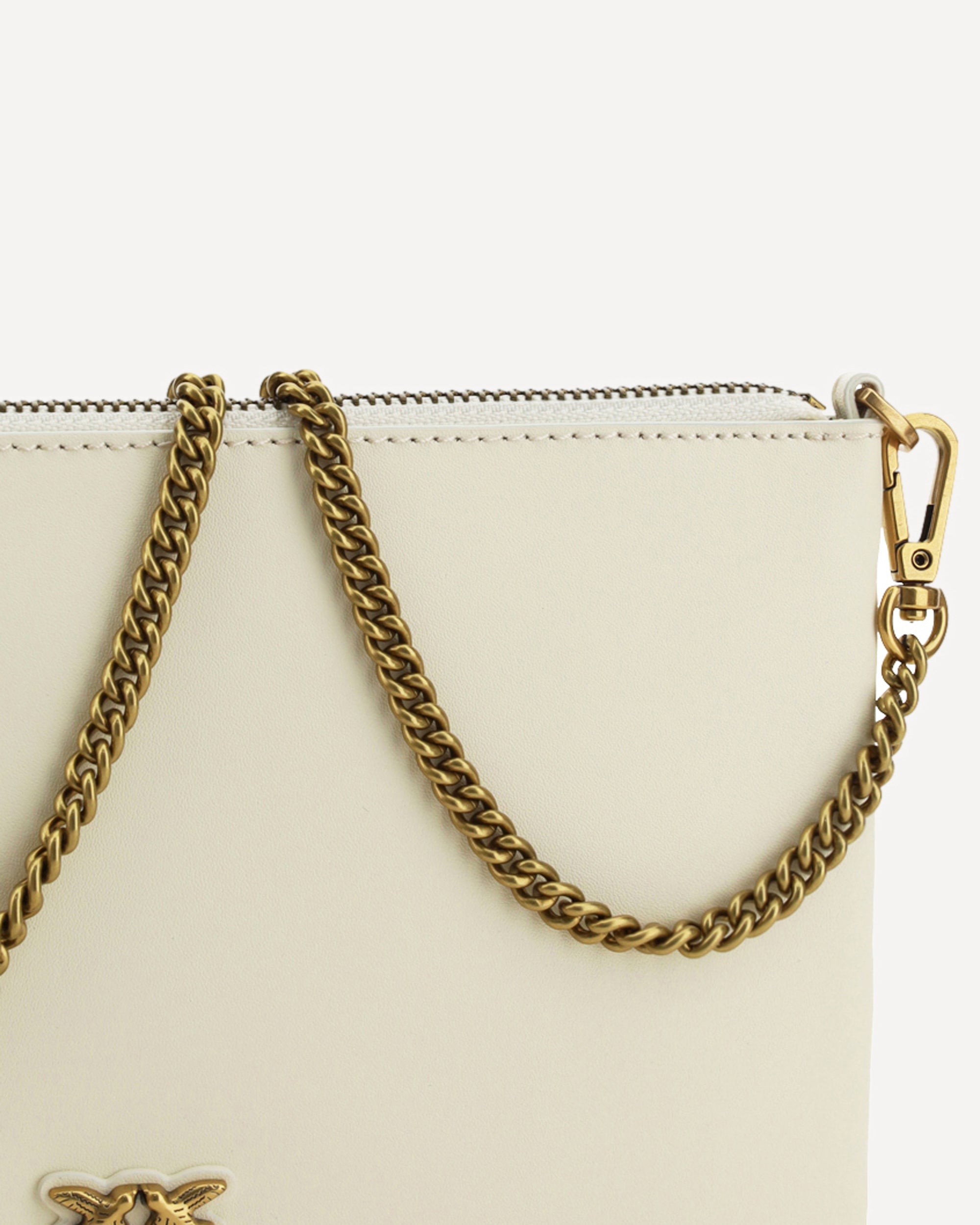 The leather Shoulder Bag by Pinko features a compact and functional design with a top zipper closure and iconic gold-plated Love Birds plaque embossed on the front. The interior offers a single compartment, while a tone-on-tone embroidered monogram stands out on the back. The chain shoulder strap completes the model, combining practicality and elegance.