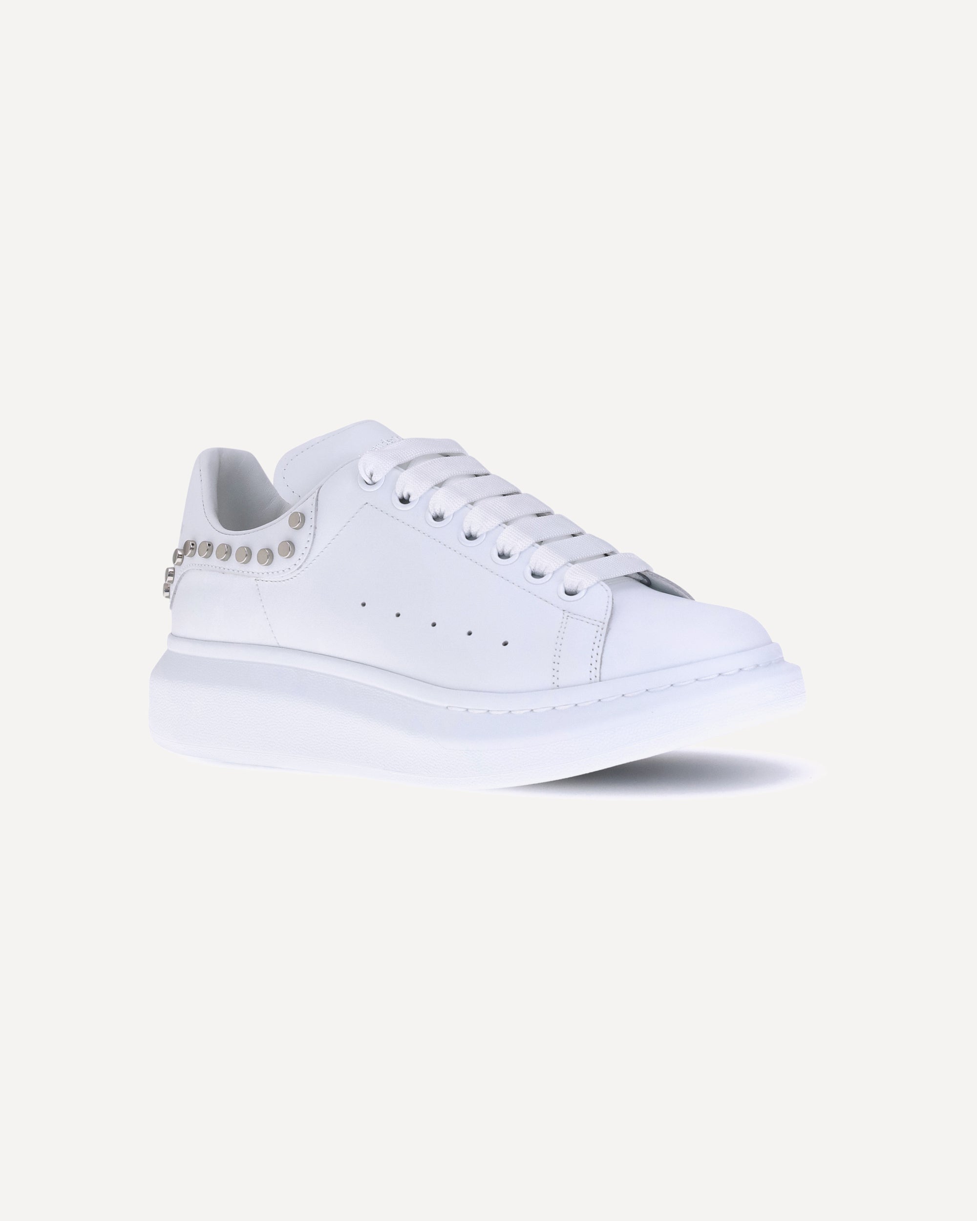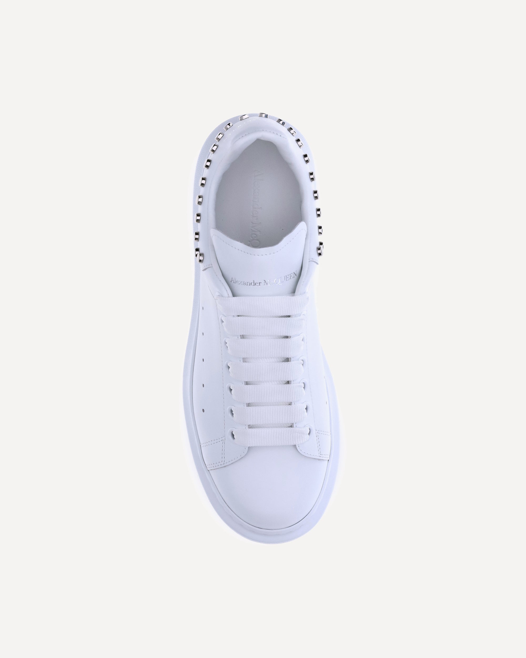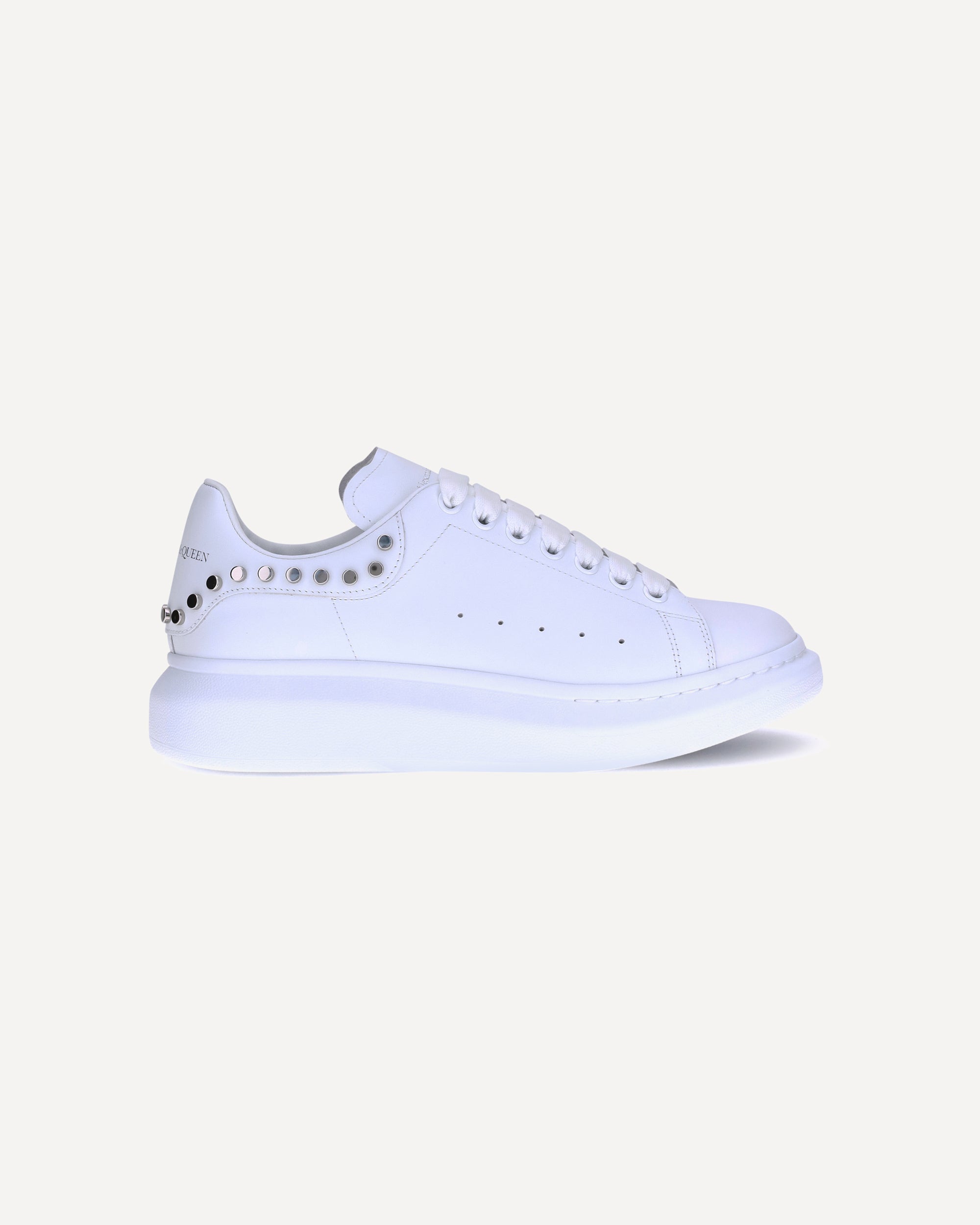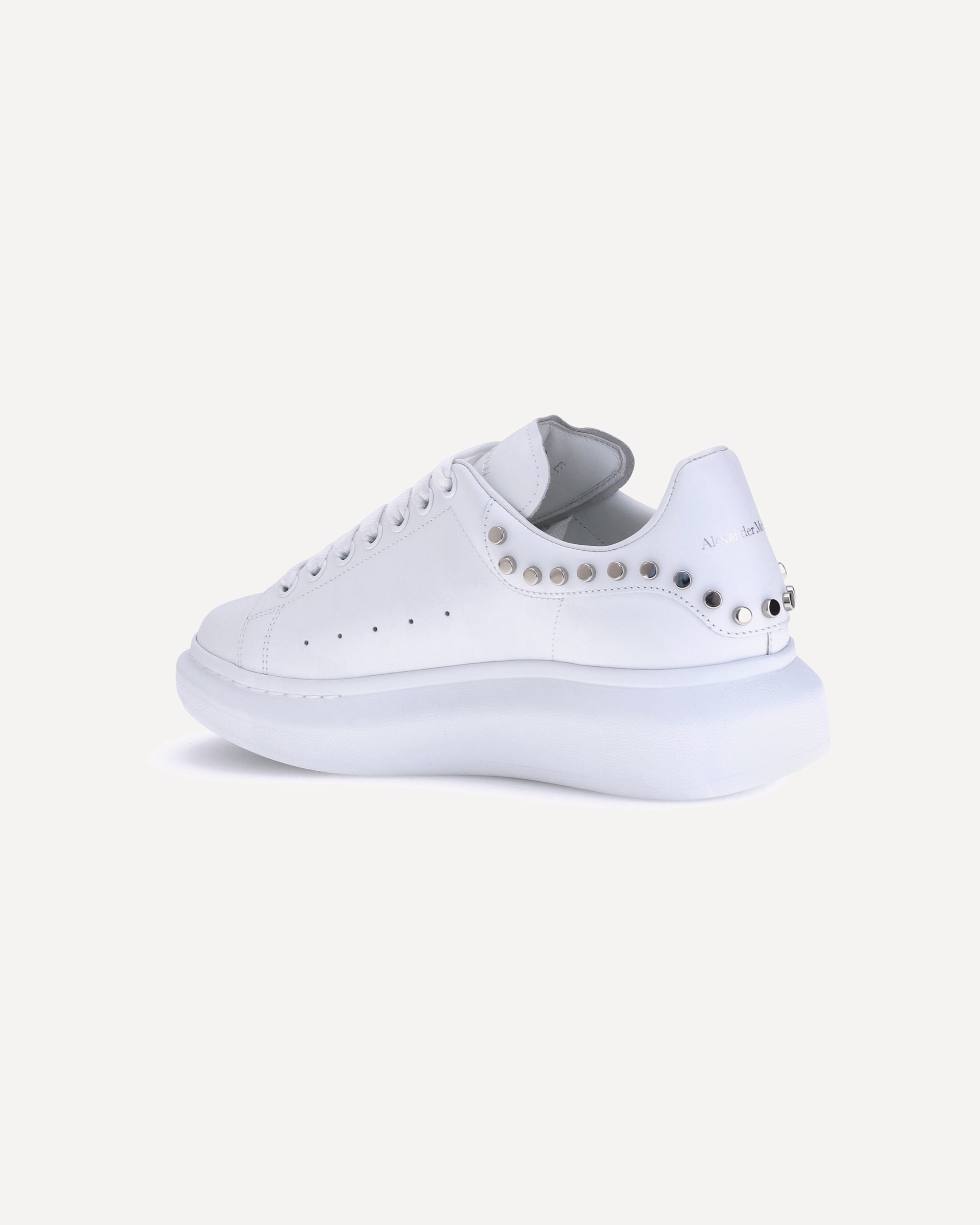 Alexander McQueen's Leather Sneakers are a distinctive piece that combines elegance and boldness in a contemporary design. They feature a front lace-up closure for a comfortable and adjustable fit, while the round toe ensures a classic and versatile look. The press-studded logoed front tab and contrasting logoed heel label add iconic details that recall the brand's authenticity. Another detail are the studs applied on the heel, giving a gritty touch. The platform sole not only gives added height, but also adds a modern and bold touch to the design.