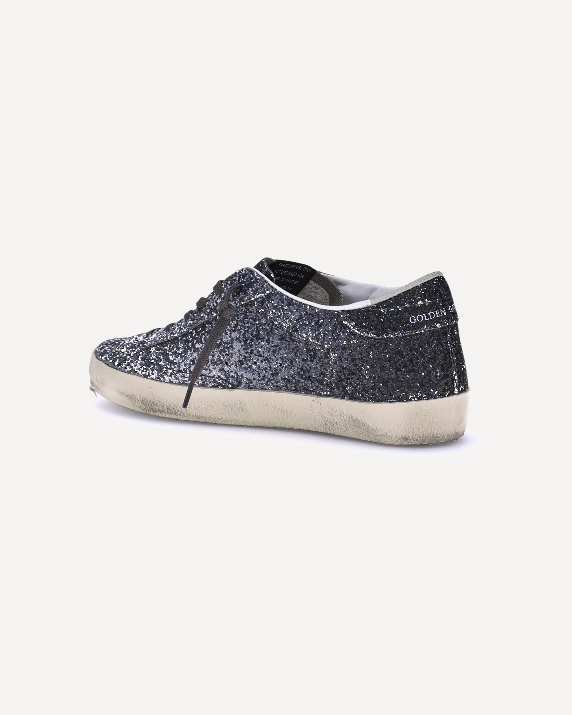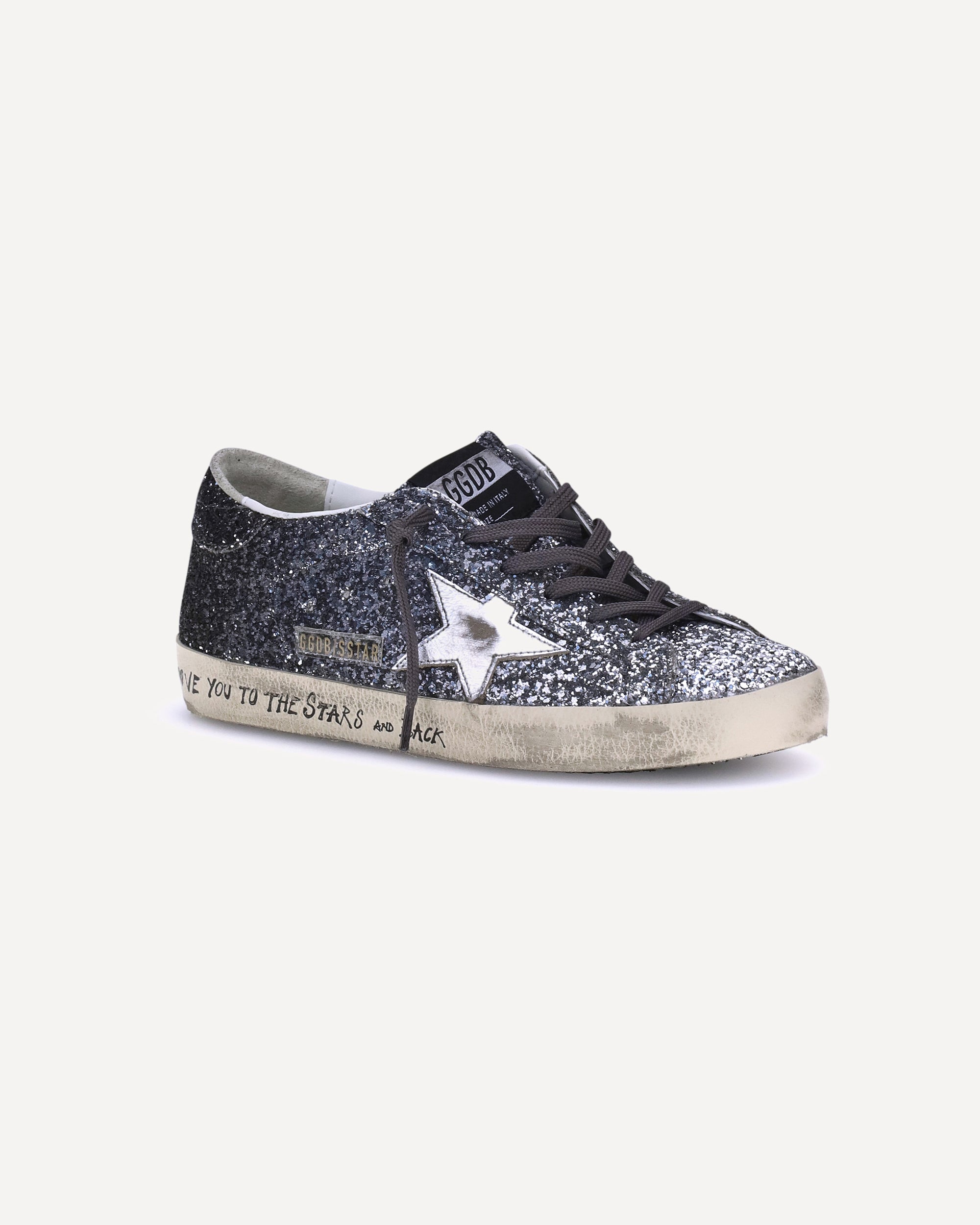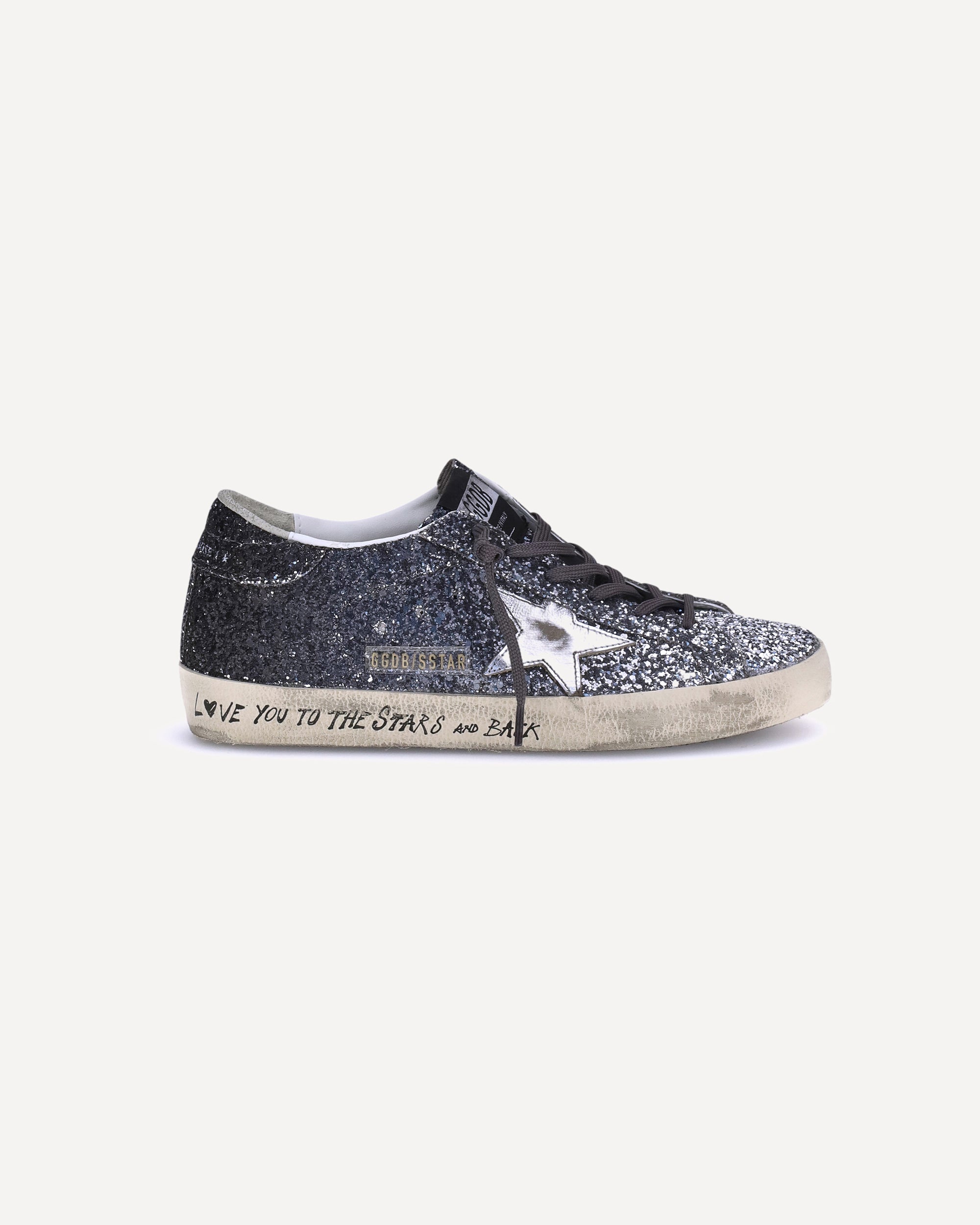 Golden Goose's Super Star Leather Glitter Sneakers combine simplicity and elegance with iconic details. Featuring a classic silhouette with a round toe and front lace-up closure, they offer comfort and versatility with a flat sole. The iconic contrasting star on the side panel, along with the brand's press-stud logo on the tongue and outer side, makes this style instantly recognizable. Rhinestones add a bright and glamorous touch, perfect for standing out in style.