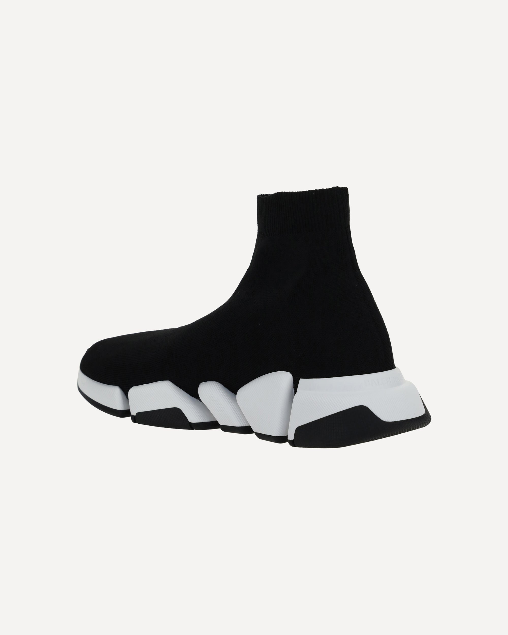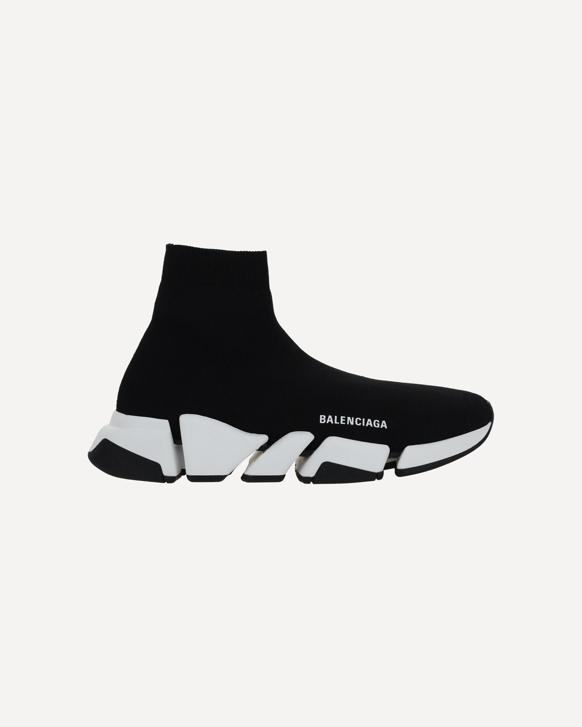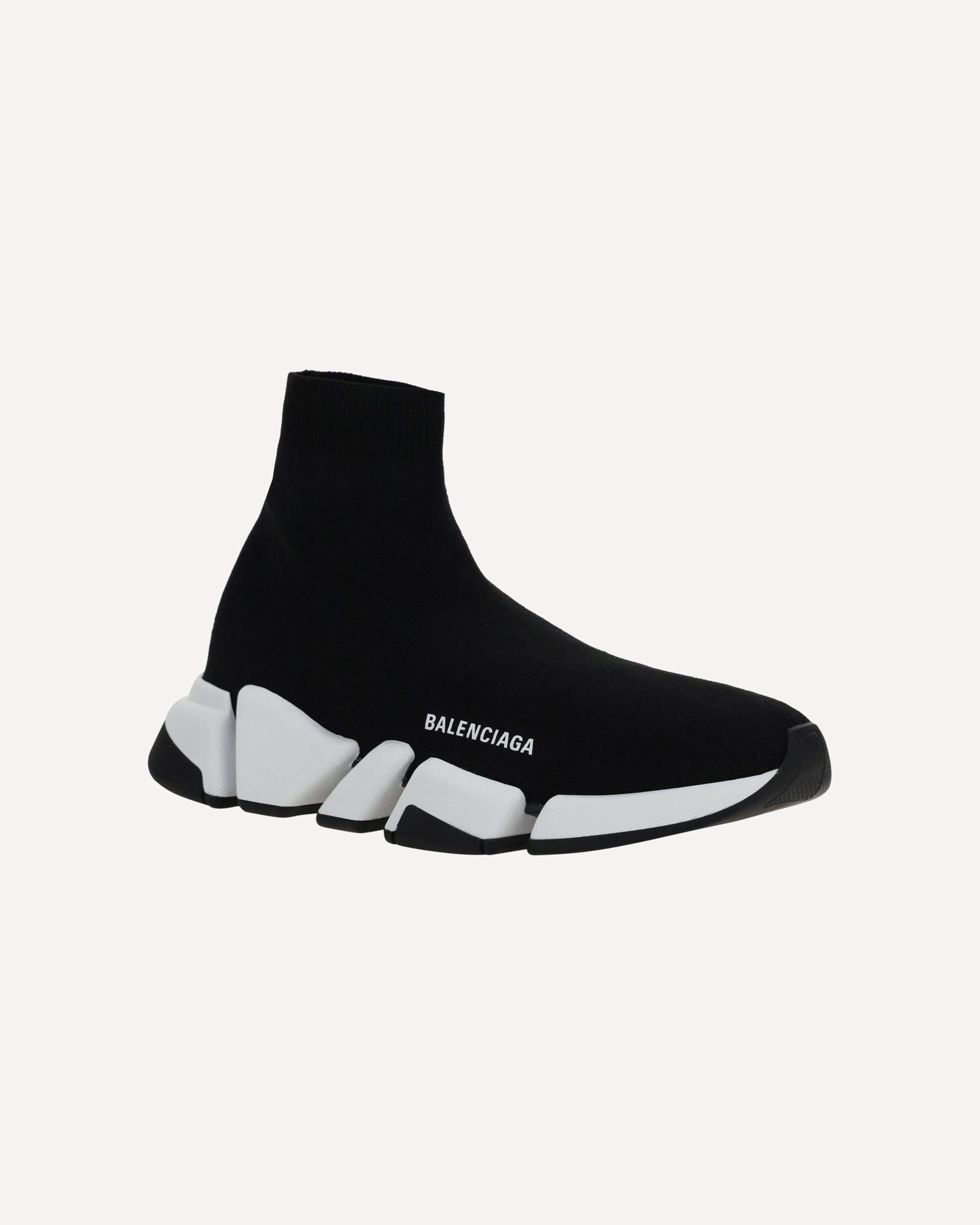 The Speed Sneakers by Balenciaga feature a sock-like design with an elongated toe and a ribbed ankle cuff for snug comfort. The contrasting logo on the outer side lends a distinctive touch, while the notched sole ensures grip and a gritty look, perfect for contemporary, dynamic style.