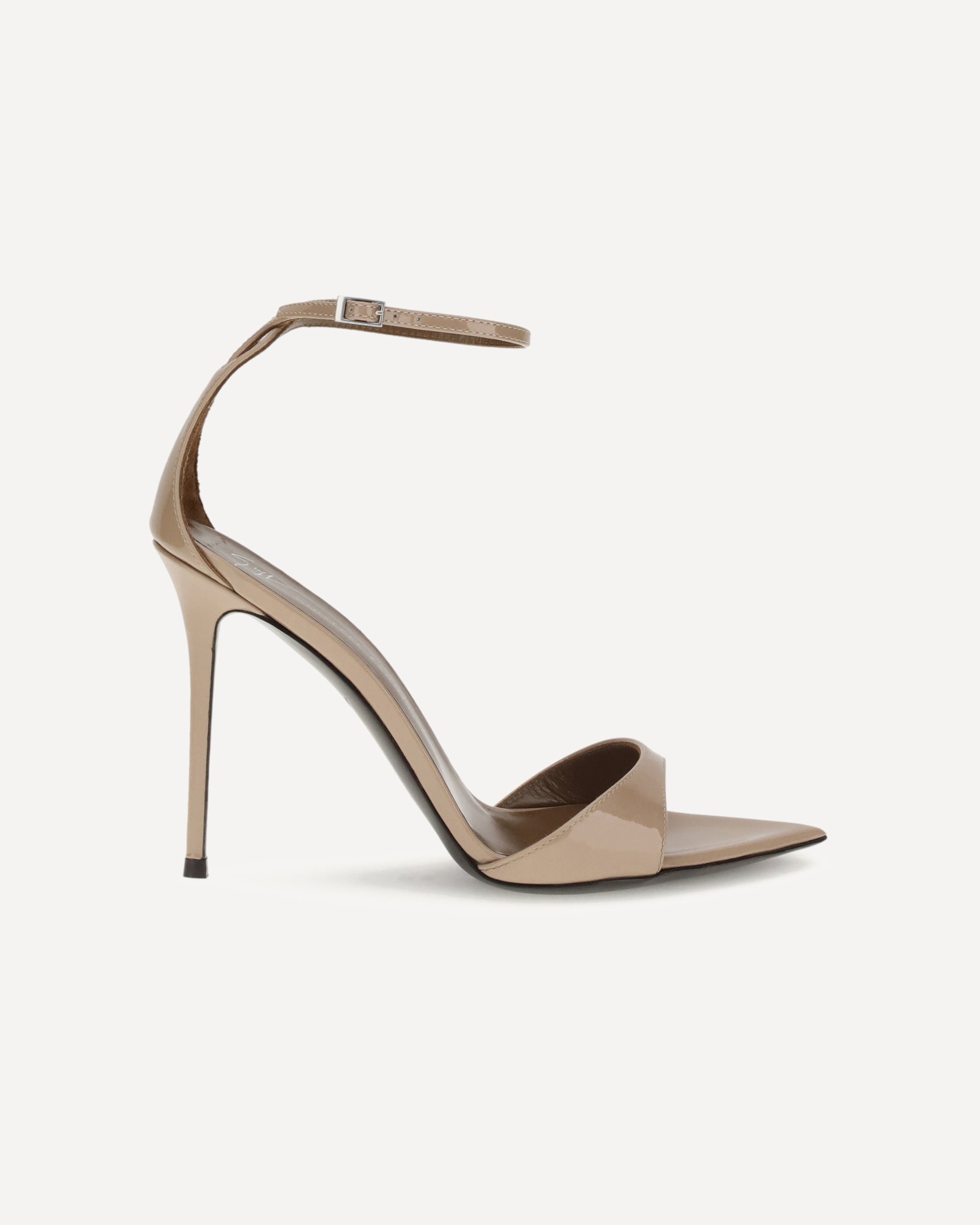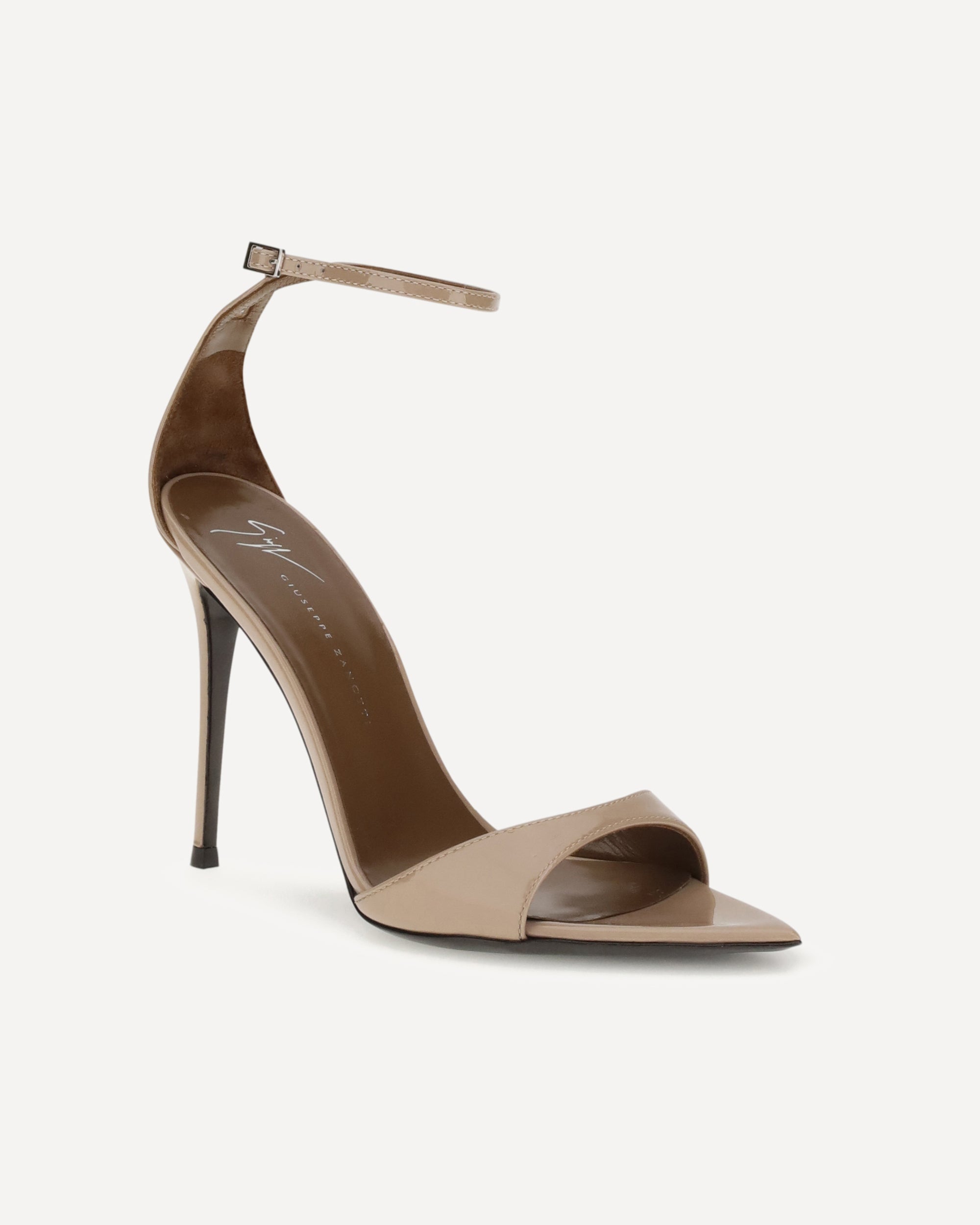 Giuseppe Zanotti's Intriigo Strap Sandals combine sensuality and modernity in a bold design. Crafted from patent leather, they feature a pointed open-toe silhouette that enhances the shape of the foot. The silver-tone metal strap lends a bright, contemporary touch, while the stiletto heel elegantly slims. Completed with a logo-embossed insole, these sandals are perfect for sophisticated evening looks with a bold style.