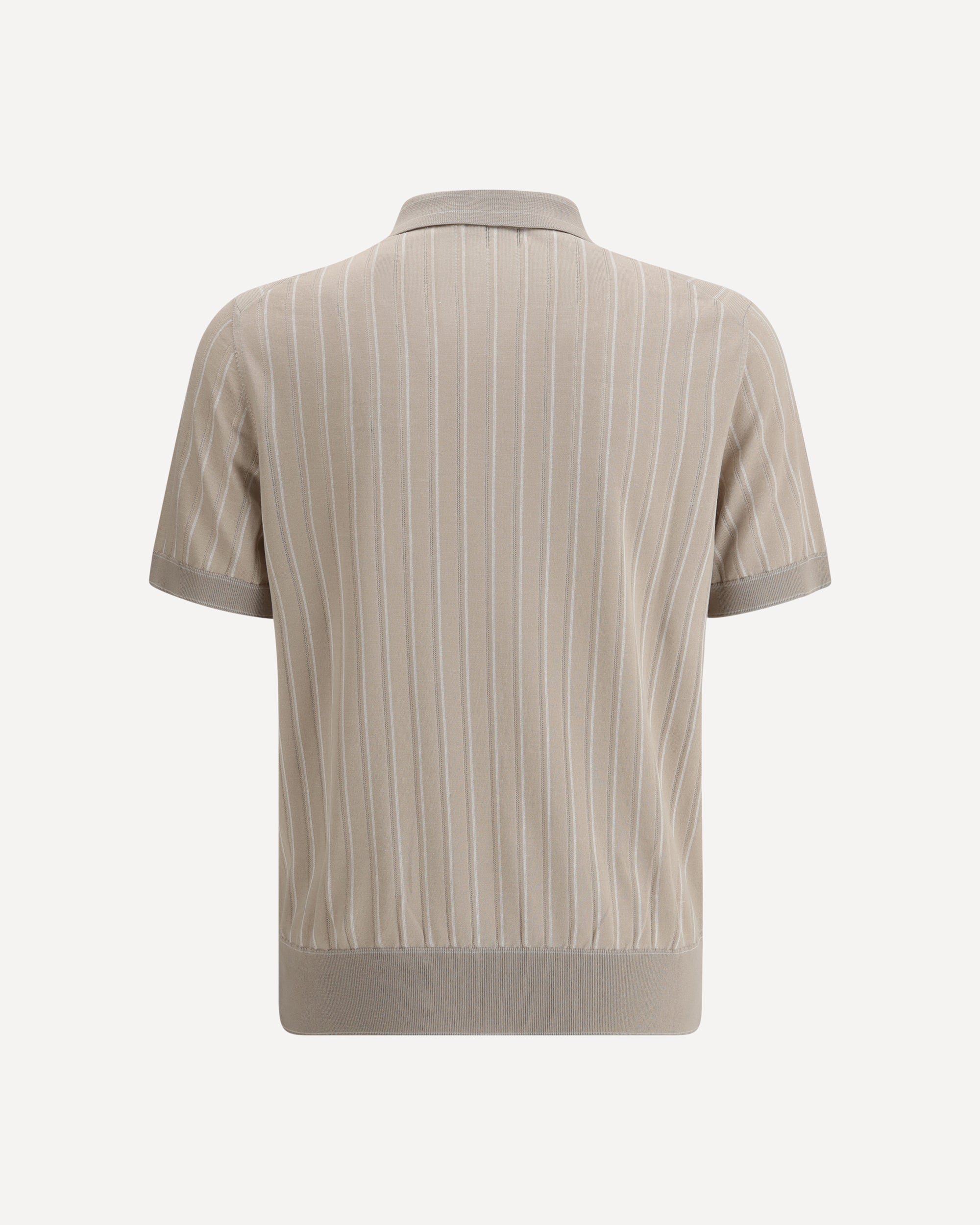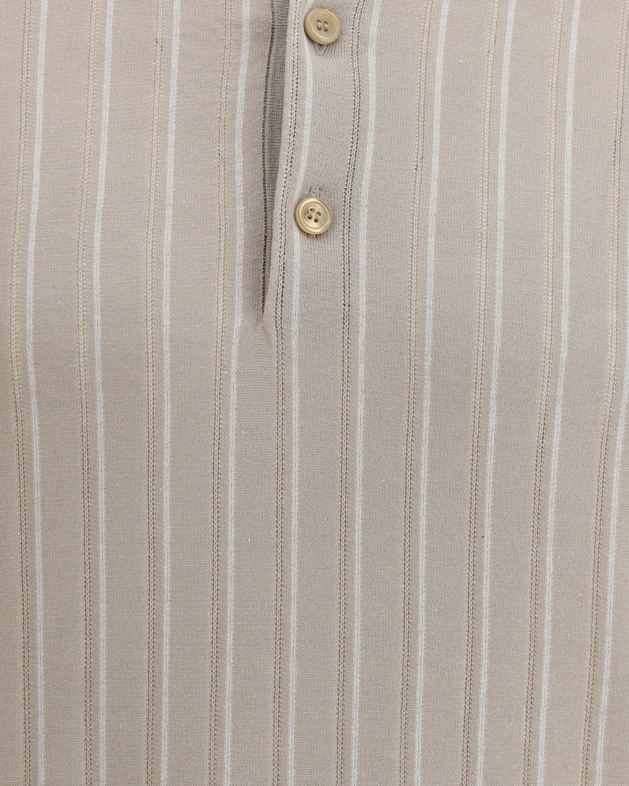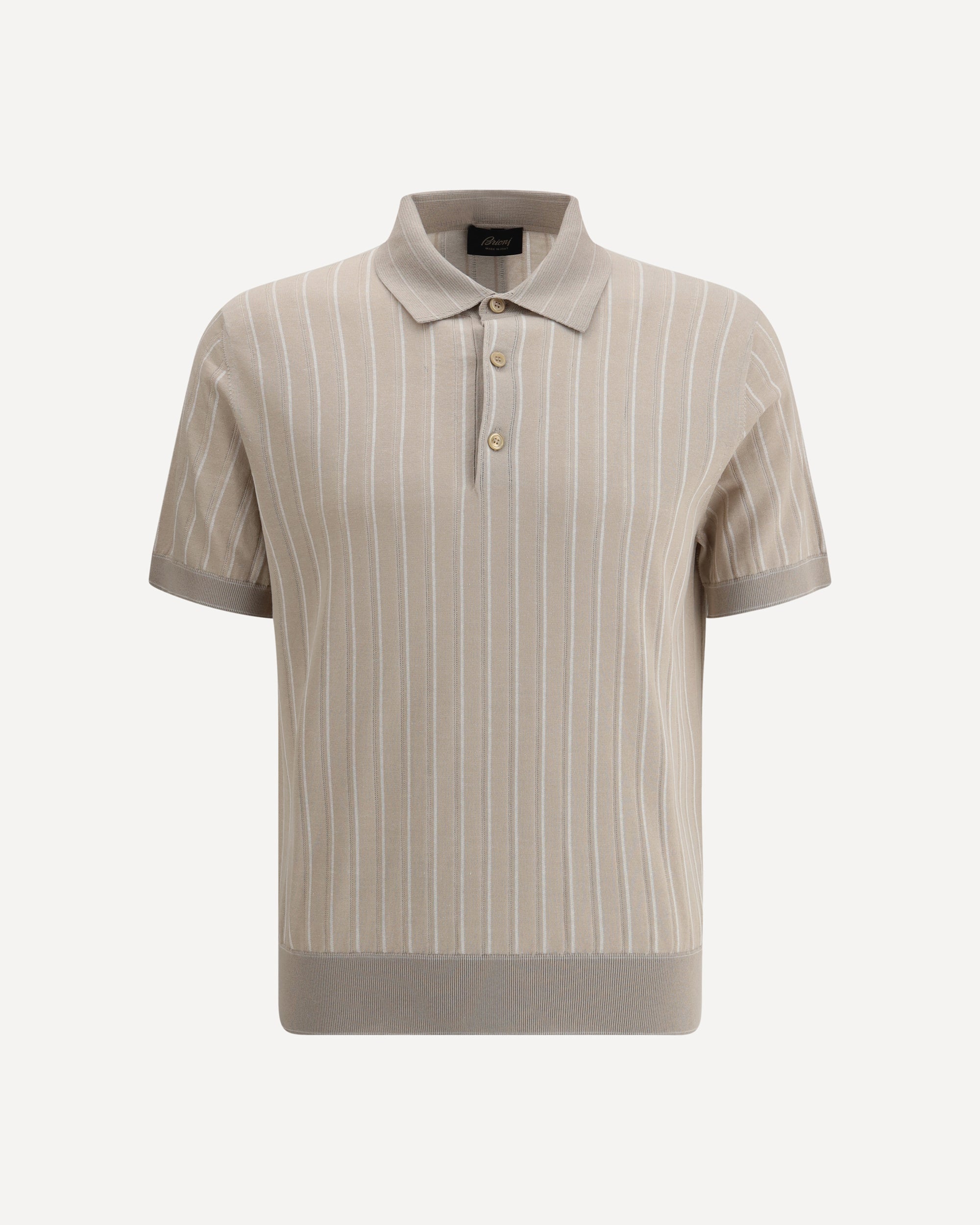 Brioni's Striped Polo Sweater is an elegant and sophisticated piece, featuring a ribbed collar that adds a touch of class. The classic Brioni signature three-button closure ensures a perfect fit, while the ribbed hem gives a refined finish. The modern and versatile striped pattern enriches the design with a dynamic and stylish accent. Perfect for a casual-chic look, this polo lends itself to numerous pairings, making it ideal for informal yet elegant occasions.