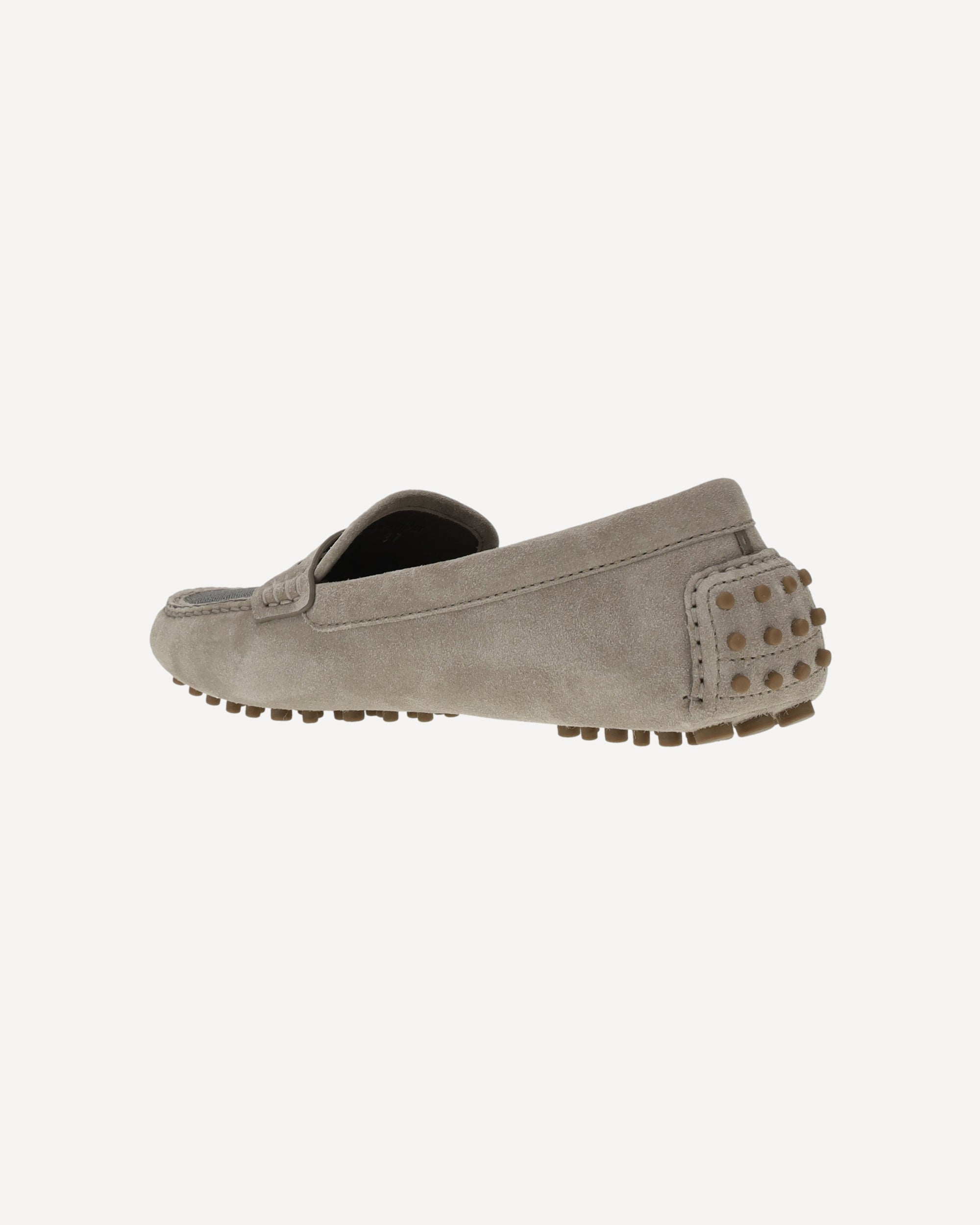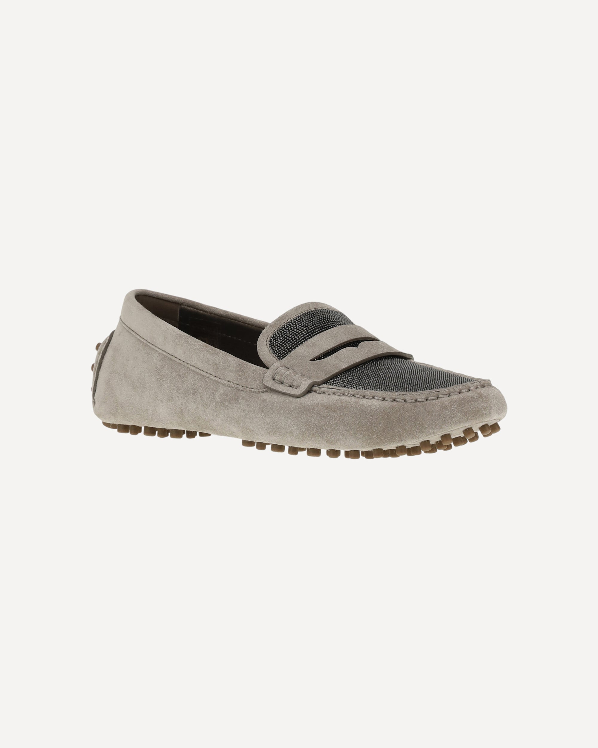 Brunello Cucinelli's suede Loafers combine elegance and comfort, thanks to a segmented rubber sole that ensures a safe and comfortable walk. The front tray, embellished with the brand's iconic shiny jewels, adds a touch of understated luxury. A sophisticated and versatile accessory, perfect for those seeking a balance between refined style and practicality.