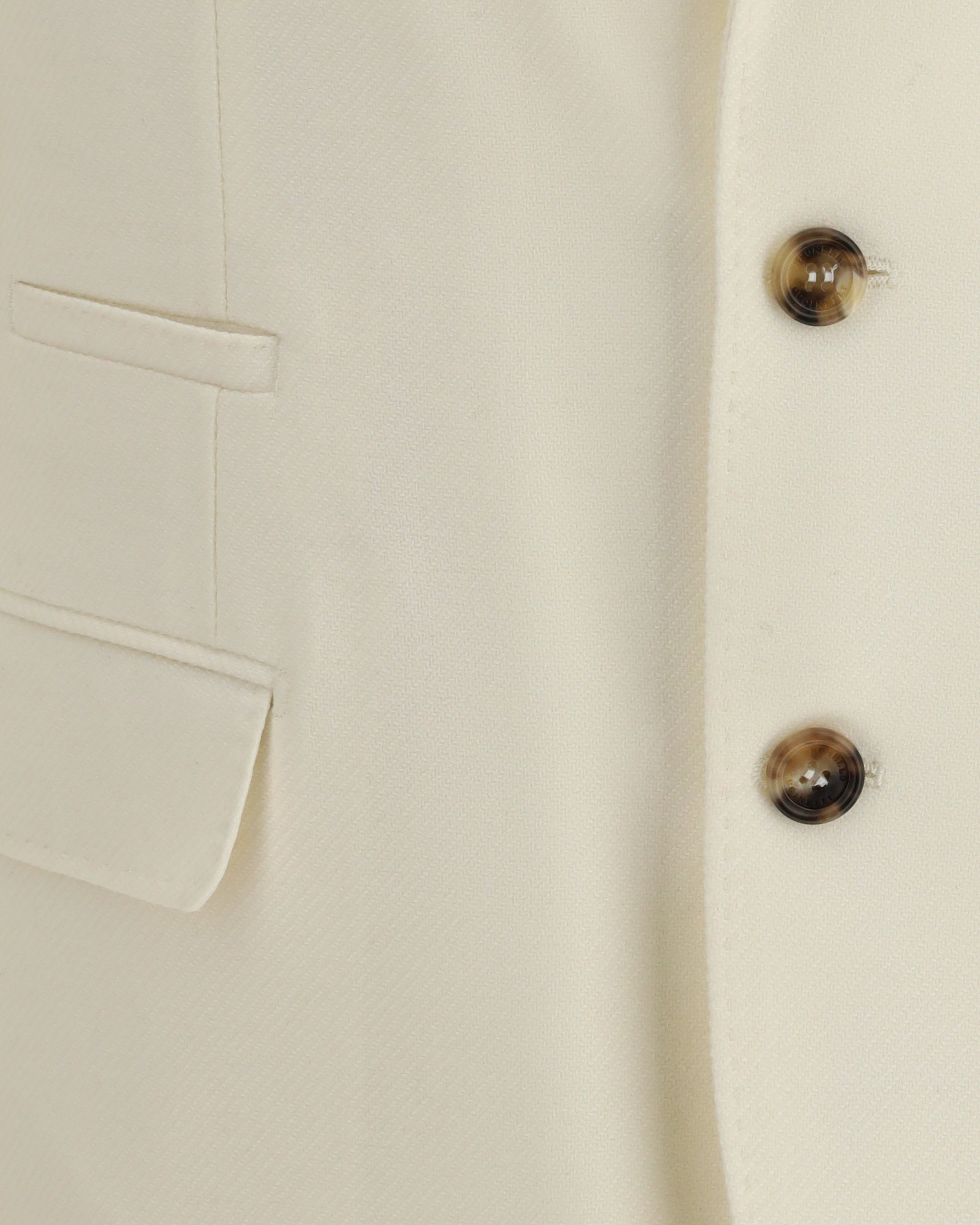 The Jacket by Brunello Cucinelli expresses the wool-blend cavalry fabric through a tailored elegance that balances structure and fluidity. The single-breasted closure with three buttons pairs harmoniously with the wide peak lapel, shaping a style that feels both classic and modern. The sleeves with “Solomeo shoulder” construction and four-button cuffs introduce a distinctive touch, while the welt pockets with flap, the chest pocket and the ticket pocket add refined practicality. Side vents at the back enhance movement, and the partial cupro lining ensures light comfort. Horn buttons complete a piece designed for an impeccable and thoughtful aesthetic.