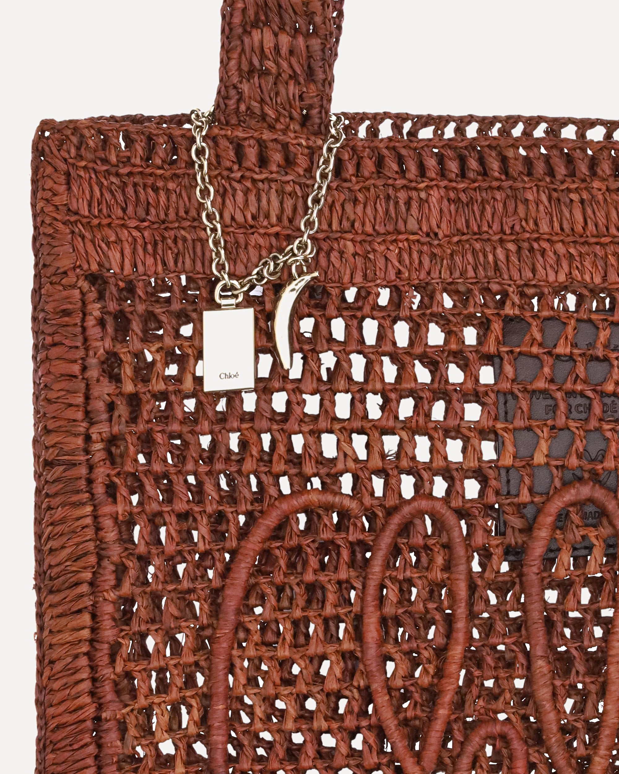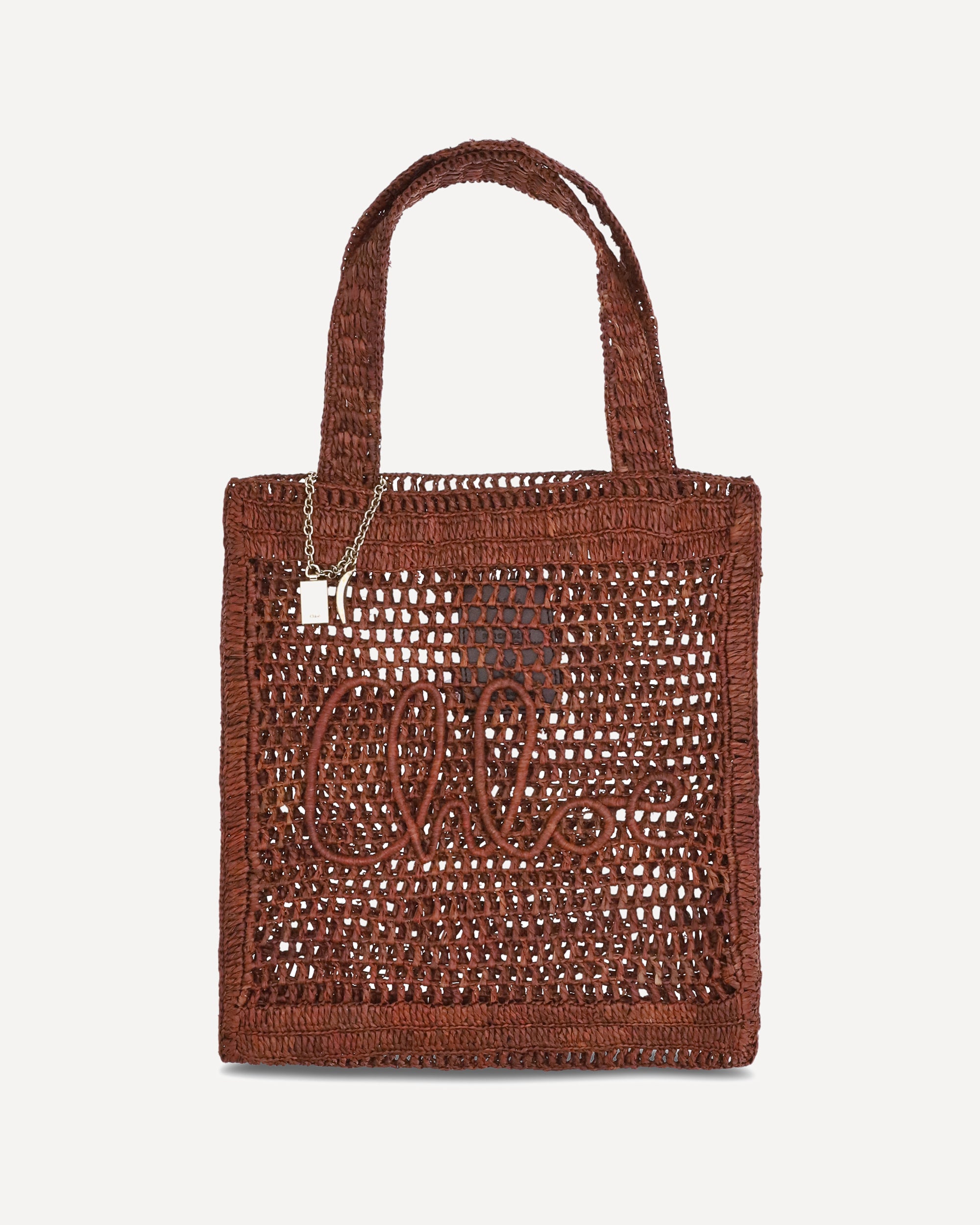 Chloé's Summer Banana Tote Bag is an elegant and cool accessory made of raffia with a perforated weave. It has two top handles for convenient carrying and features the iconic monogram embroidered on the front. A golden banana-shaped pendant is attached to the handle, adding a distinctive touch. Inside, there is a logoed leather patch and a single interior compartment for storing essentials. Perfect for summer, it combines practicality and style.