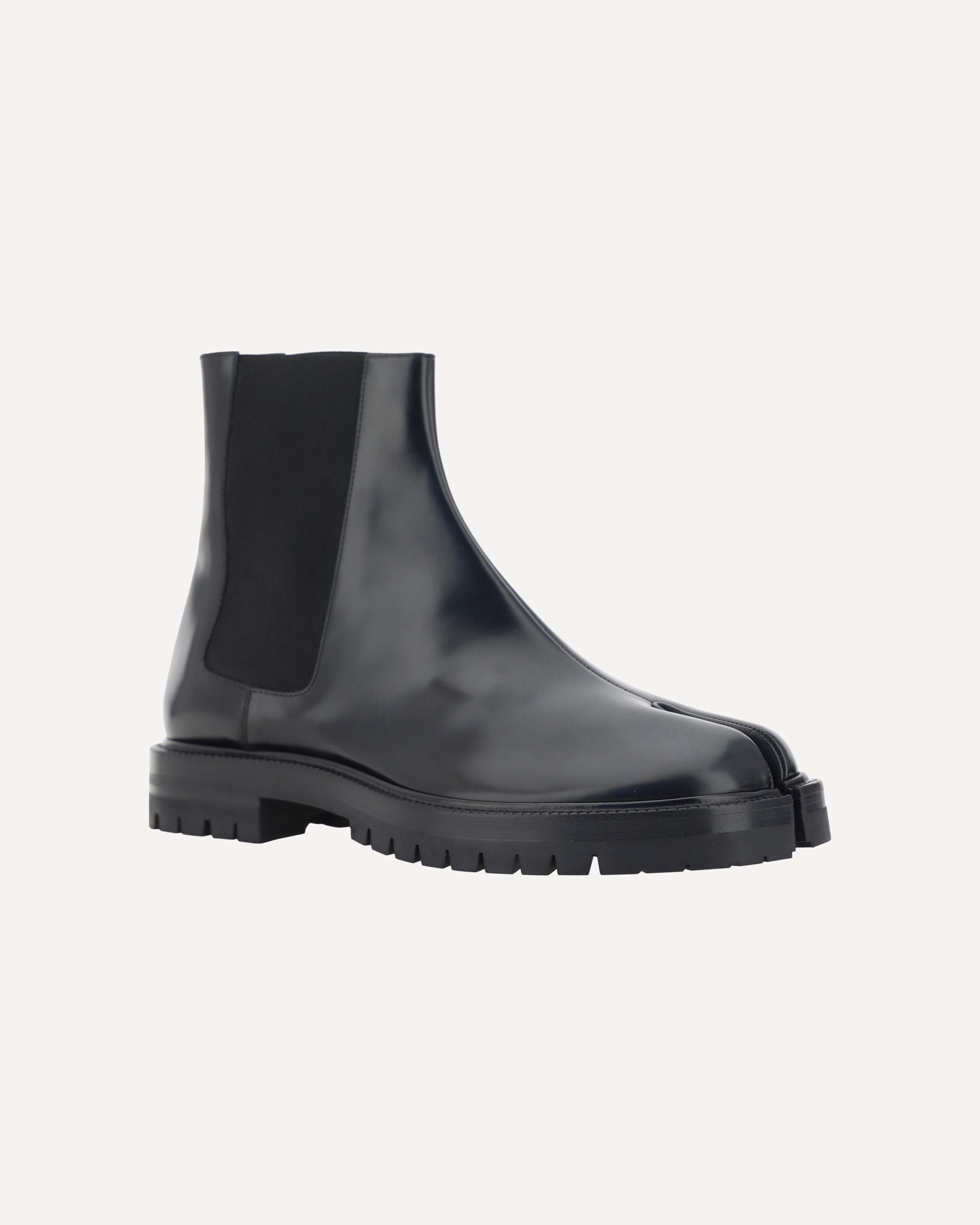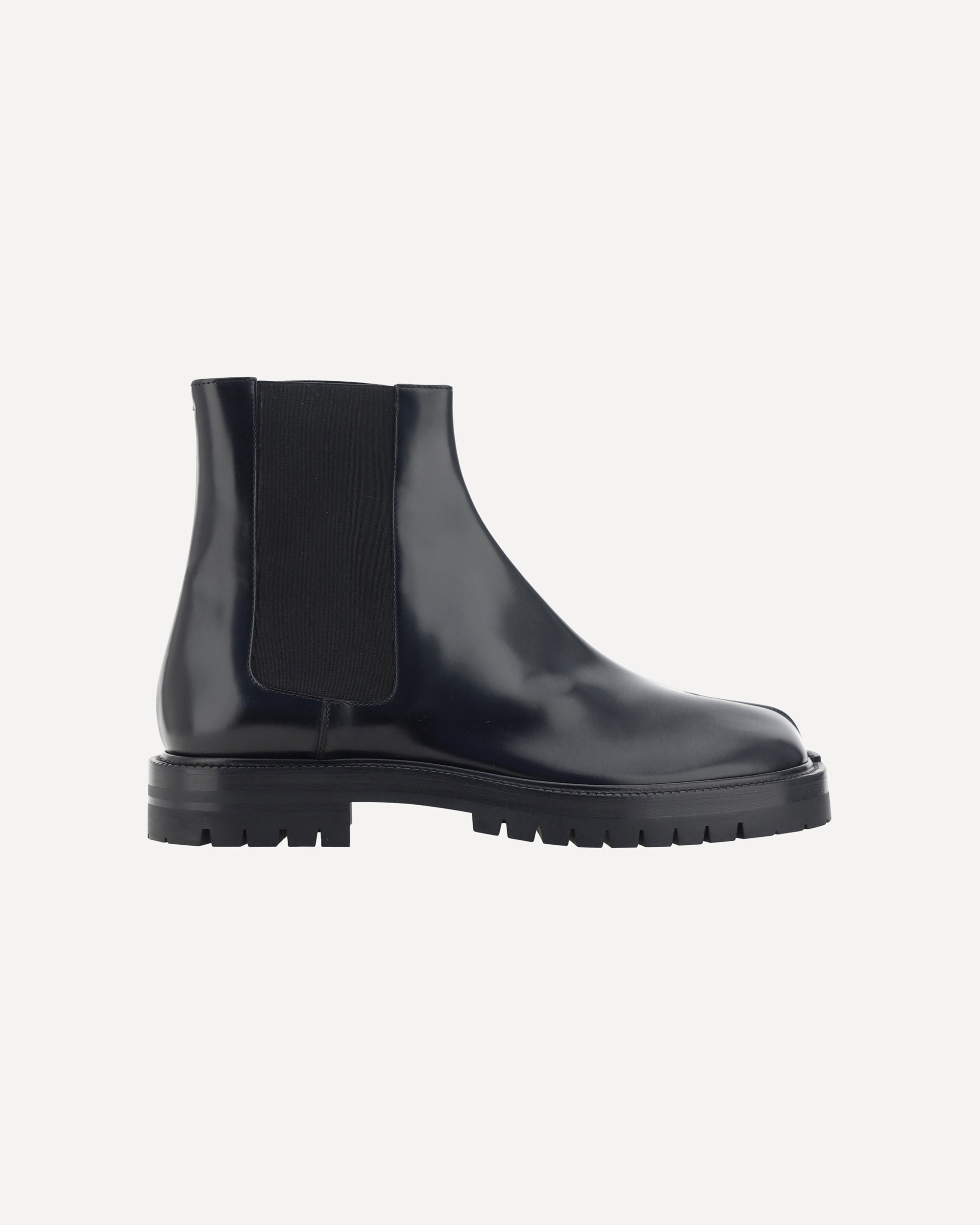 Calfskin Tabi County Chelsea Boots by Margiela, elasticized bands applied to side panels, slip-on block heel, iconic Tabi toe from the brand on the front, iconic contrast stitching on the back.