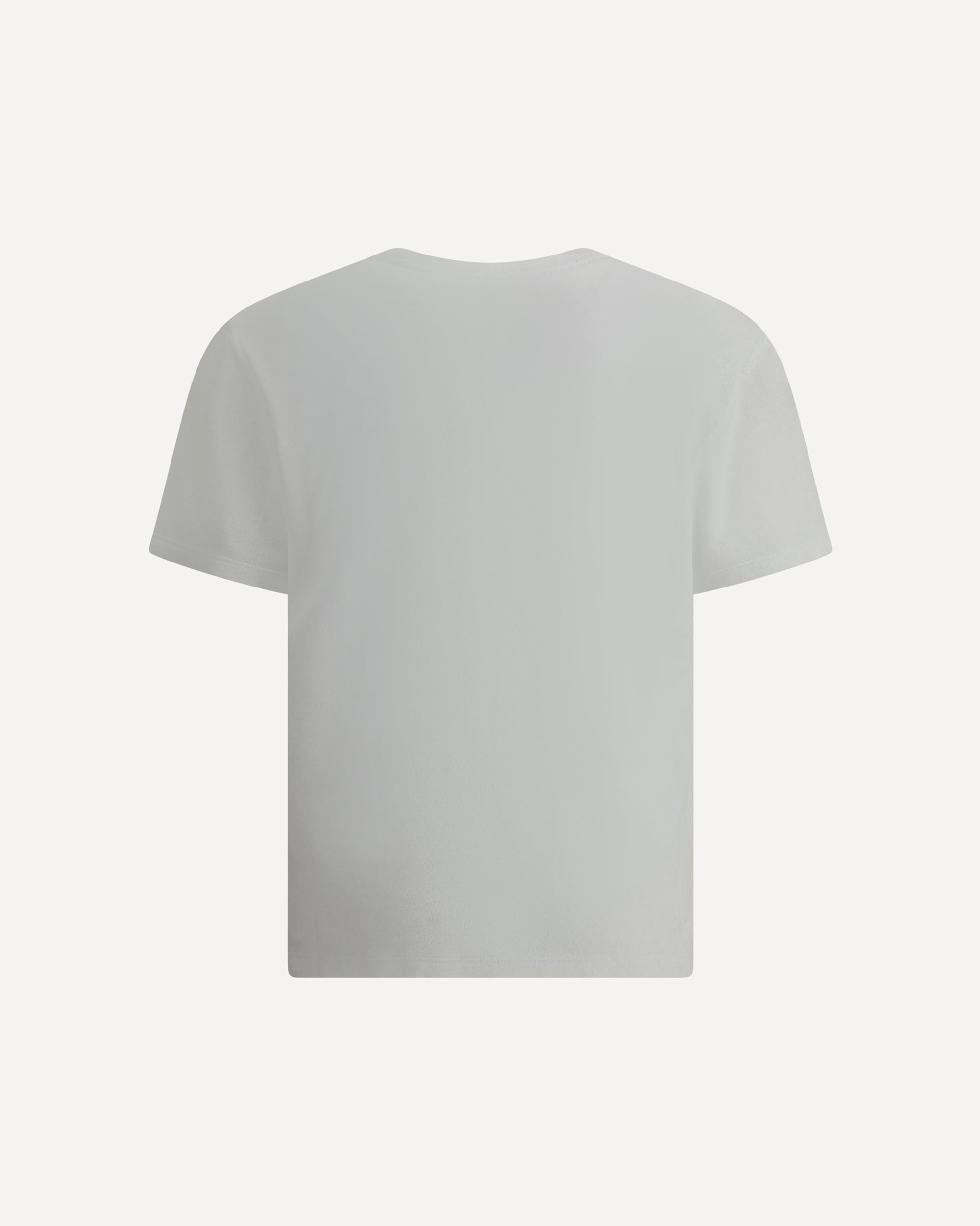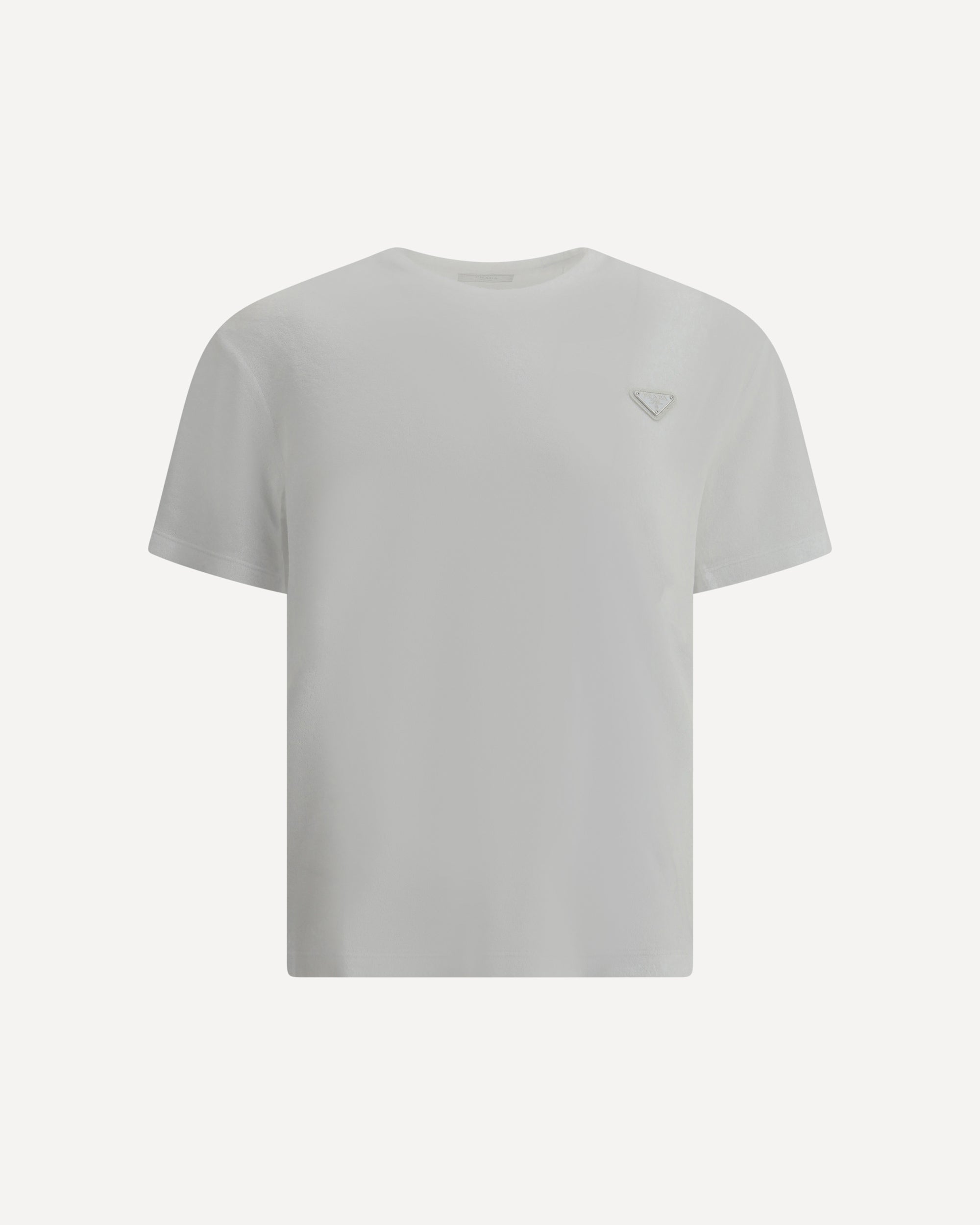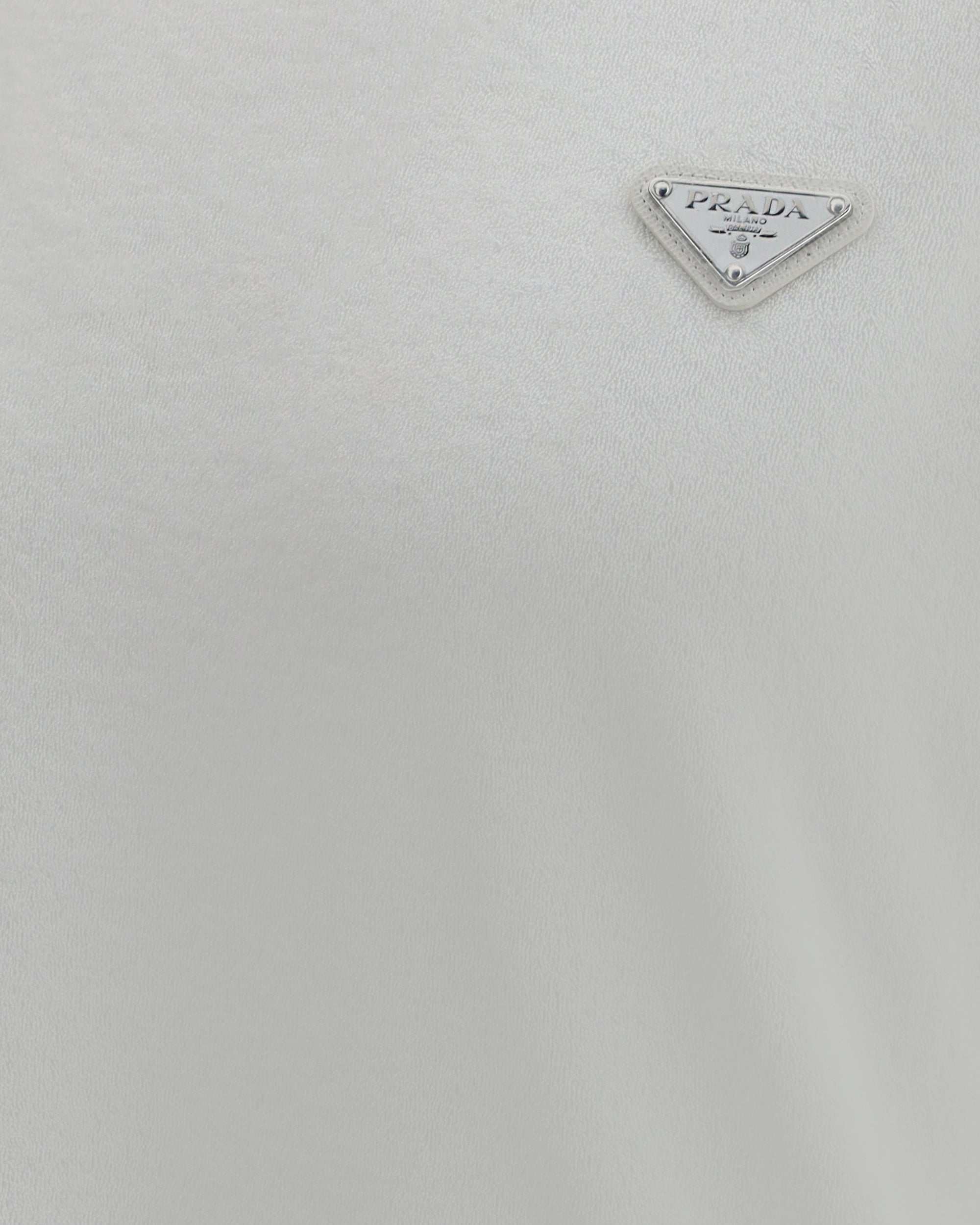 Prada's Terry T-shirt is a garment that flawlessly combines comfort and style. Made of terry cloth, it offers a soft texture and absolute comfort, ideal for a casual yet classy look. The minimalist design is enhanced by a plaque with the brand's iconic logo applied on the front, adding a distinctive and modern touch. Perfect for those seeking a stylish yet comfortable garment that can be easily paired with a variety of styles, from a more casual day to a more refined look.
