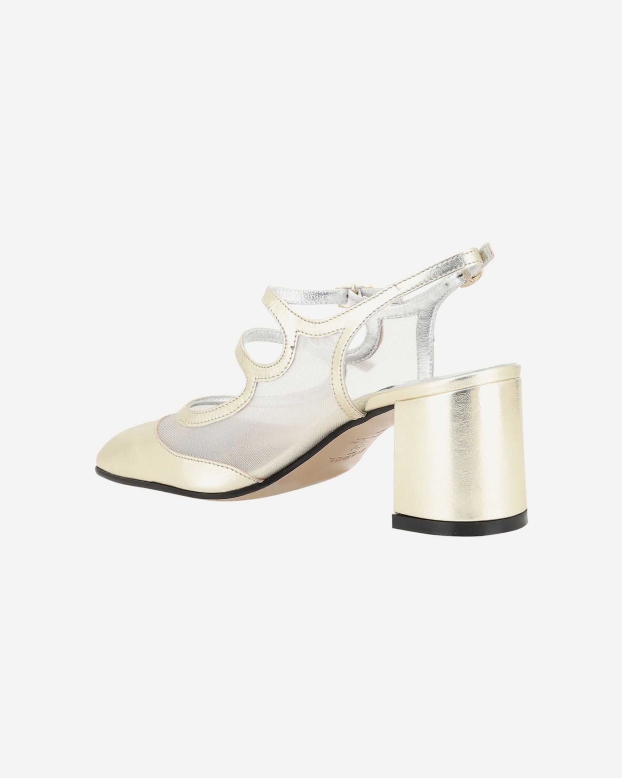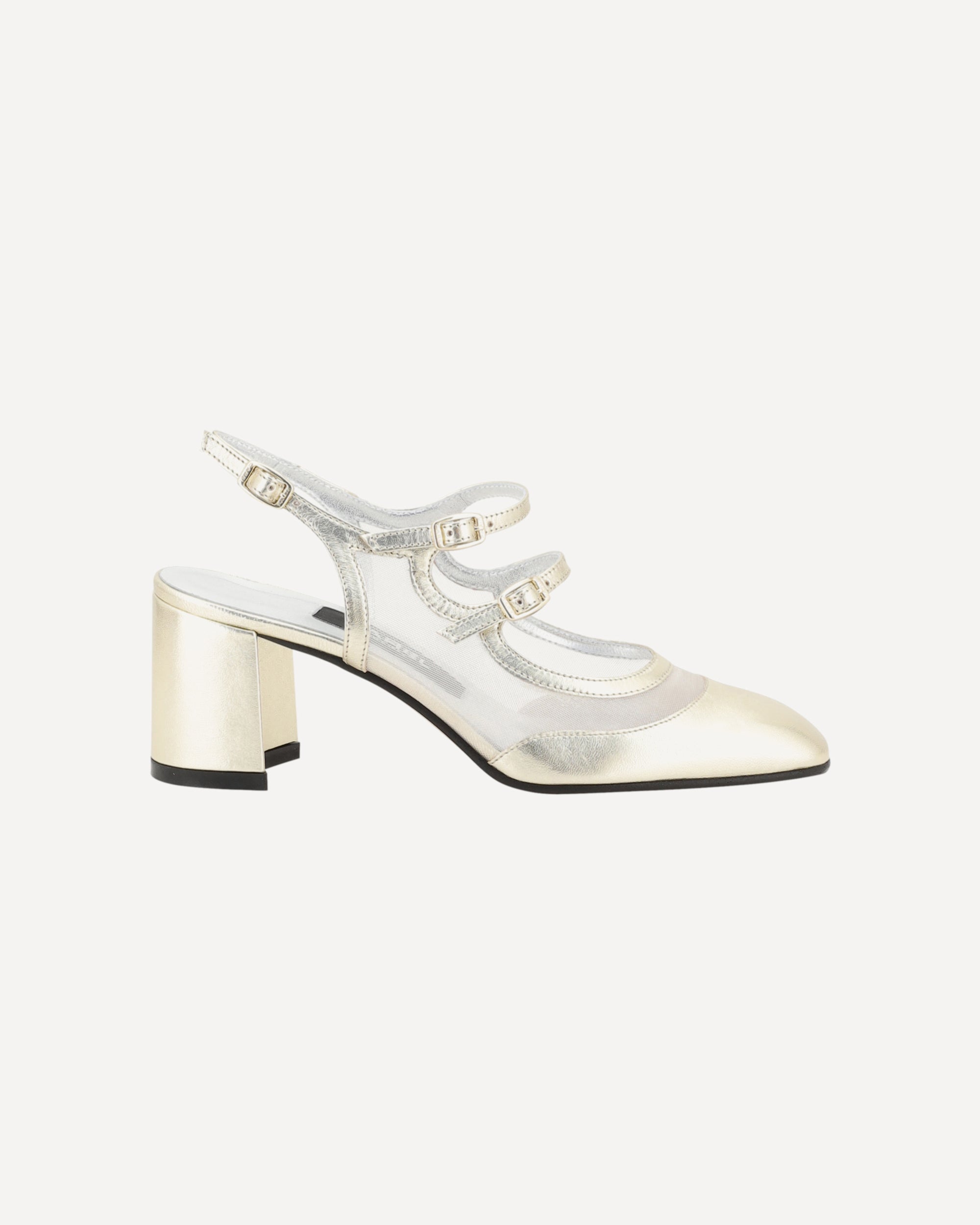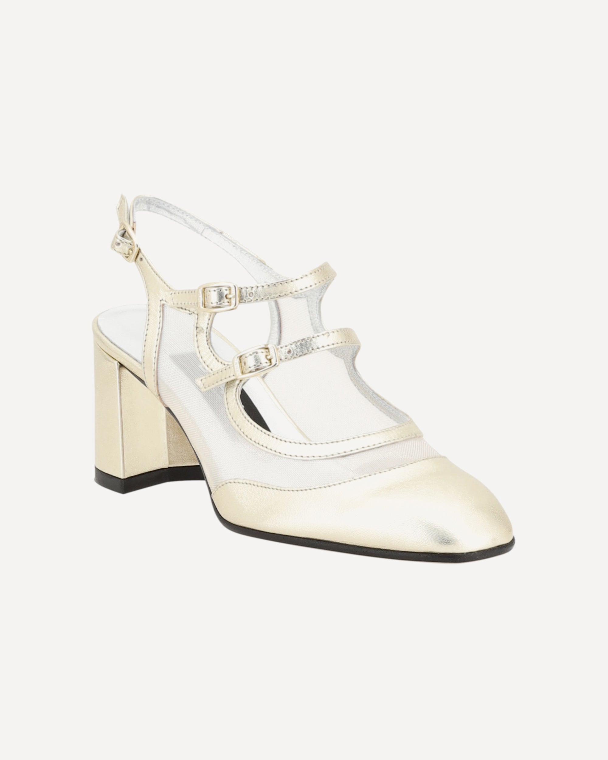 The Bananight Leather Pumps by Carel Paris feature a bold and sophisticated design, with a combination of metallic leather and sheer mesh creating a sleek and modern effect. The almond toe on the front adds a sleek, feminine silhouette. The multiple, adjustable straps on the back of the foot, along with the adjustable strap around the ankle, ensure a customized and comfortable fit. The chunky leather heel offers stability and comfort, while the logoed insole adds a touch of exclusivity. A pair of pumps that combine contemporary style and practicality, perfect for those seeking a sophisticated and comfortable look.