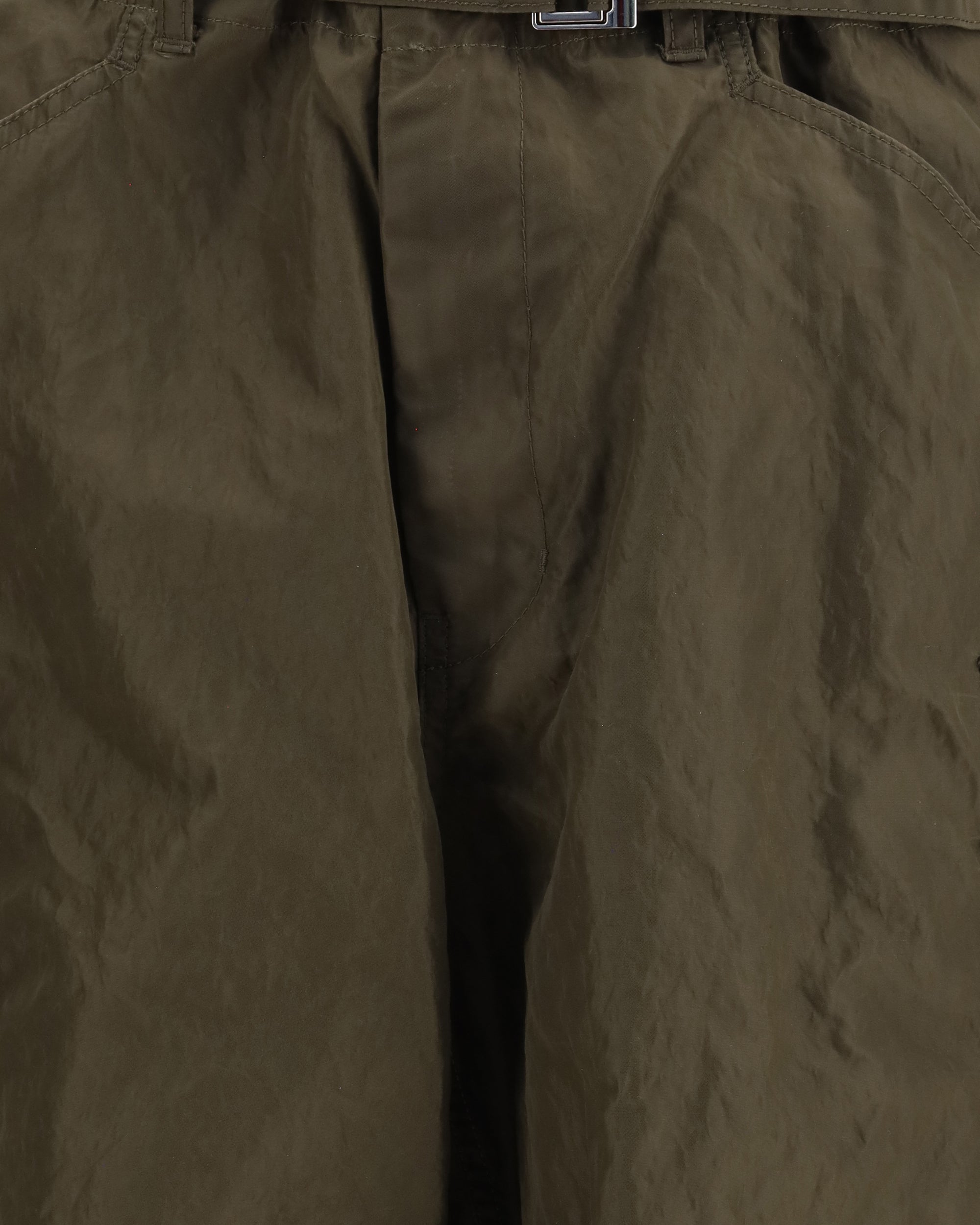 The cargo nylon Pants by Sacai combine functionality and style with an innovative closure: a built-in belt with buckle and zipper. The belt loops at the waist offer additional adjustment options. Featuring two side slit pockets and two cargo pockets with flaps, these pants combine practicality with an urban-chic look. The two back pockets with flaps and the drawstring hem complete the design, making them versatile and perfect for a casual yet polished look.