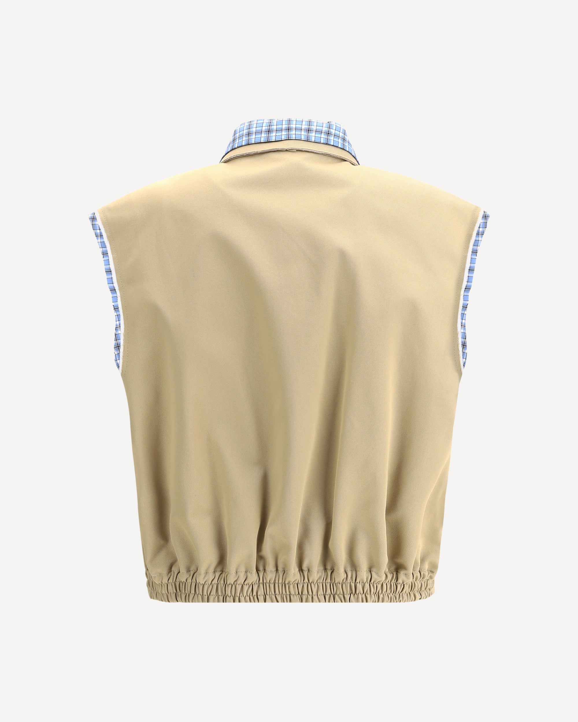 Prada's Vest Jacket combines modern design with refined details. The classic cotton check collar offers a stylish contrast, while the front zipper closure ensures a functional fit. The brand's iconic logo is stitched tone-on-tone on the front, adding an understated yet recognizable touch. Raw-cut sleeves and check cotton fabric detailing matching the collar lend a unique and contemporary look, making this vest a distinctive and versatile garment, perfect for those seeking a sophisticated yet casual style.