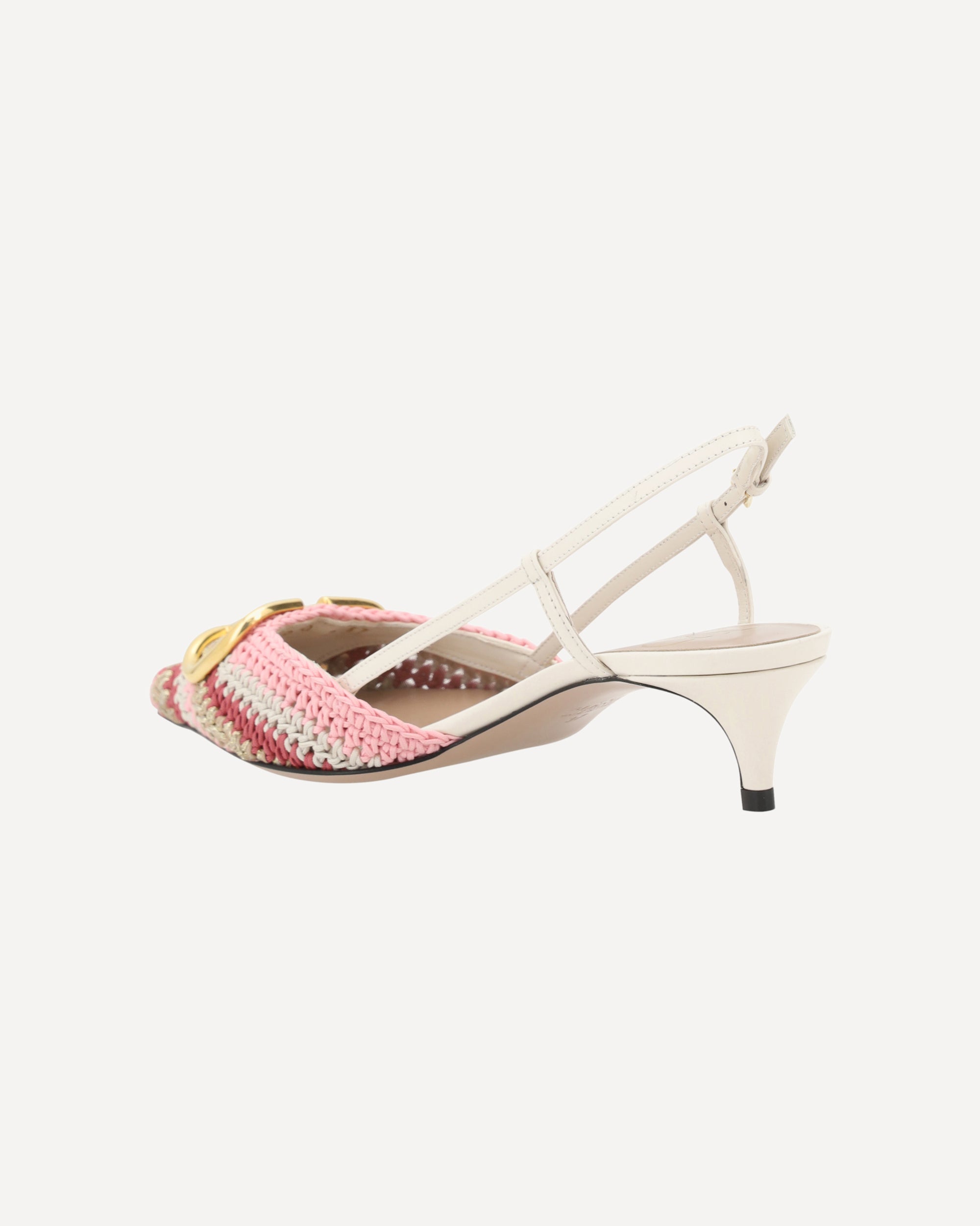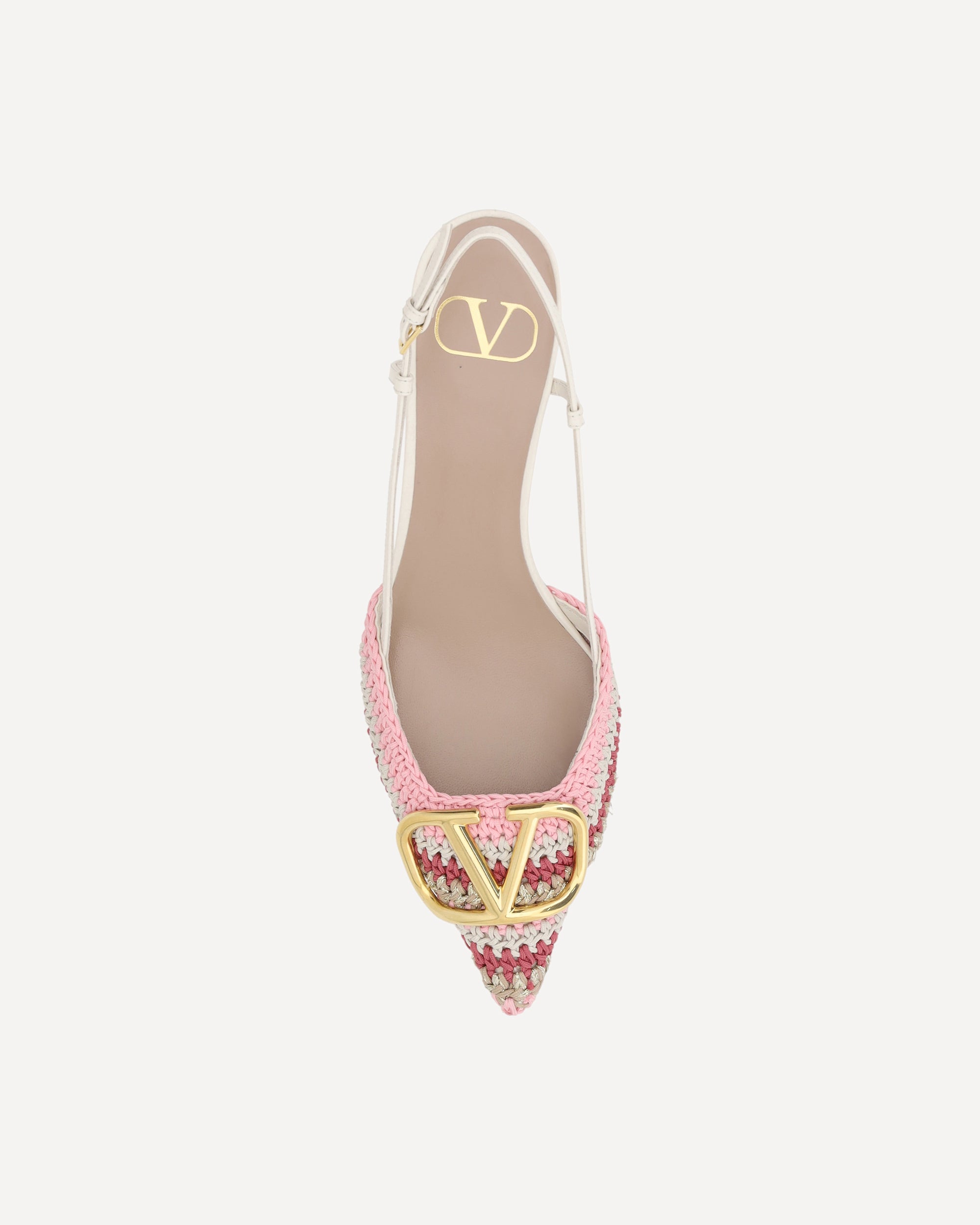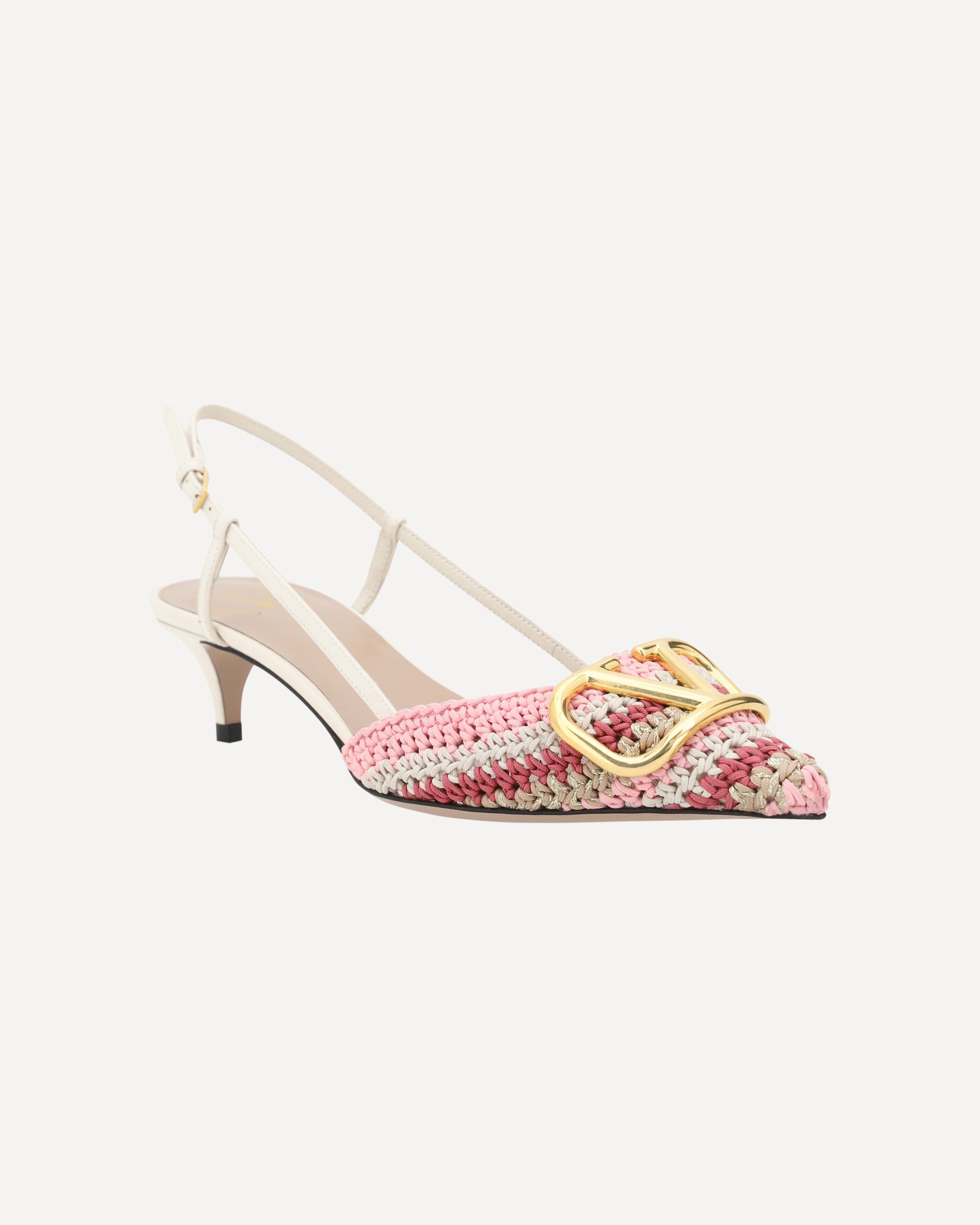 Valentino Garavani's VLogo Pumps feature a multicolored crochet design that lends a unique and vibrant touch. The iconic VLogo plaque is applied to the front, while the elongated toe adds elegance. The kitten heel offers comfort and femininity, while the adjustable slingback with buckle ensures a secure and customizable fit. A perfect blend of style and practicality.
