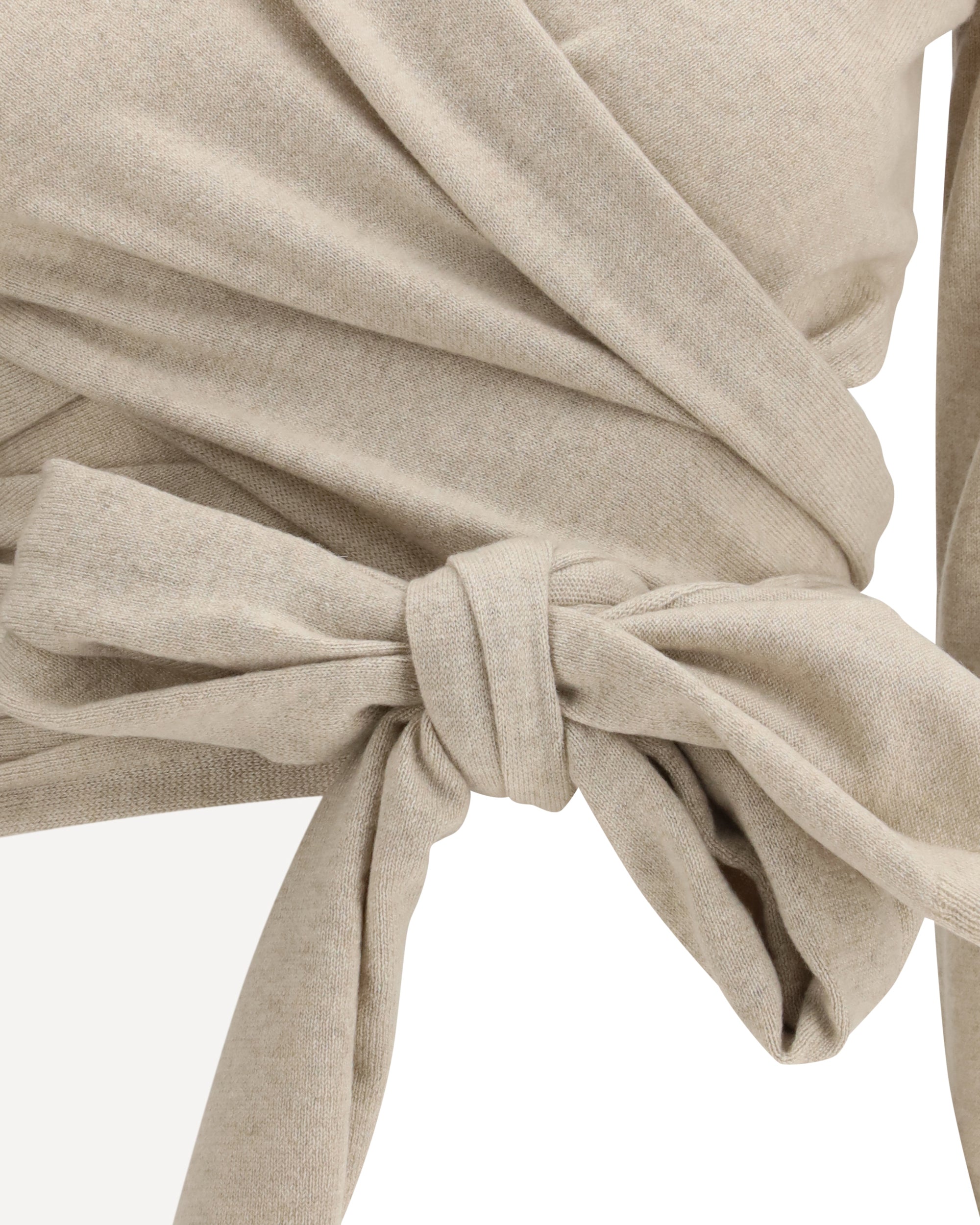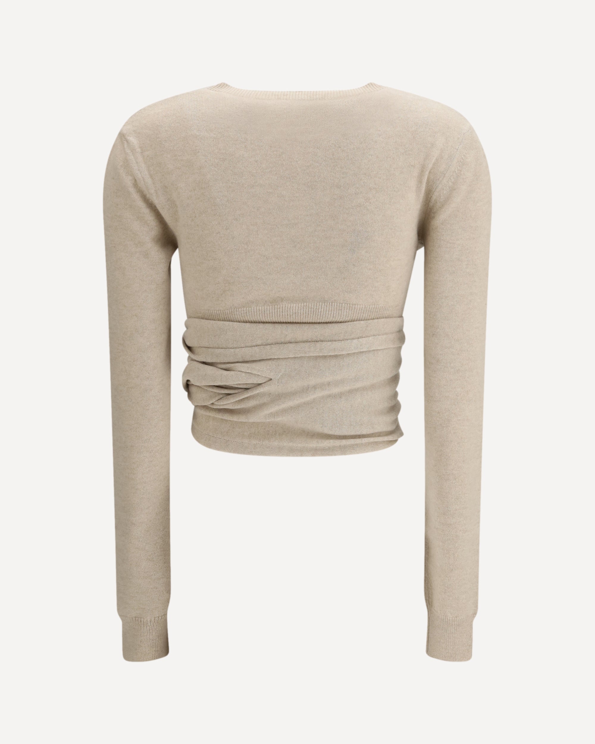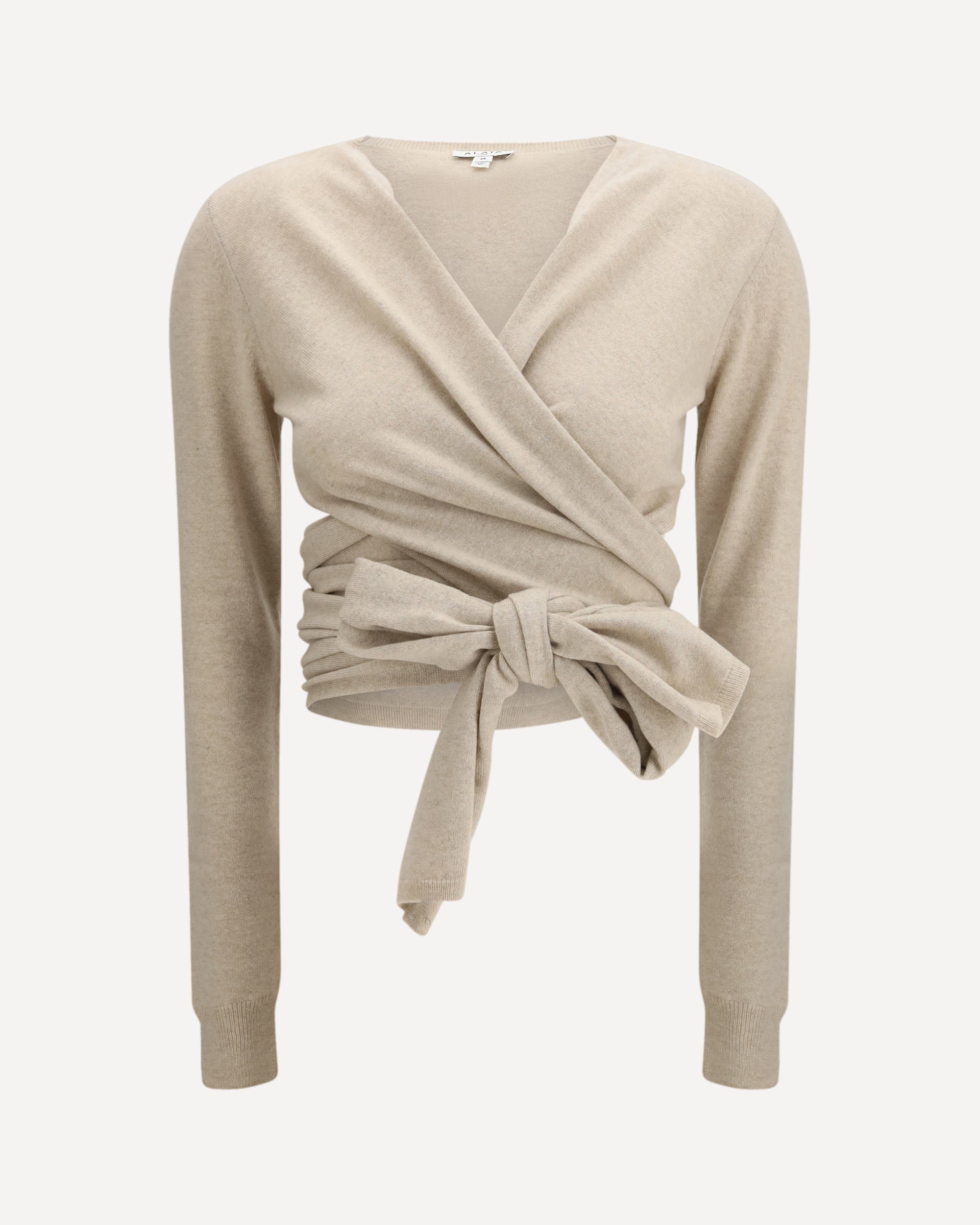The wrap Top by Alaïa is crafted from a refined blend of wool and cashmere, designed without closures and featuring an elegant wrap-style construction that naturally enhances the silhouette. The long sleeves are detailed with ribbed finishes, adding texture and definition to the design while maintaining a perfect balance of softness, minimalism, and sophistication.