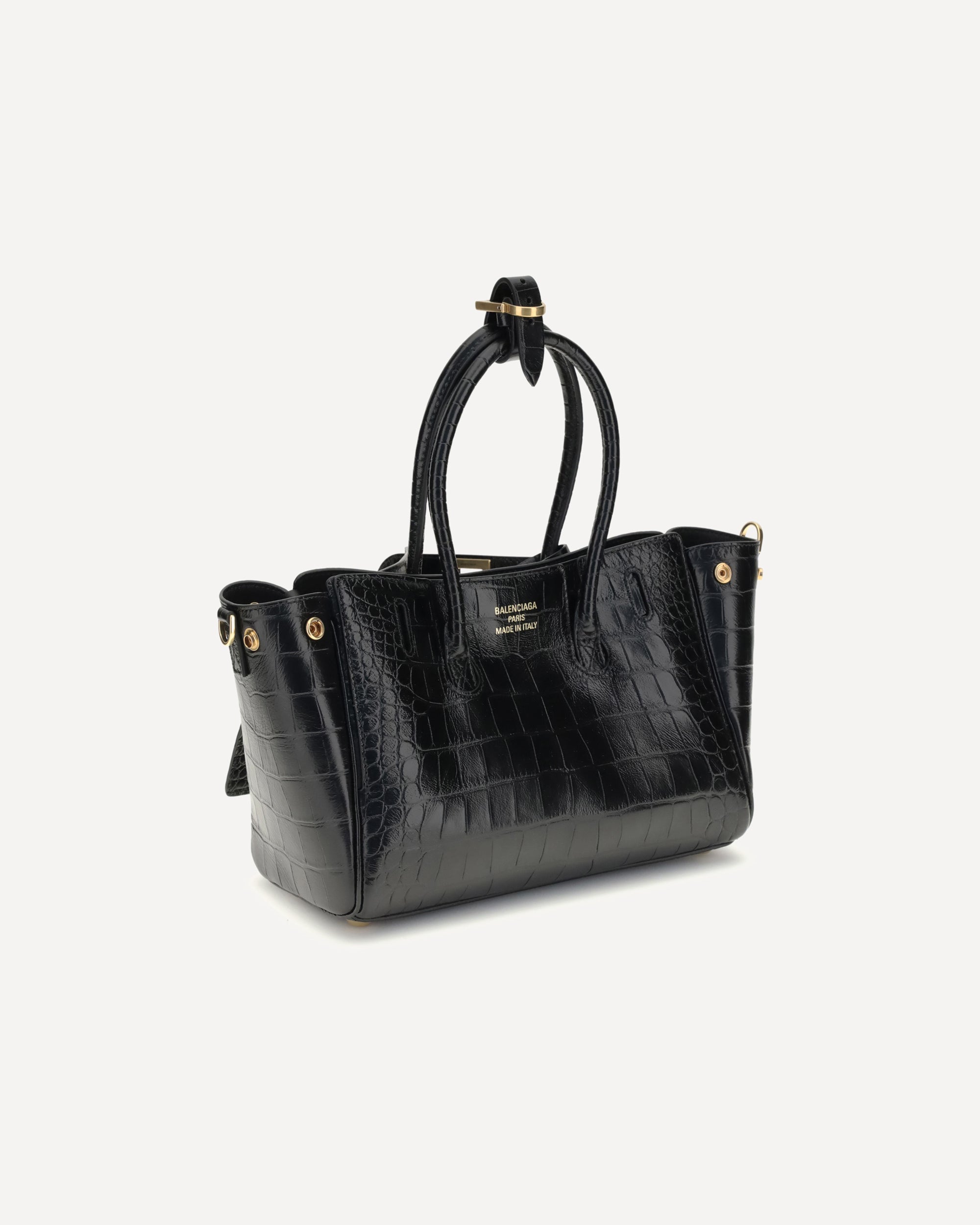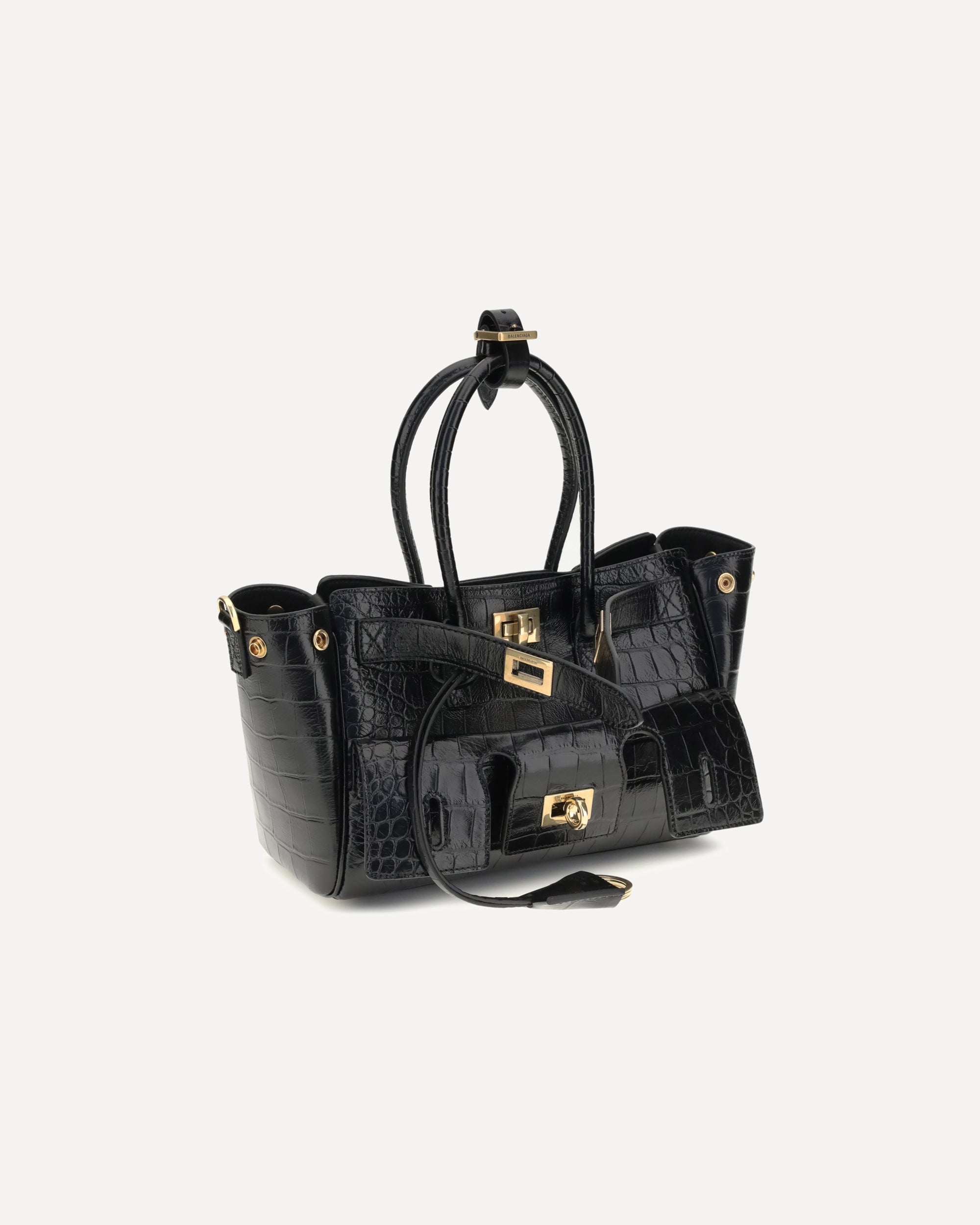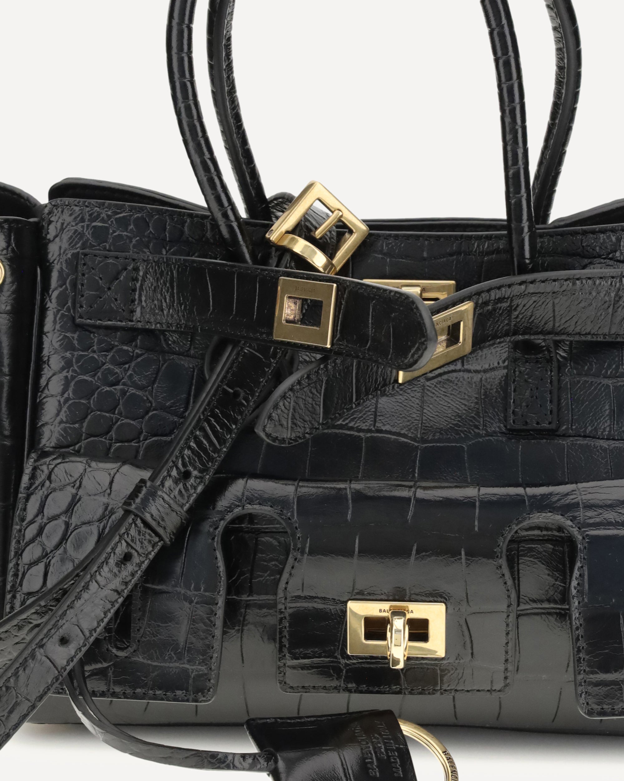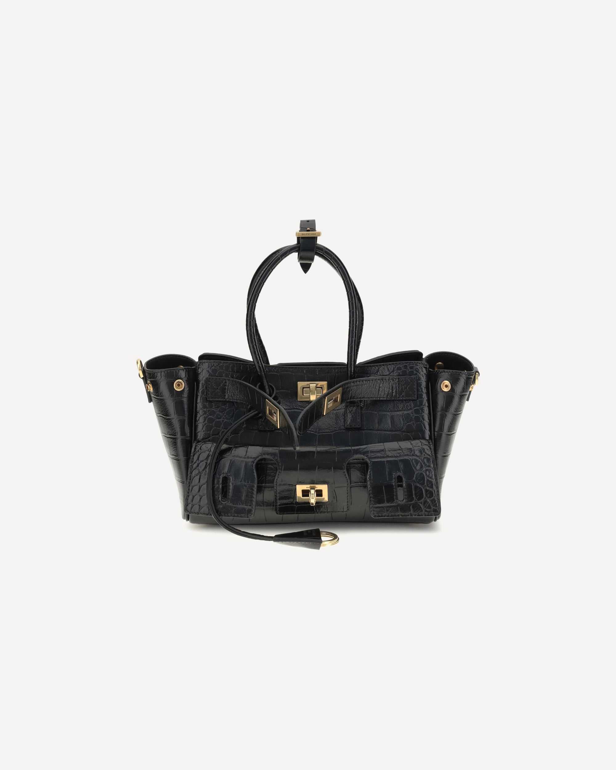 Bel Air mini Shoulder Bag by Balenciaga, is made of calfskin leather with crocodile processing, combining sophistication and iconic design. The carry-all model features two handles joined by a clip and an adjustable, removable shoulder strap, so it can be carried on the shoulder, over the shoulder or by hand. The back features the embossed Balenciaga Paris logo with lamination, while the removable key ring with double spiral loop adds practicality. Antiqued gold hardware, snap buttons on the sides, and an engraved logo swivel closure complete the look. The bag offers a large front pocket, main compartment and two interior zippered pockets for functional organization.