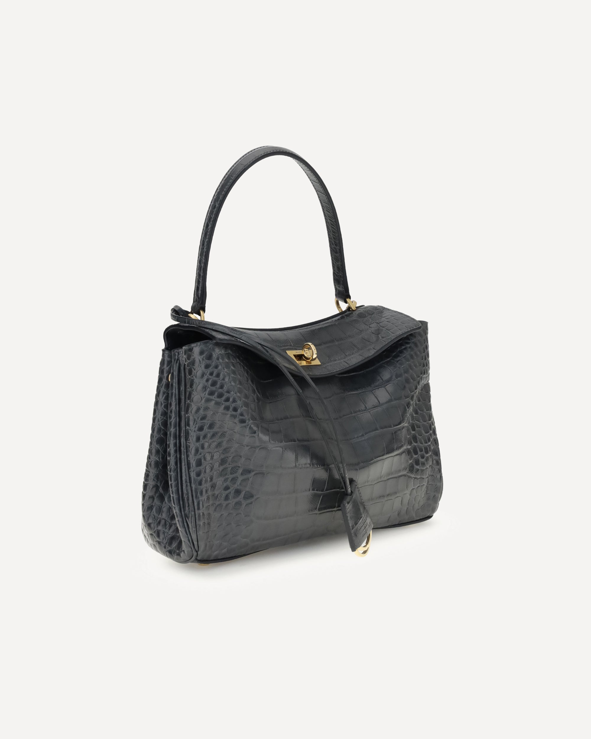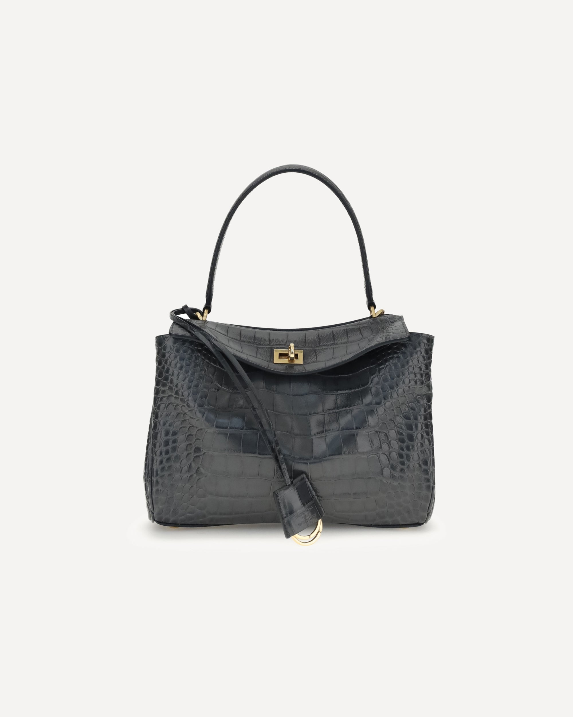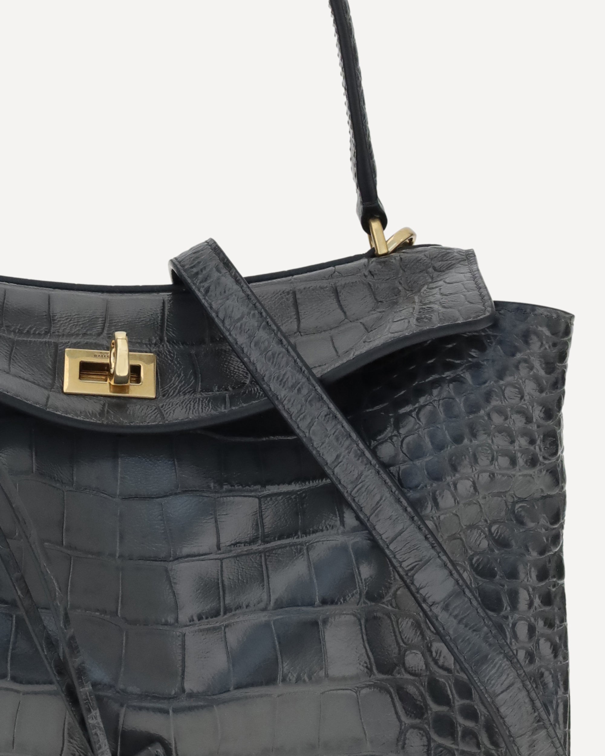 The Rodeo Shoulder Bag in crocodile-print leather by Balenciaga features a top handle for a comfortable and elegant grip. The front closure is equipped with a flap and turn lock, adding a distinctive and functional detail. Key ring detail applied to the top handle. The removable shoulder strap is secured with snap hooks, allowing it to be carried both on the shoulder and by hand. Inside, the bag offers a single internal compartment, ideal for organizing essentials. Additionally, there are metal feet at the base of the bag, to protect it and keep it in place.