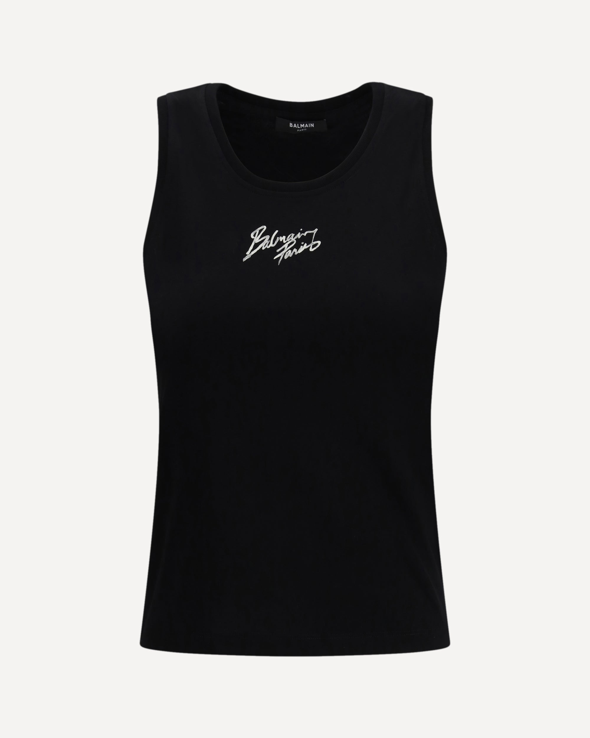 The Relaxed tank top by Balmain featuring the Balmain Paris Brush print, crafted from soft cotton jersey. The clean round neckline and ribbed edging refine the minimalist silhouette, while the relaxed fit adds a modern, effortless feel. A versatile piece that highlights the Maison’s graphic identity.