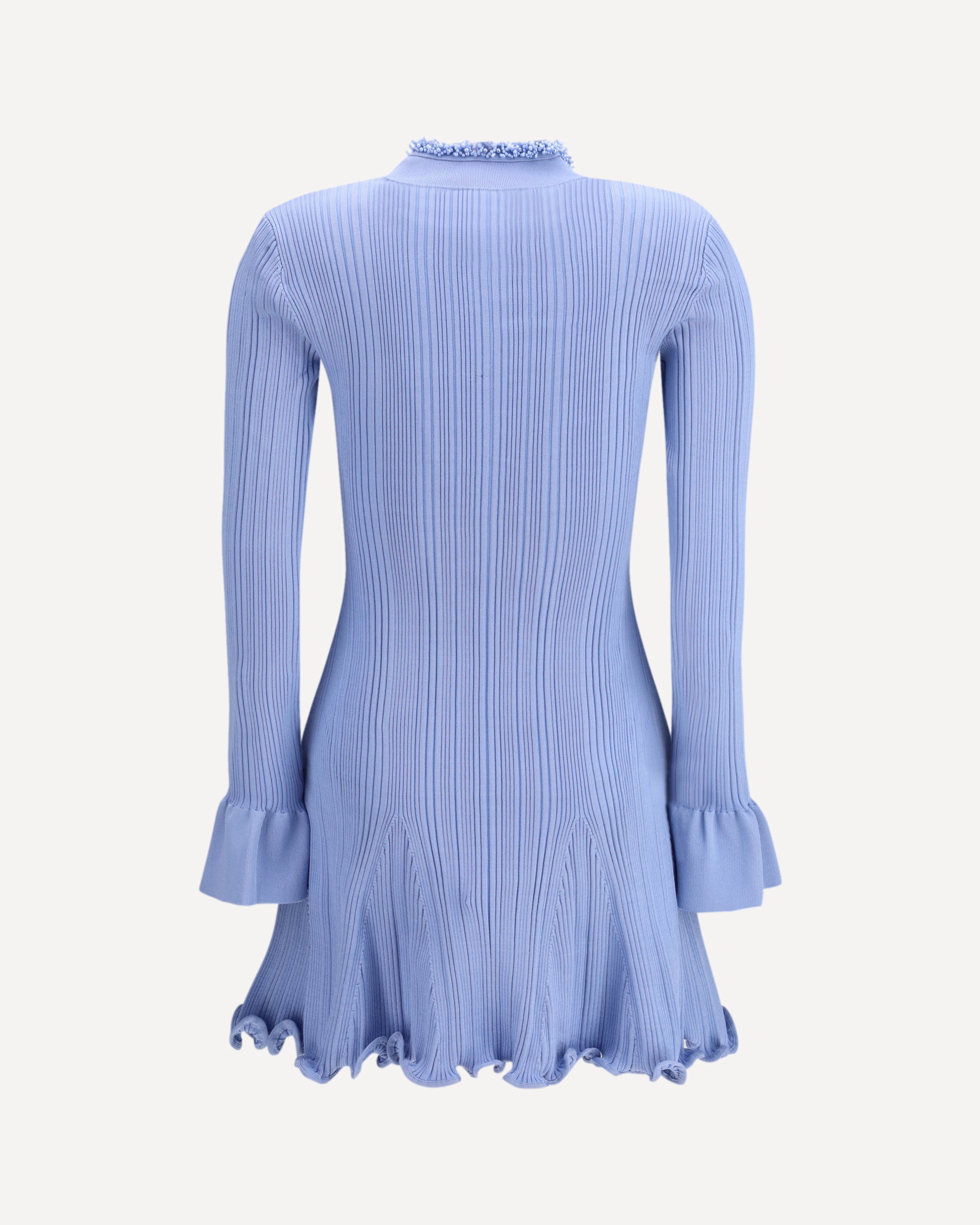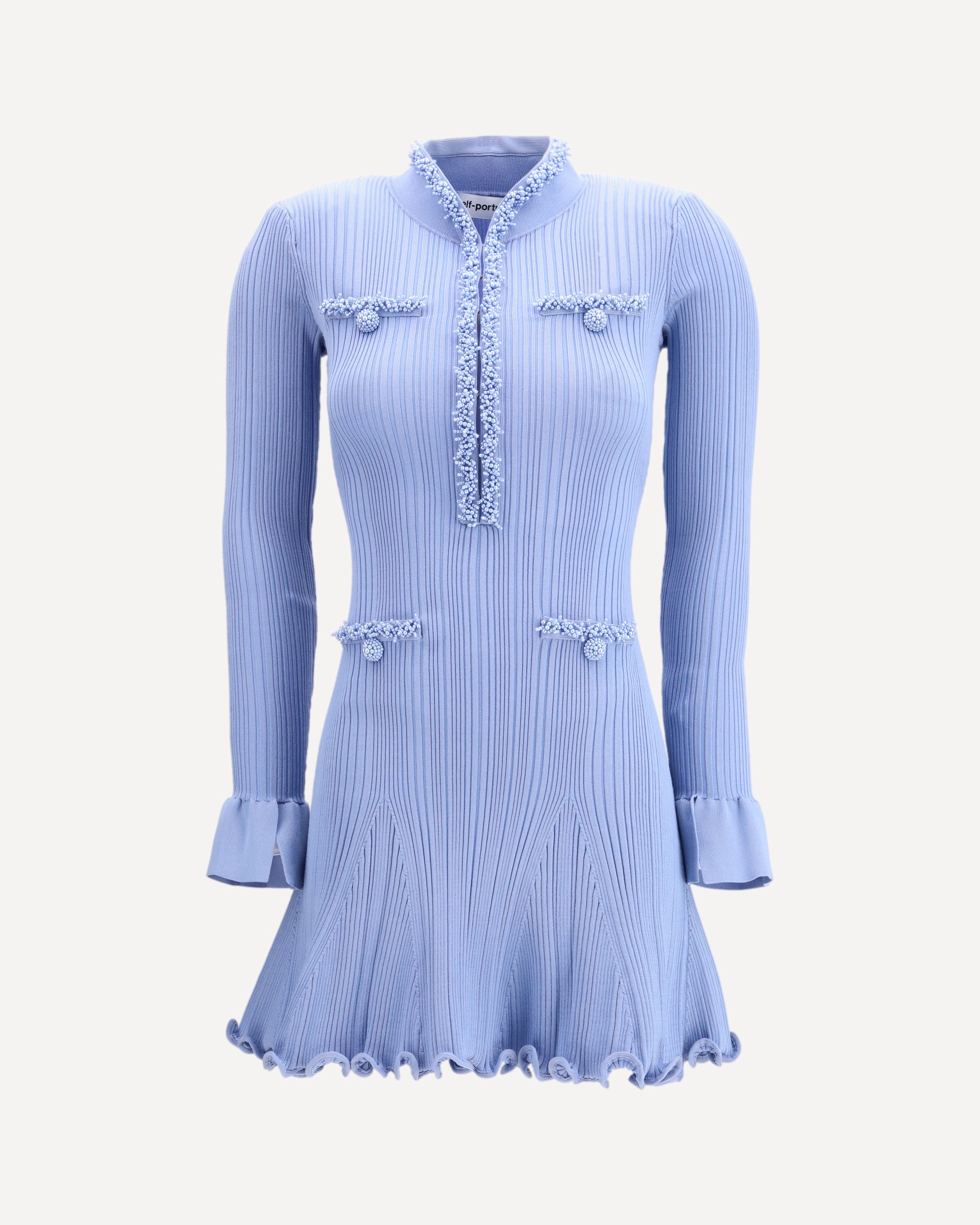 The pearl trim knit mini Dress by Self-Portrait blends softness and structure in a refined yet playful silhouette. Crafted in a stretch knit that gently sculpts the body, the design is illuminated by shimmering faux pearl trims that add a polished, jewel-like accent. A high collar lends elegance, while the flared sleeves introduce movement and a touch of drama. Finished with a button closure down the front, this mini dress highlights a flattering fit-and-flare shape, perfect to elevate with heels from day to evening.
