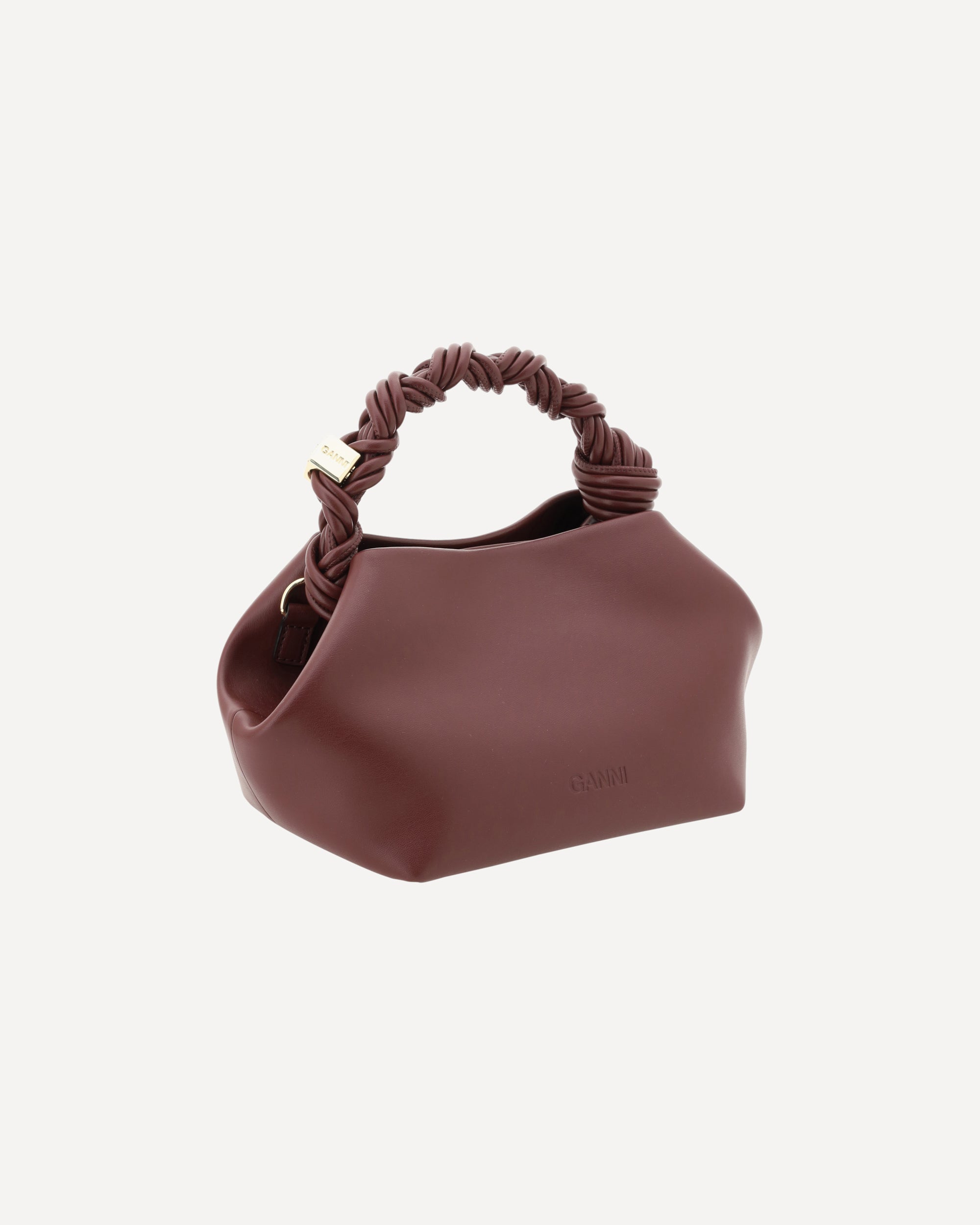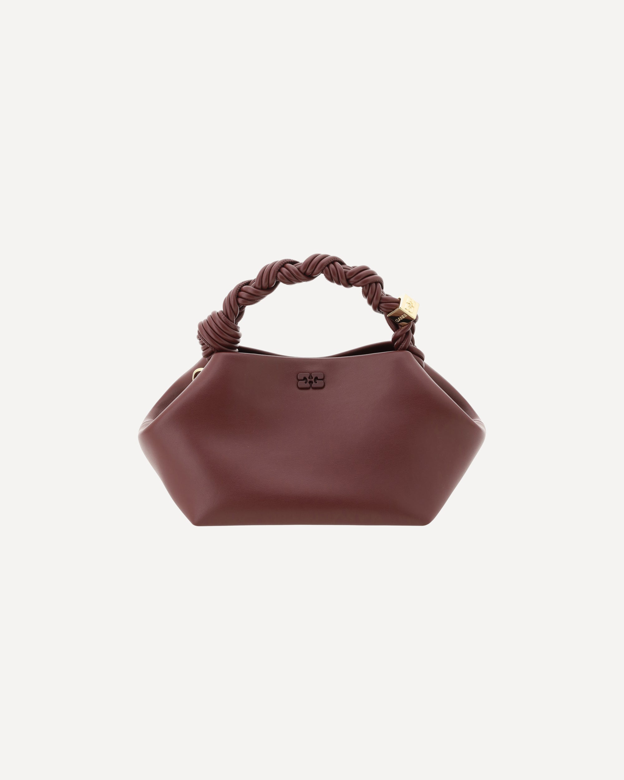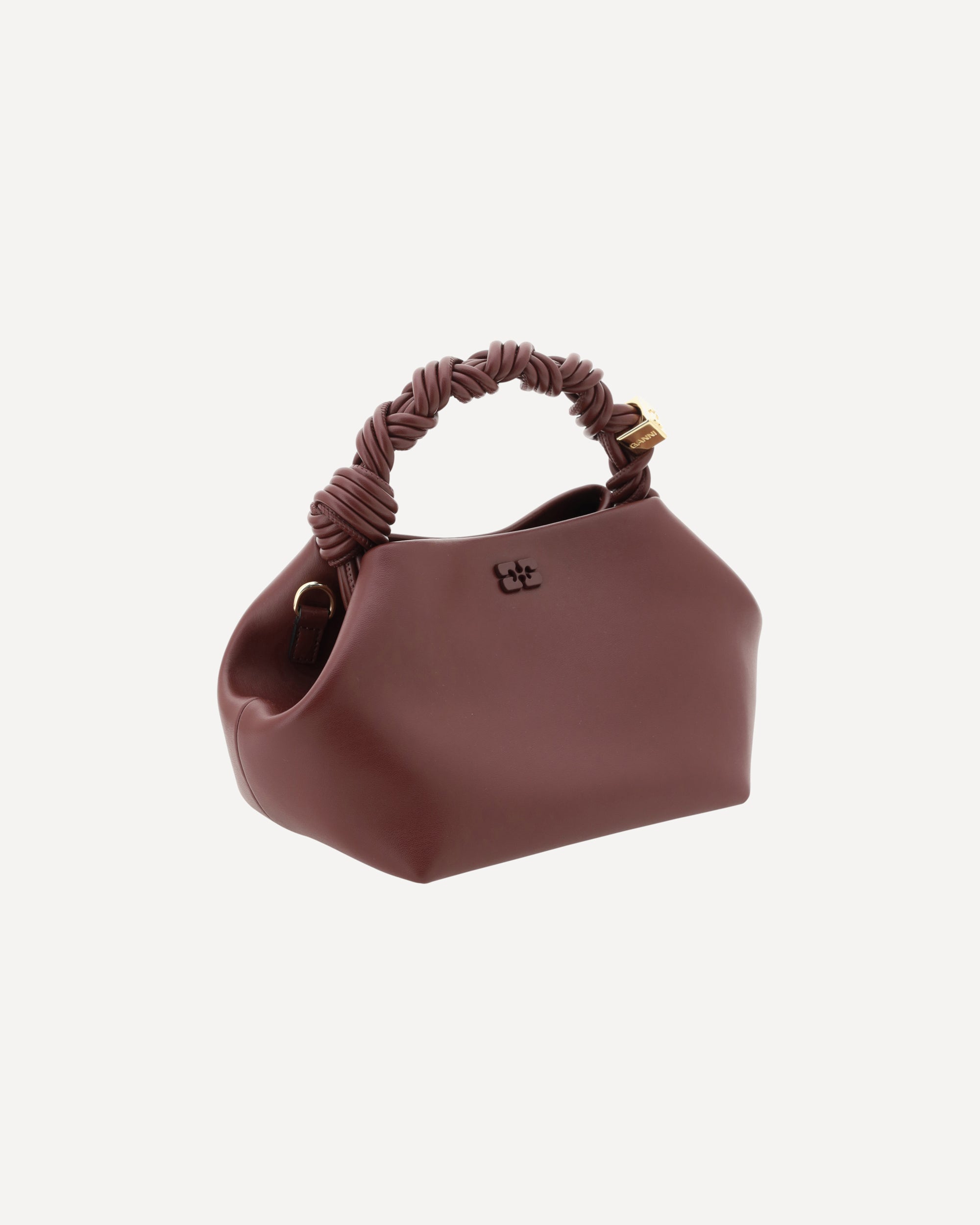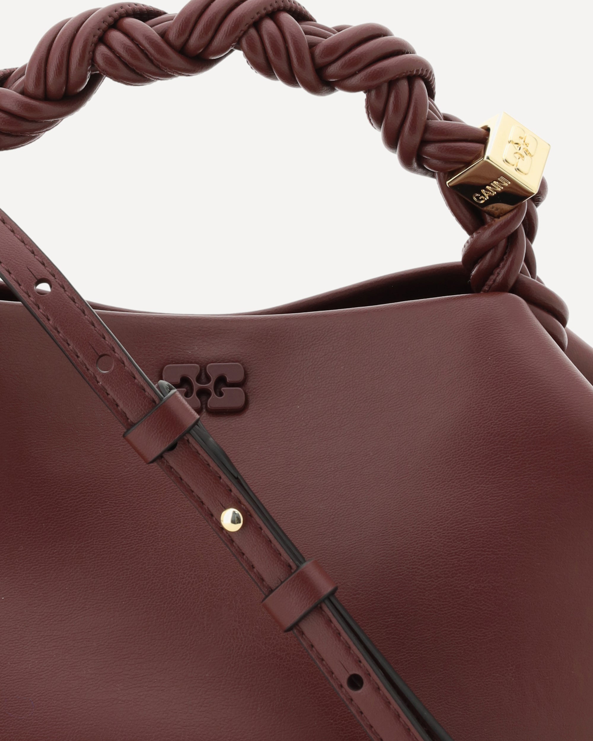Leather Bou Small Shoulder Bag by Ganni, braided handle, magnetic top closure, tone-on-tone plaque with iconic brand logo applique on front, dual compartments, an adjustable and removable shoulder strap, smooth leather design.