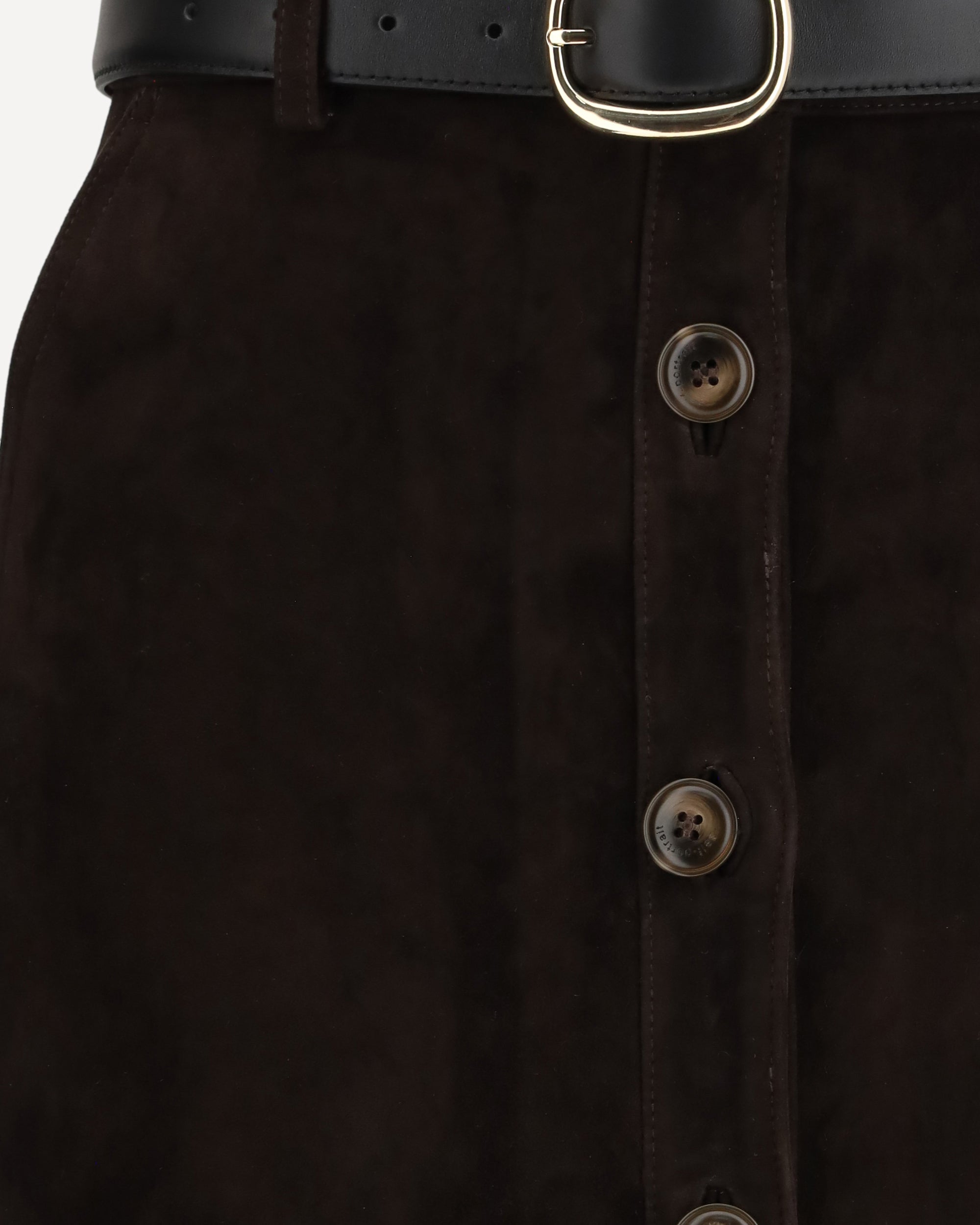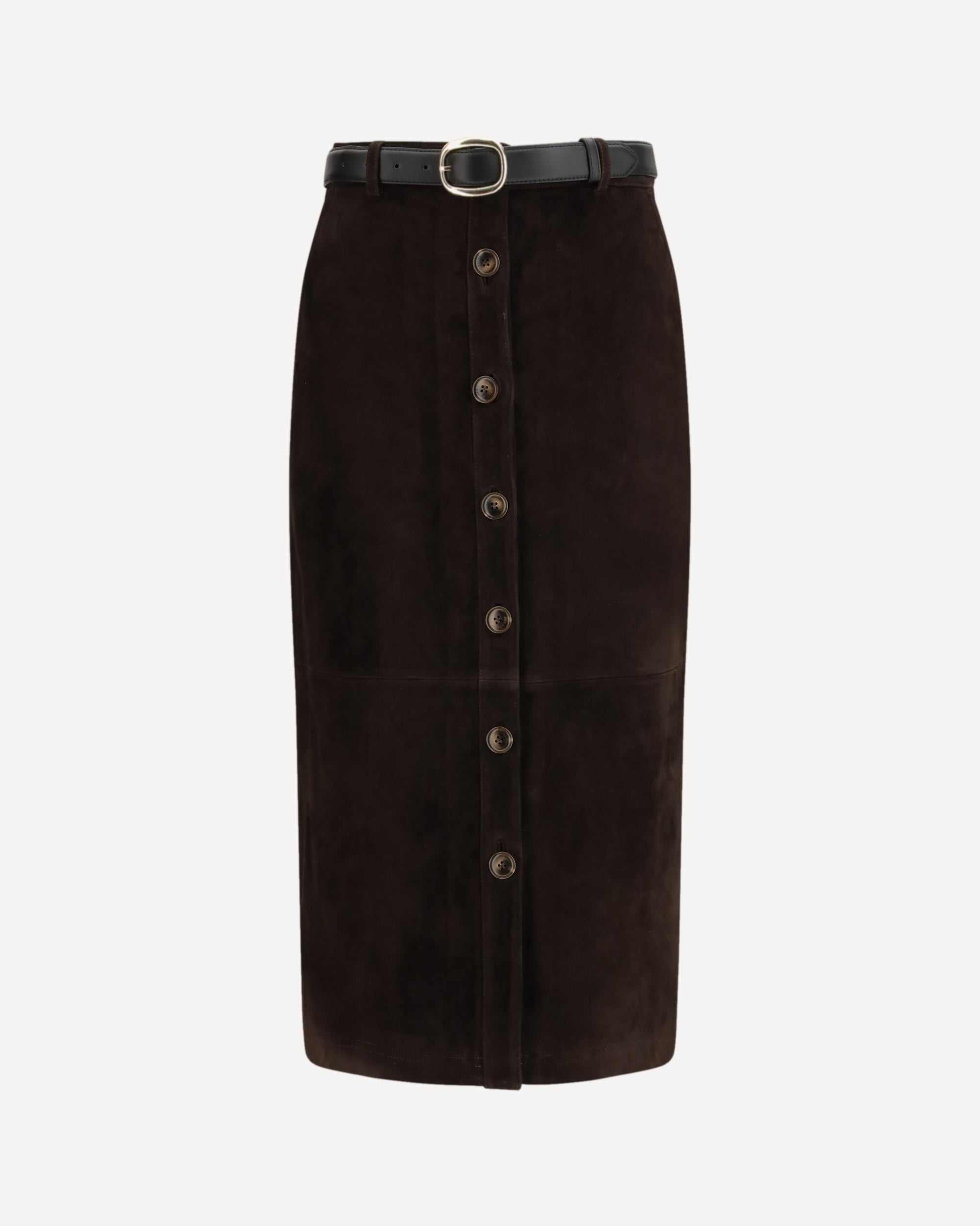 The suede midi Skirt by Self-Portrait blends the rich texture of suede with a tailored silhouette that channels effortless 70s boho flair. The fitted shape enhances the figure with understated elegance, while the front button closure and removable belt add versatility and definition. Finished with functional pockets, it’s a refined yet wearable piece, ideal with a cosy knit for daytime or styled with a blazer and boots for a chic office look.