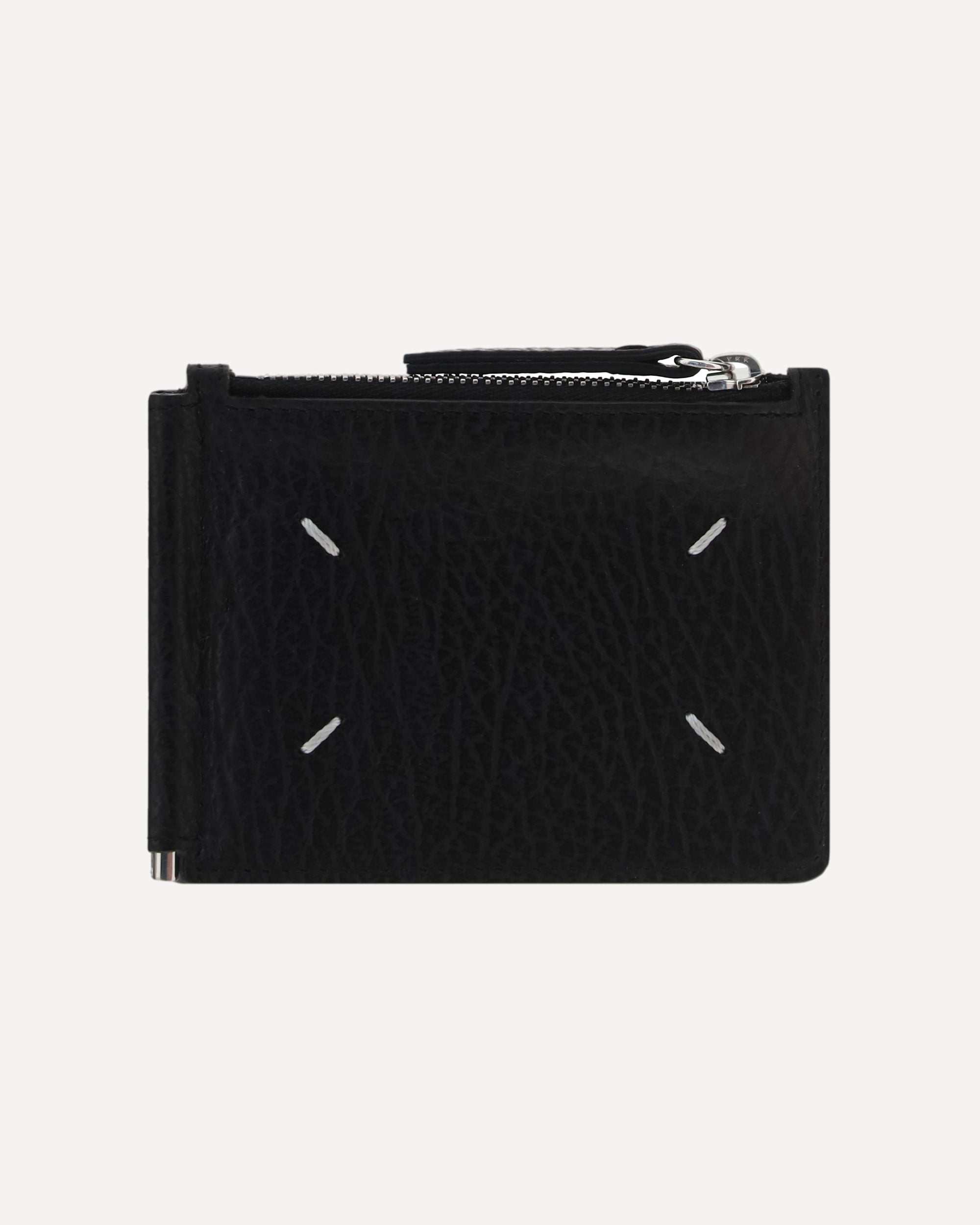 The grained leather Card Holder by Margiela combines practicality with distinctive style. The front features a card slot, while inside a zippered coin compartment provides security. The back is embellished with the brand's iconic contrasting embroidered logo, completing an elegant and recognizable design.