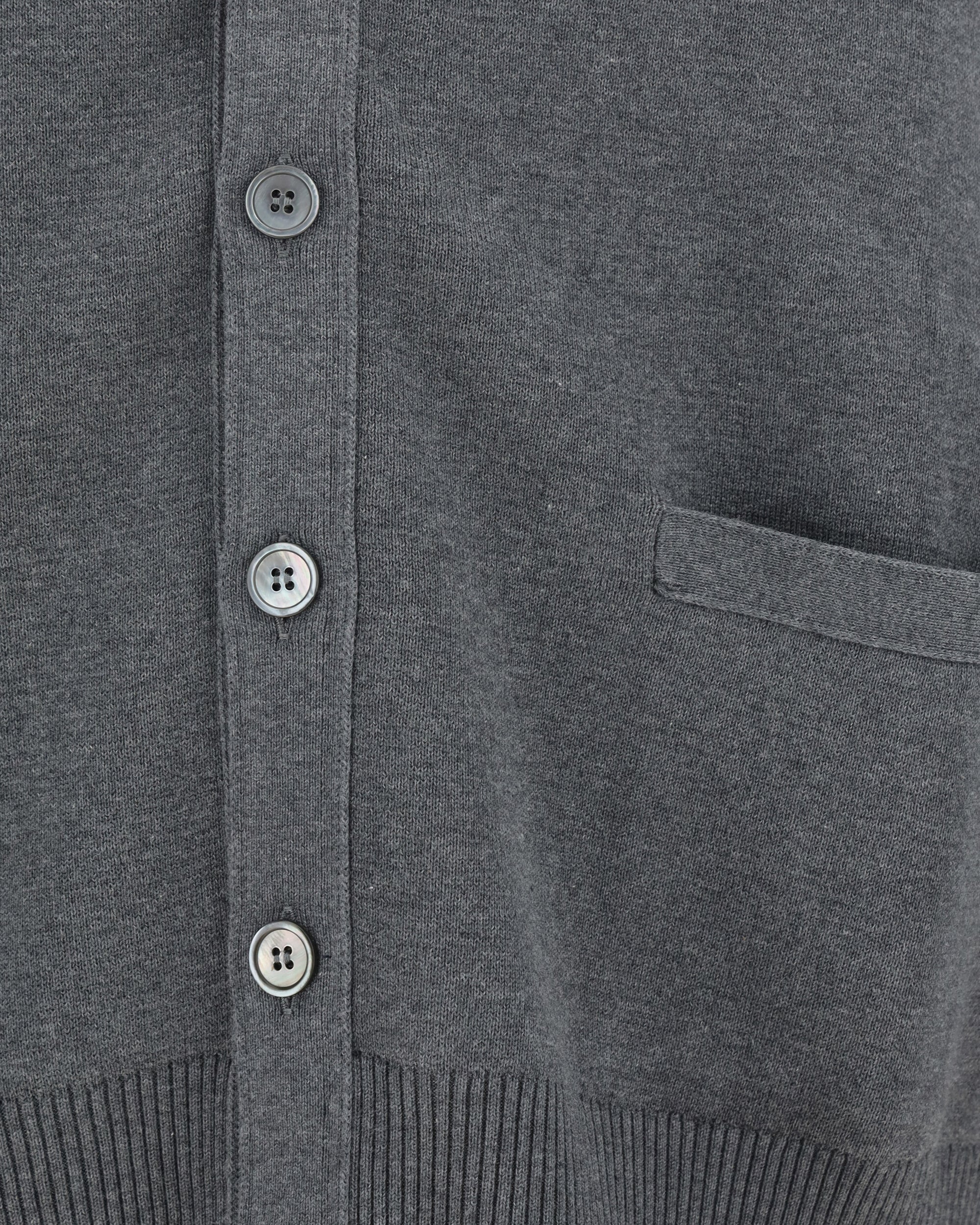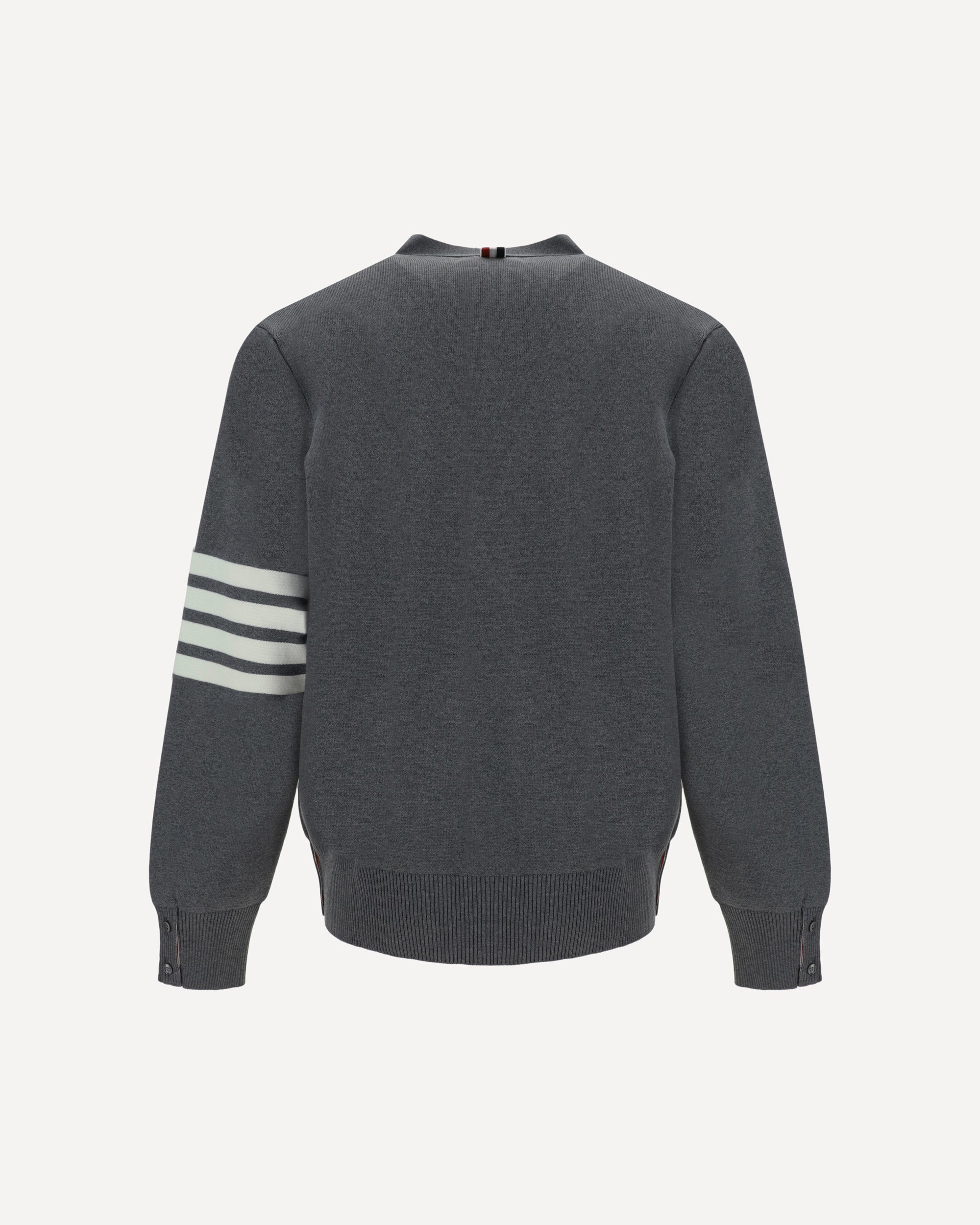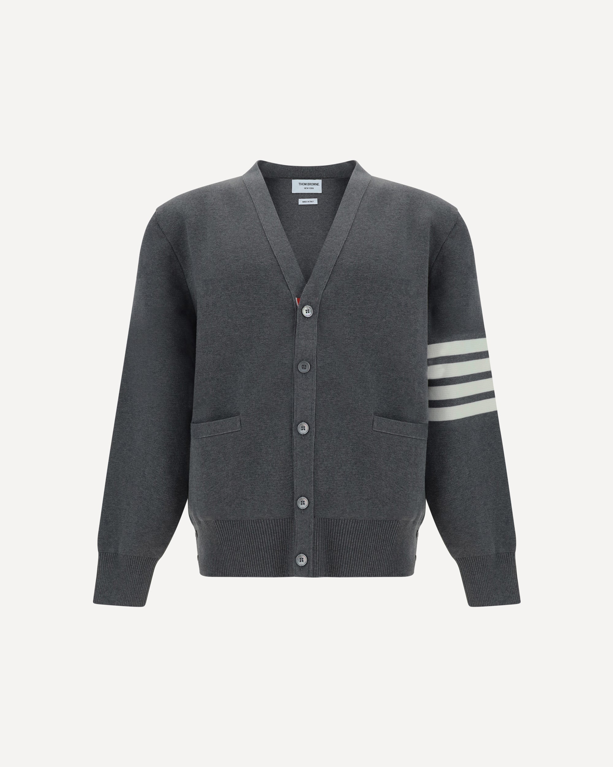 Cotton Cardigan by Thom Browne, contrasting button front closure, ribbed cuffs, ribbed front v-neck, two front slit pockets, ribbed hem, iconic contrasting brand bands on arm, regular fit.