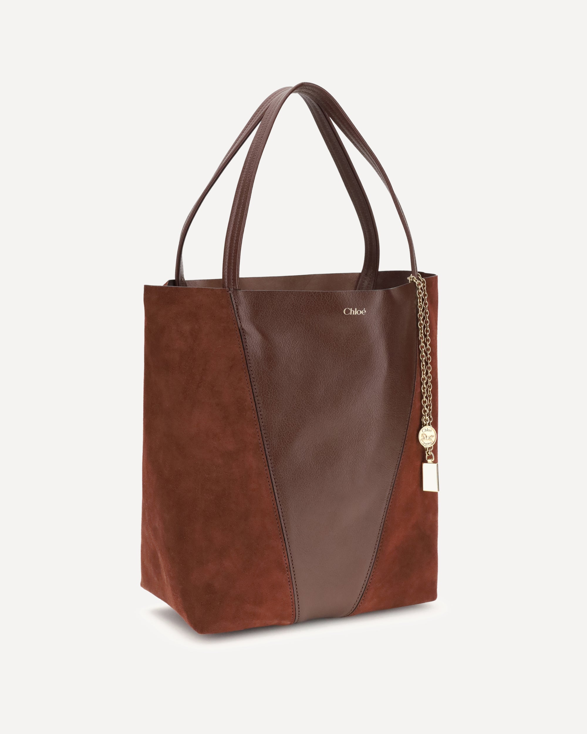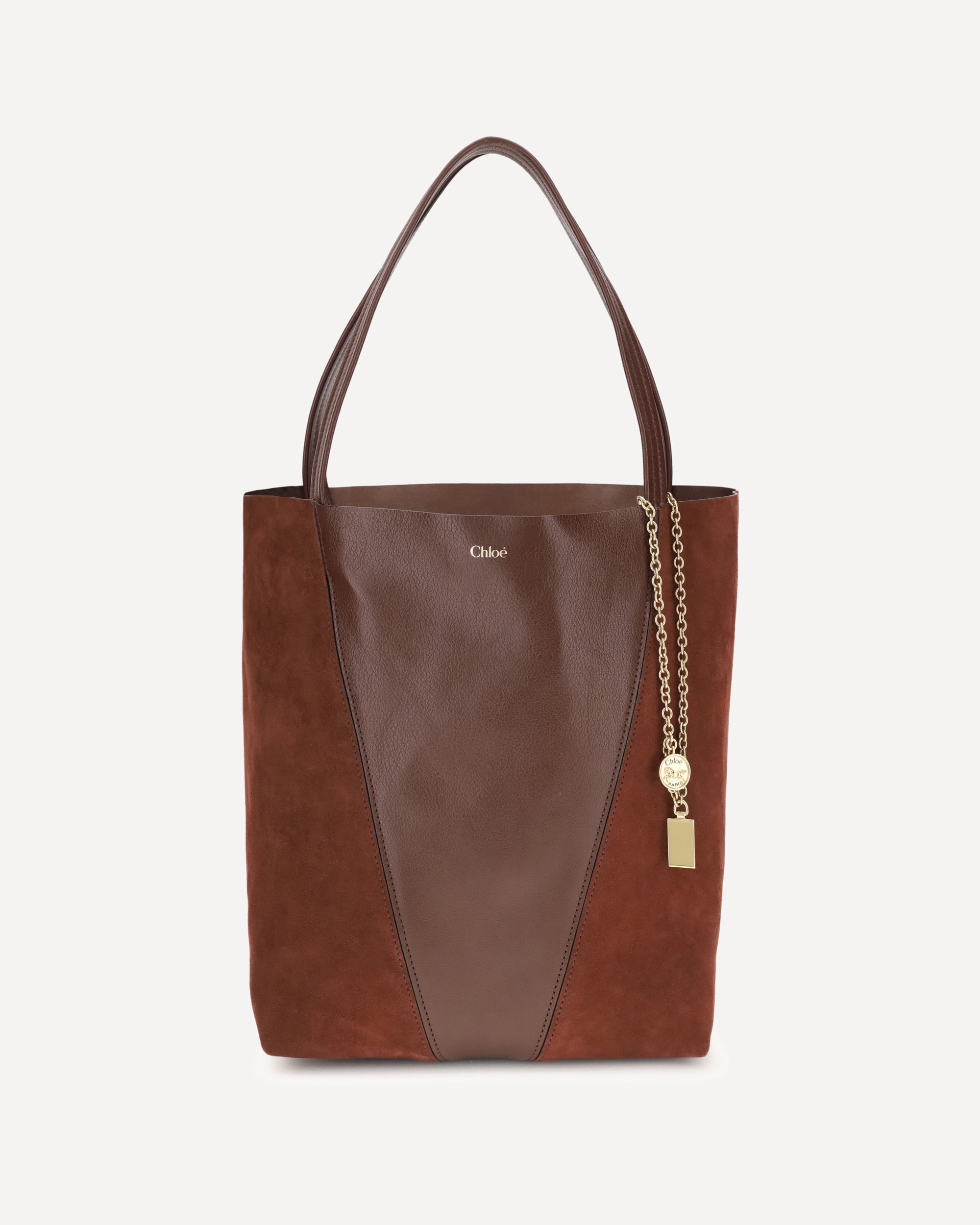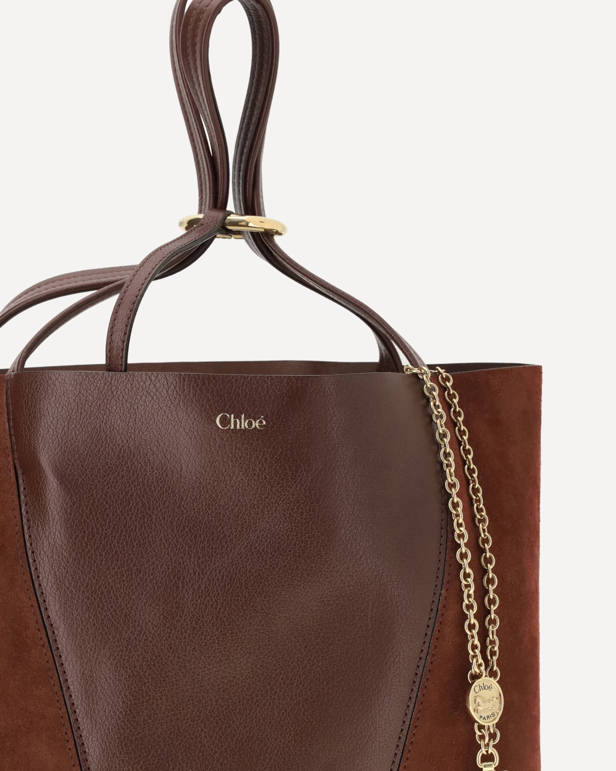 The Spin Shoulder Bag by Chloè captures the effortless elegance of the French Maison. Crafted from a refined combination of grained leather and suede, it features a subtle laminated logo on the front. Two flat leather handles enhance its everyday functionality, while a removable chain with charms lends a jewelry-inspired accent. Lightweight and unlined, it is the perfect companion for a day-to-evening look with timeless appeal.