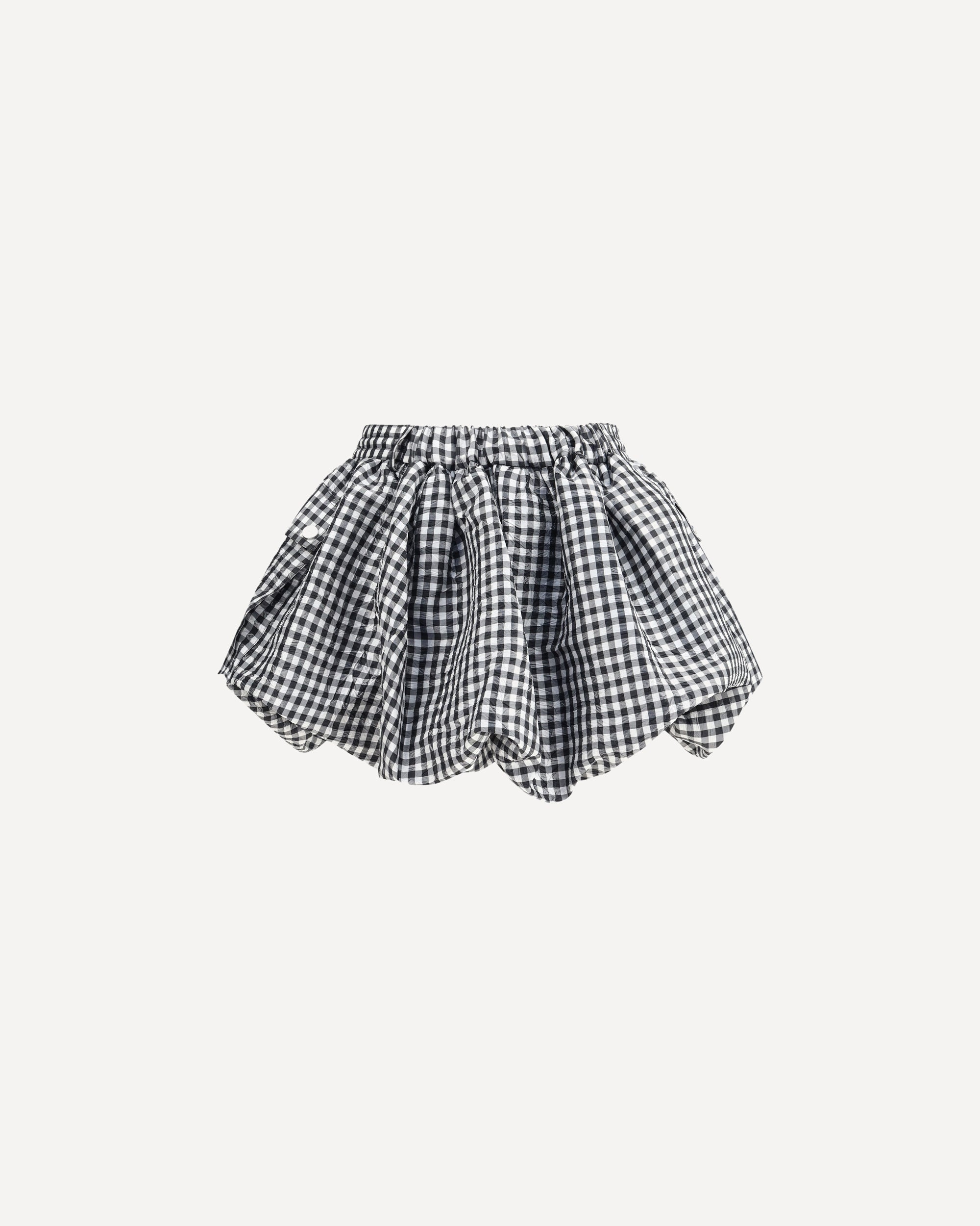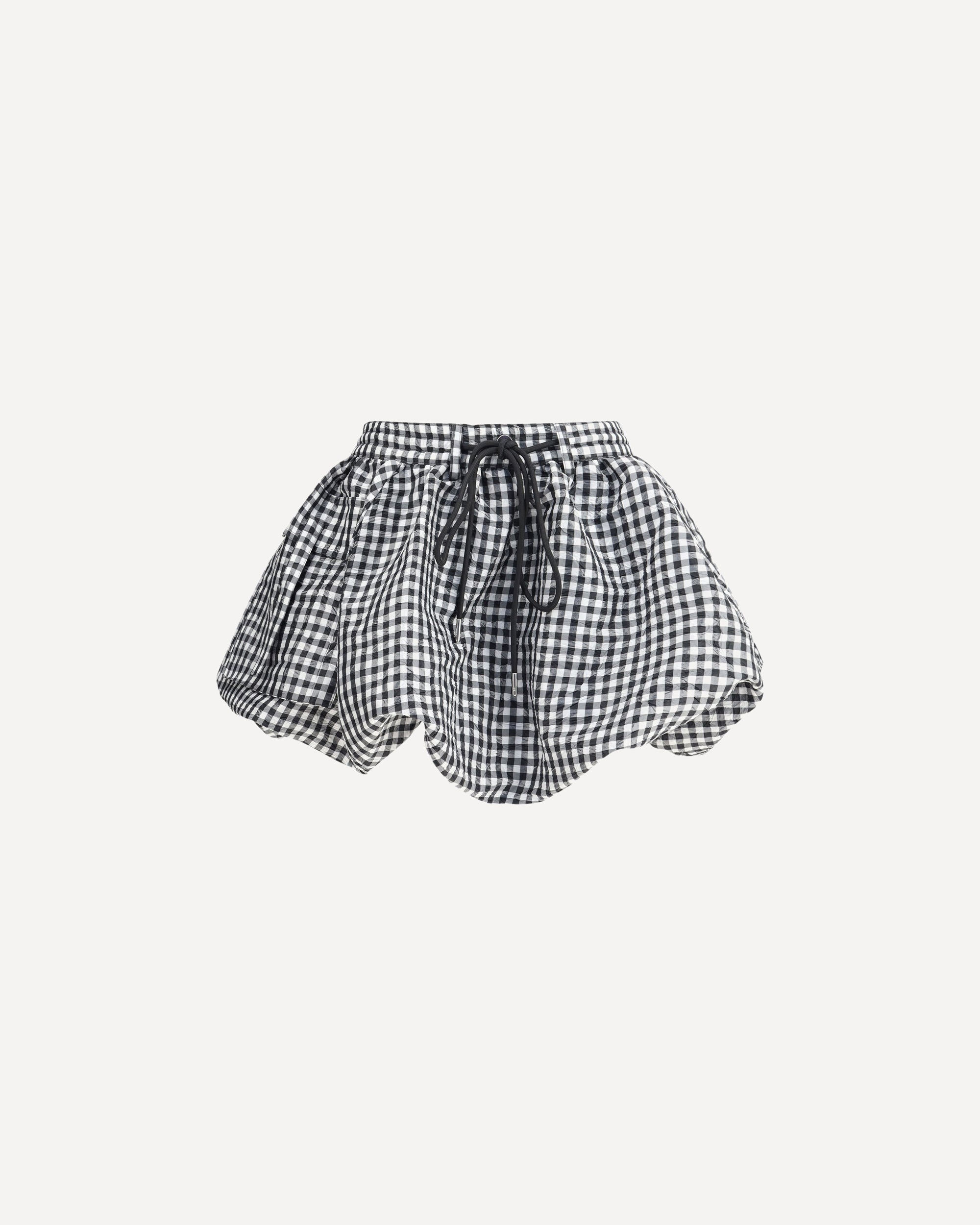 Ganni's balloon Miniskirt is an item with a playful and contemporary character. Crafted in a Vichy pattern, it features a voluminous silhouette that is adjustable at the front thanks to a drawstring. The front button closure, belt loops at the waist and two side flap pockets add practicality and style for a fresh and dynamic look.