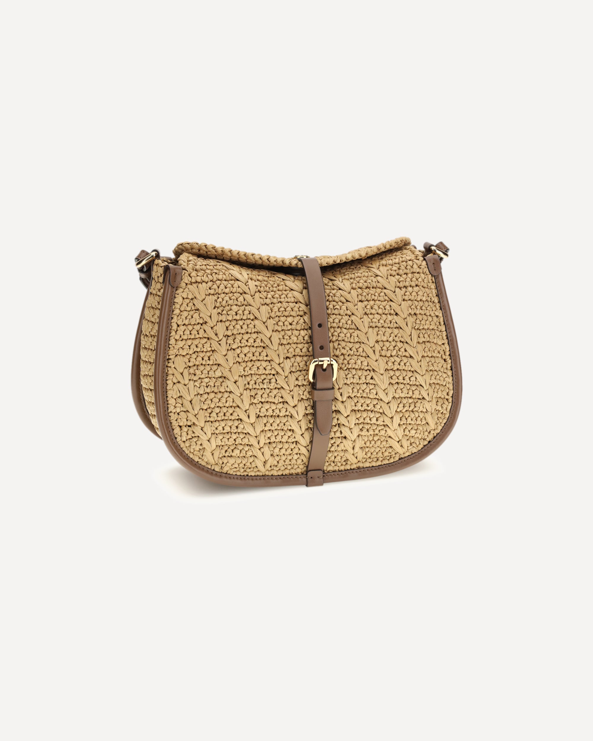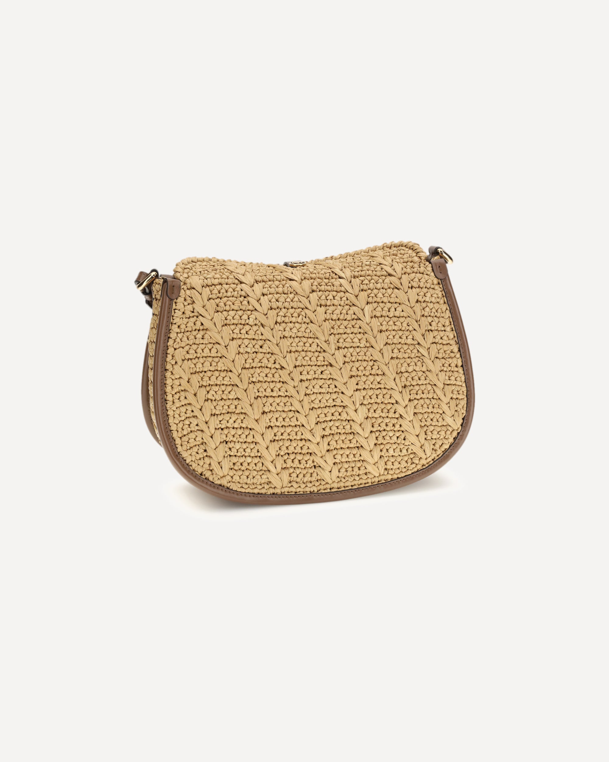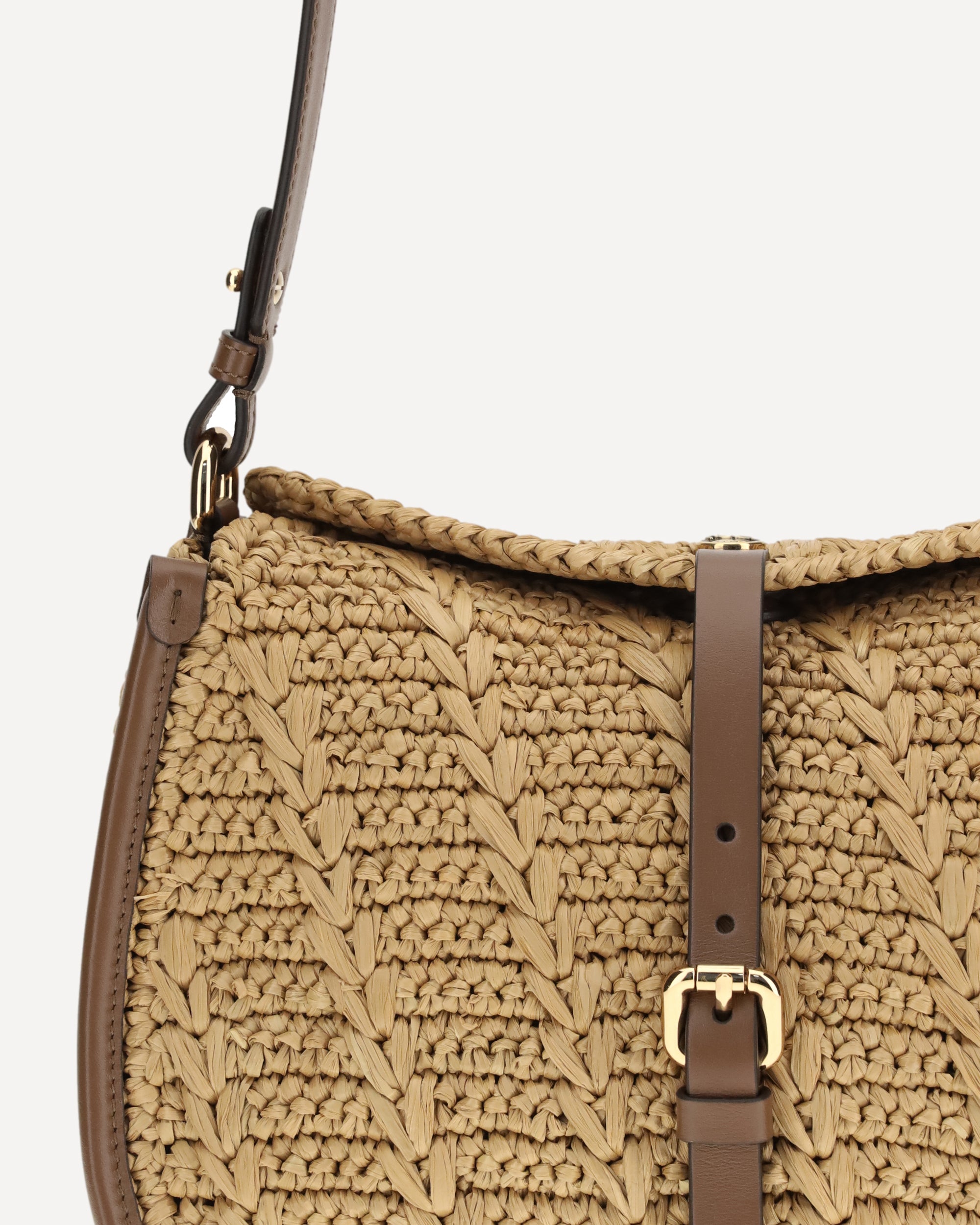 The Pony Shoulder Bag in crochet raffia by Etro expresses refined boho elegance. Featuring a double closure, it features a magnetic button decorated with the Pegasus metal coin and a secondary closure with a functional buckle. The model includes interchangeable handle and shoulder strap for hand, shoulder or crossbody carry, enhanced by Paisley detail on the snap hooks. A practical interior wall pocket completes the design.