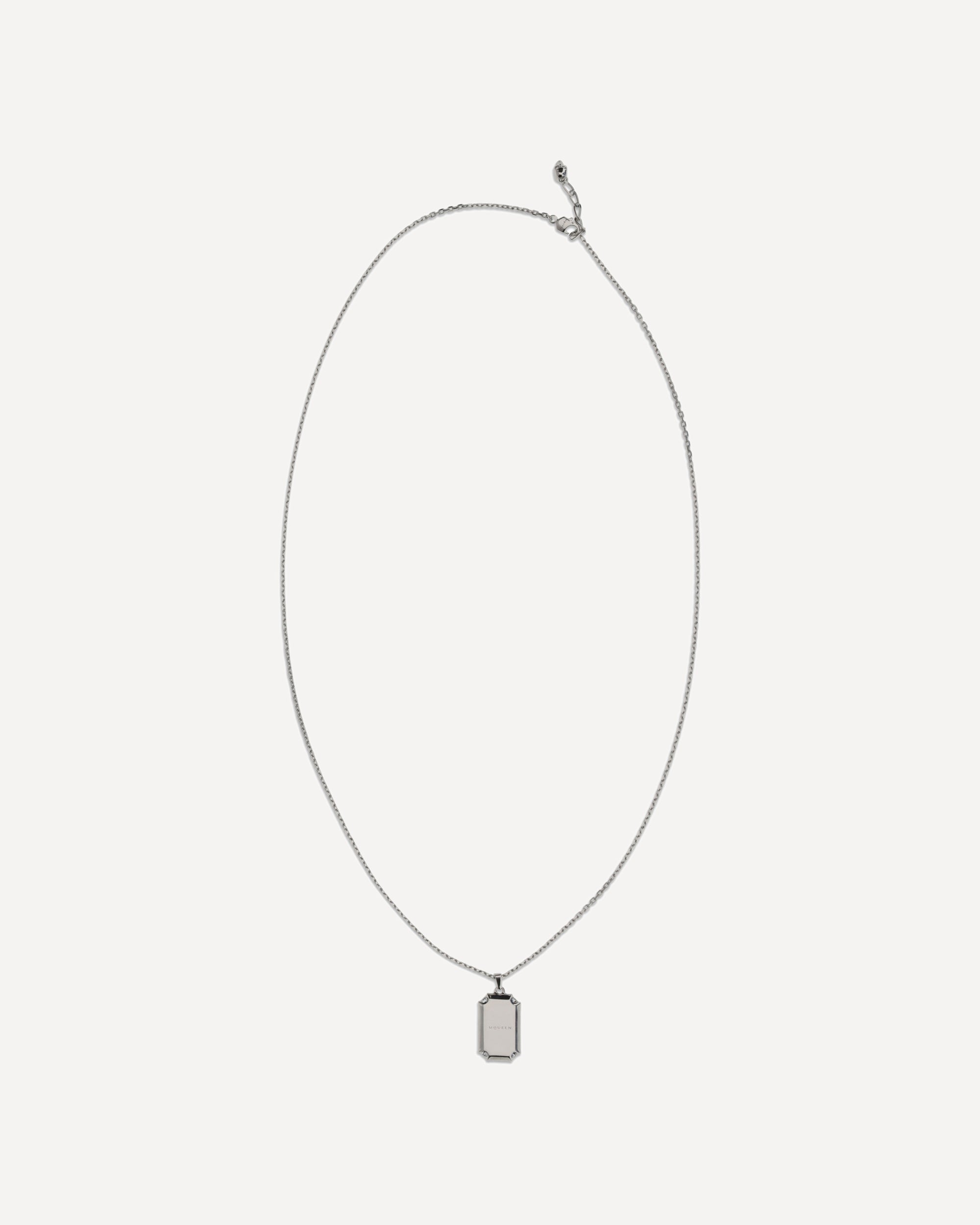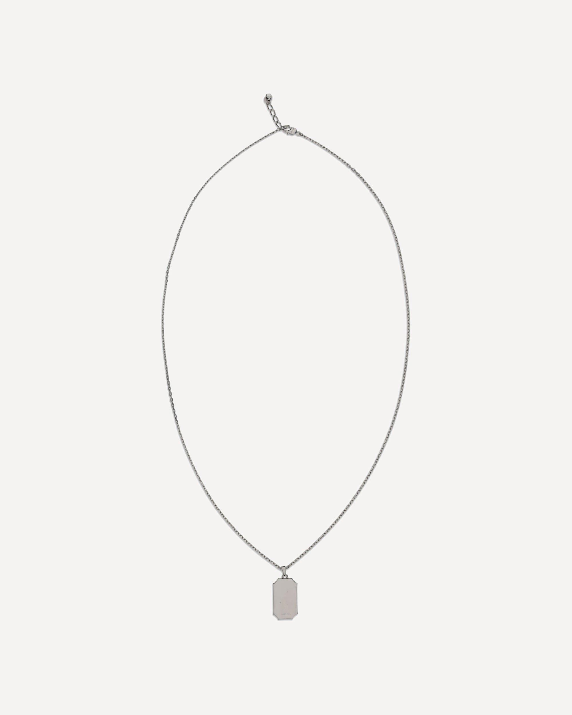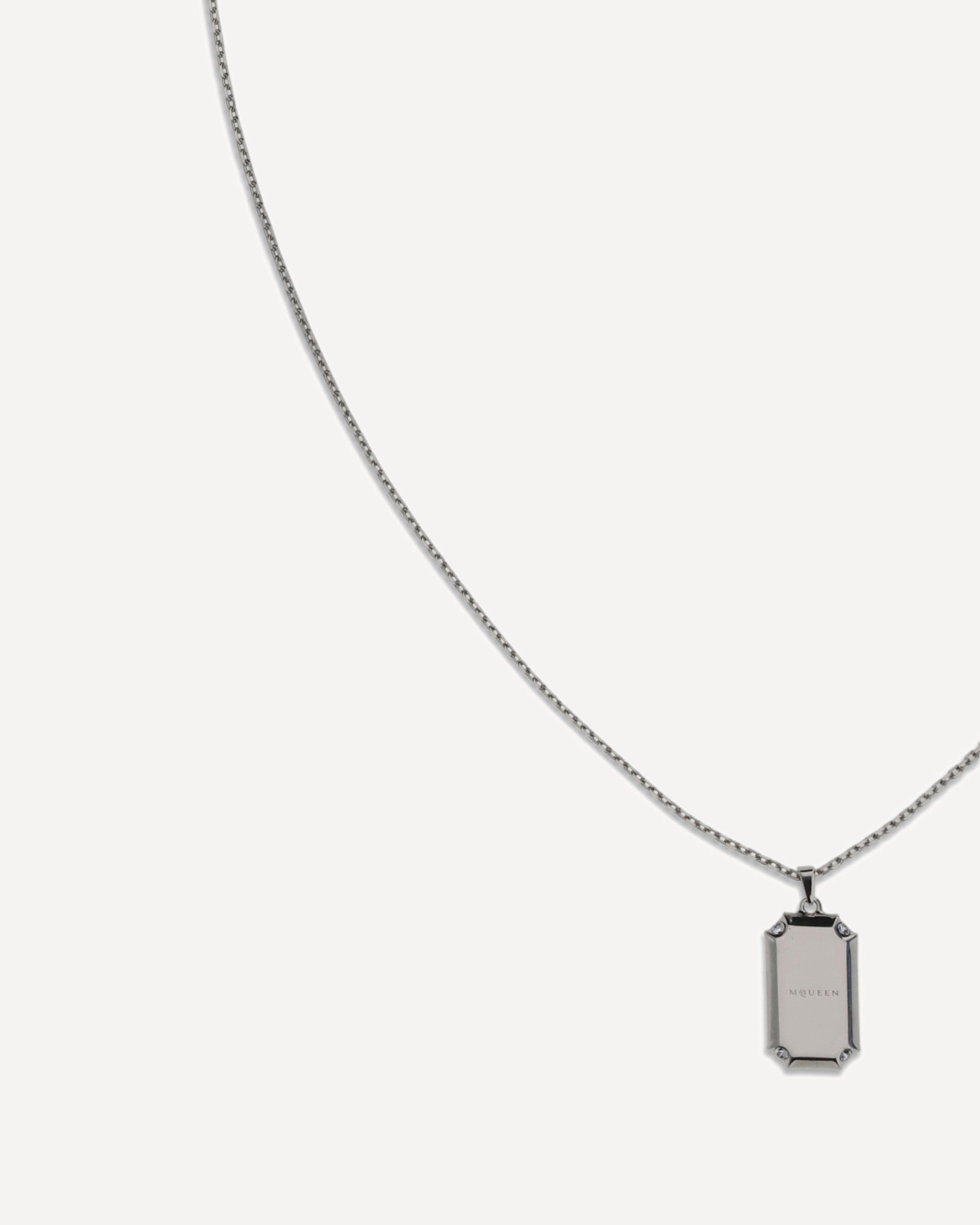 The Pendant Necklace by Alexander McQueen is an accessory with a bold and contemporary character. Crafted with a silver-toned, logo-embossed plaque, it stands out for its essential yet impactful design. The hook-and-eye closure ensures a practical and secure fit, while the engraved logo detail enhances the house's iconic aesthetic.