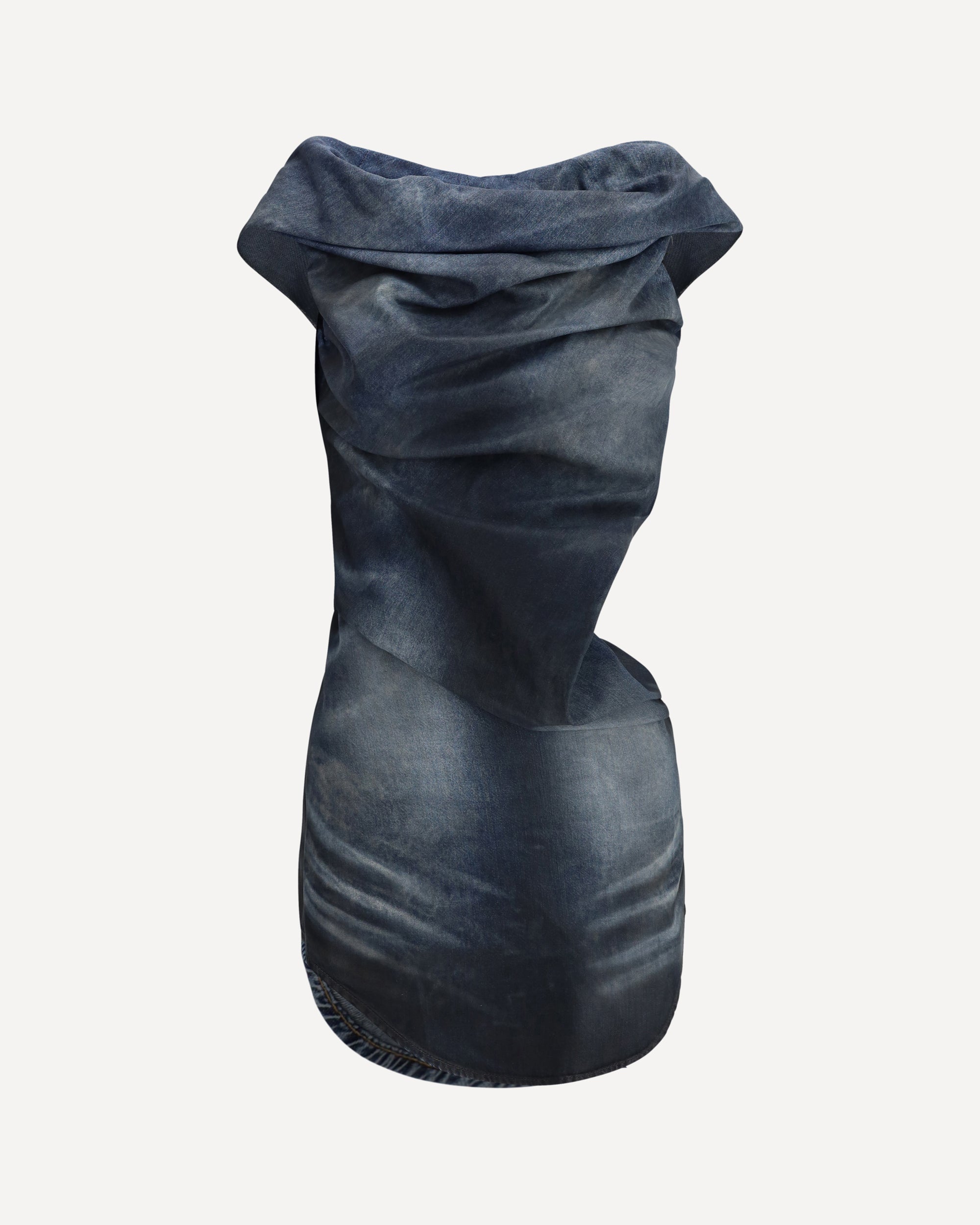 Diesel's De-brey-fsg cotton mini Dress is an elegant and innovative piece made with curved panels of lightweight denim that create an asymmetrical draped pattern, giving the dress a fluid and dynamic movement. The design leaves the back exposed, adding a sensual and sophisticated touch. The zipper closure on the side panel offers practicality and a close fit, enhancing the silhouette. A dress that combines modernity, style and a perfect balance between elegance and boldness.