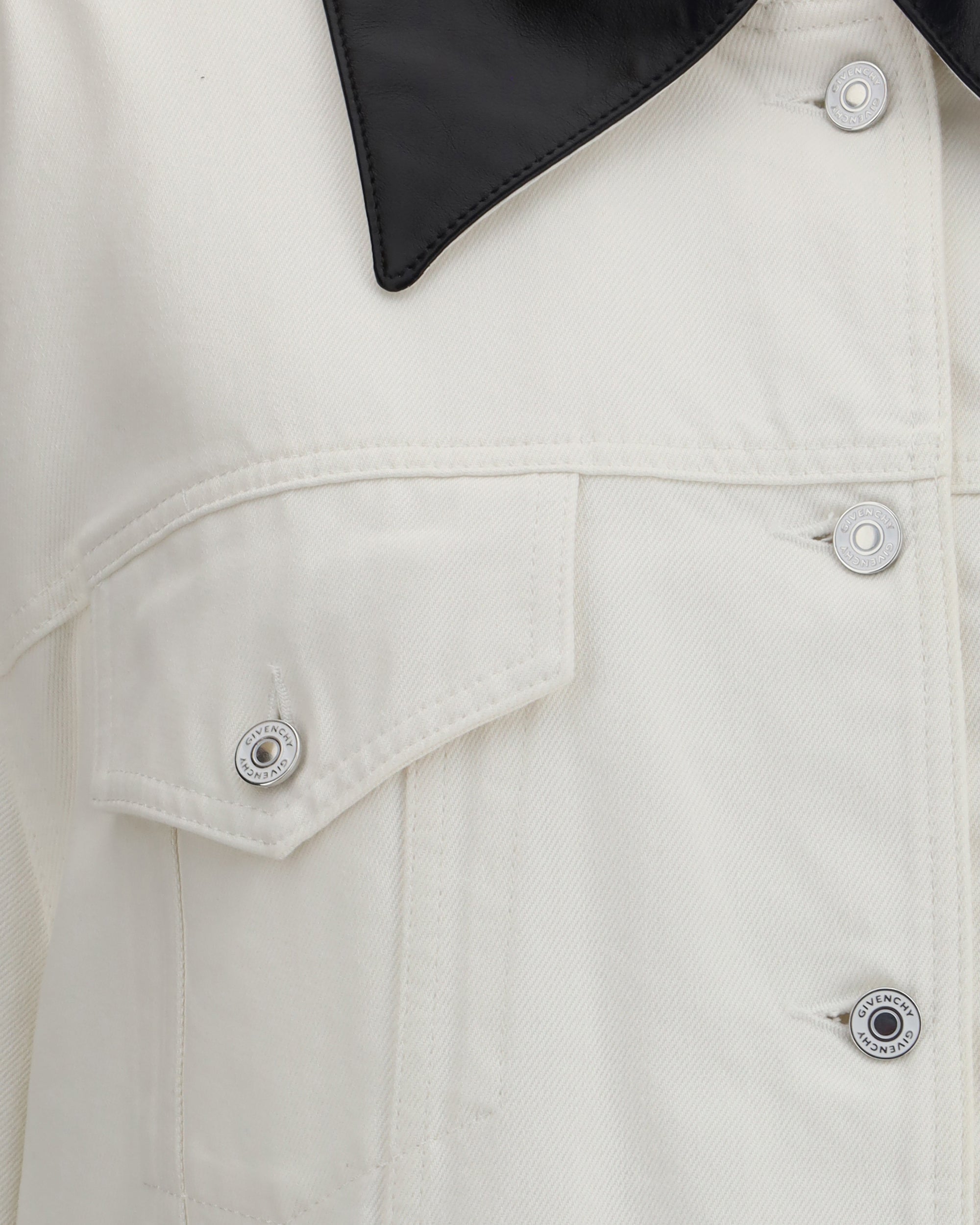 The Denim Jacket by Givenchy presents a classic leather collar and an oversized, contemporary silhouette. On the back, the denim appliqué with the logo adds an iconic detail. The front button closure with engraved Givenchy buttons, buttoned cuffs, and two chest flap pockets complete the design with a distinctive, urban touch.