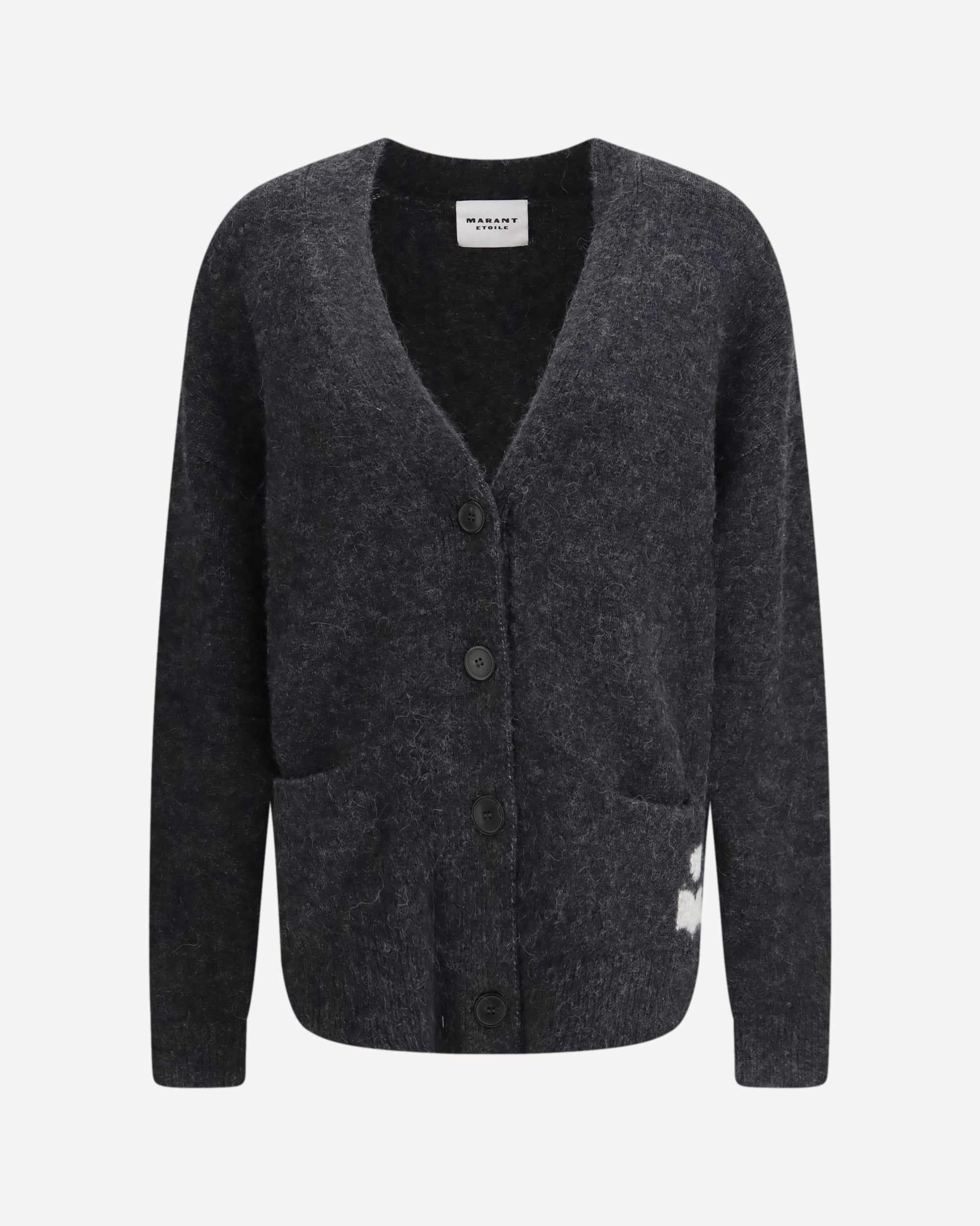 The Eborah Cardigan in alpaca blend by Marant Étoile combines comfort and character in a contemporary design. Crafted from a soft, enveloping yarn, it features a V-neckline and a front button closure. The contrasting embroidered logo at the hem adds a distinctive touch, while the two front slit pockets enhance its practicality. Ribbed cuffs and hem complete the look, finished with an oversized fit that makes it ideal for relaxed layering.