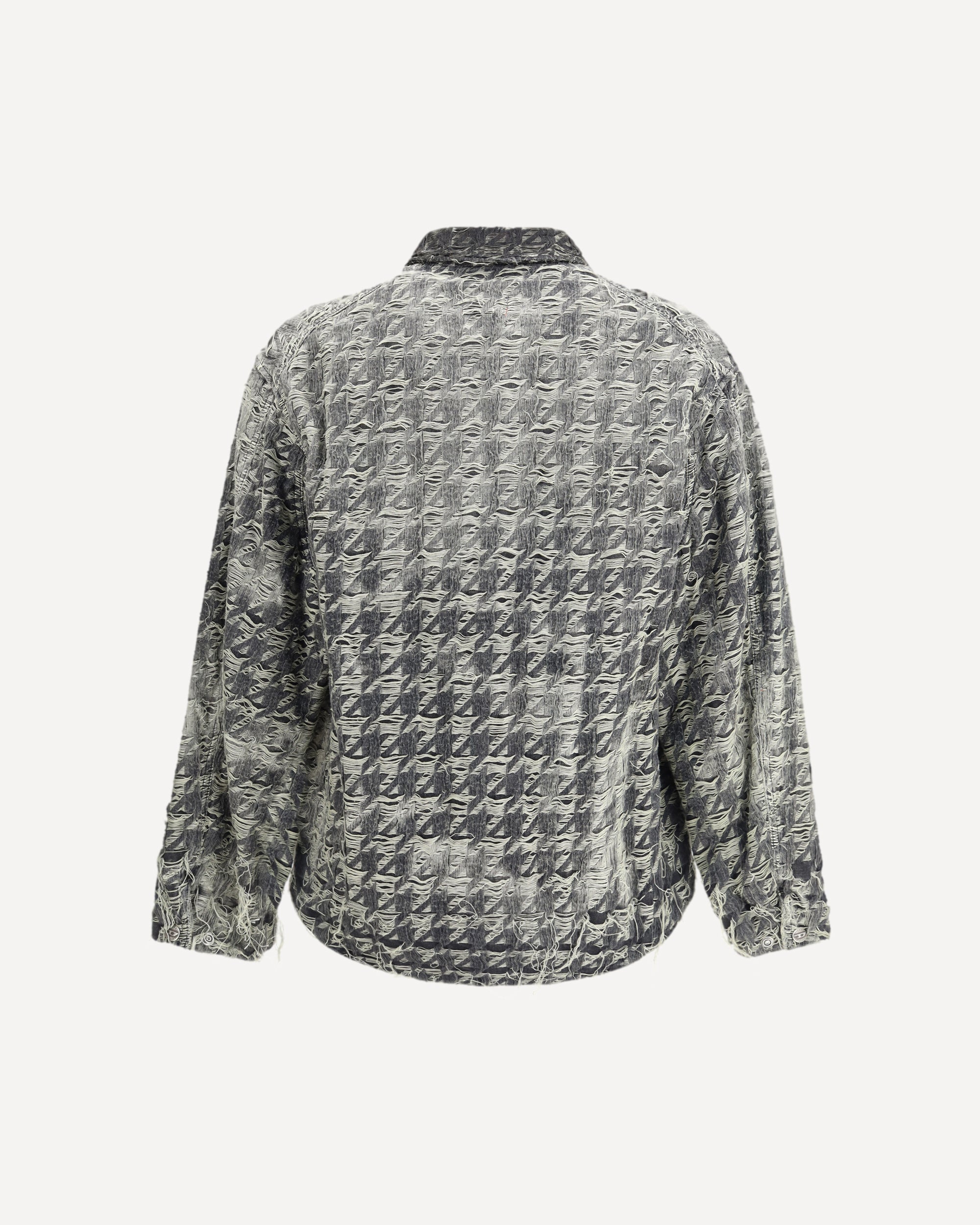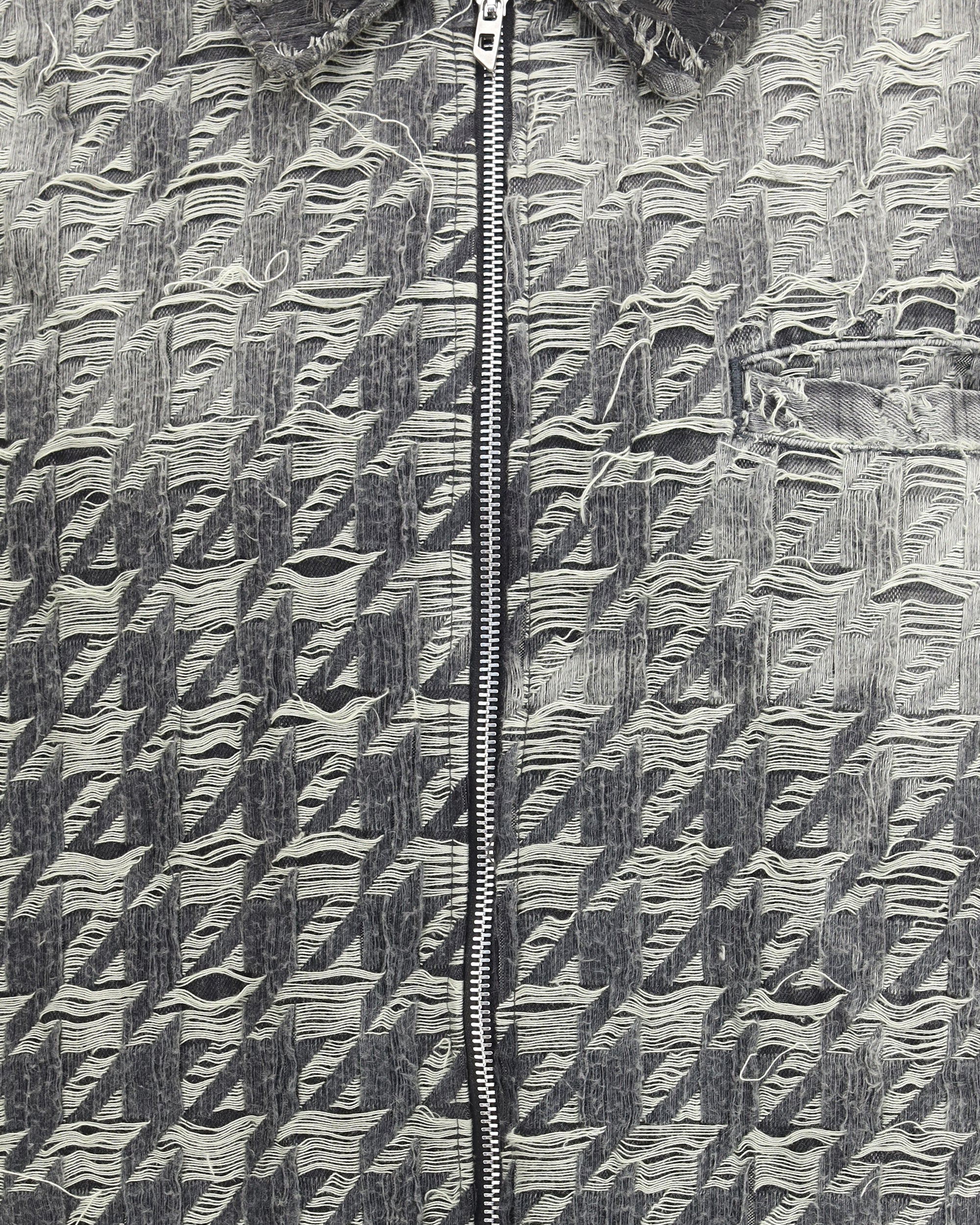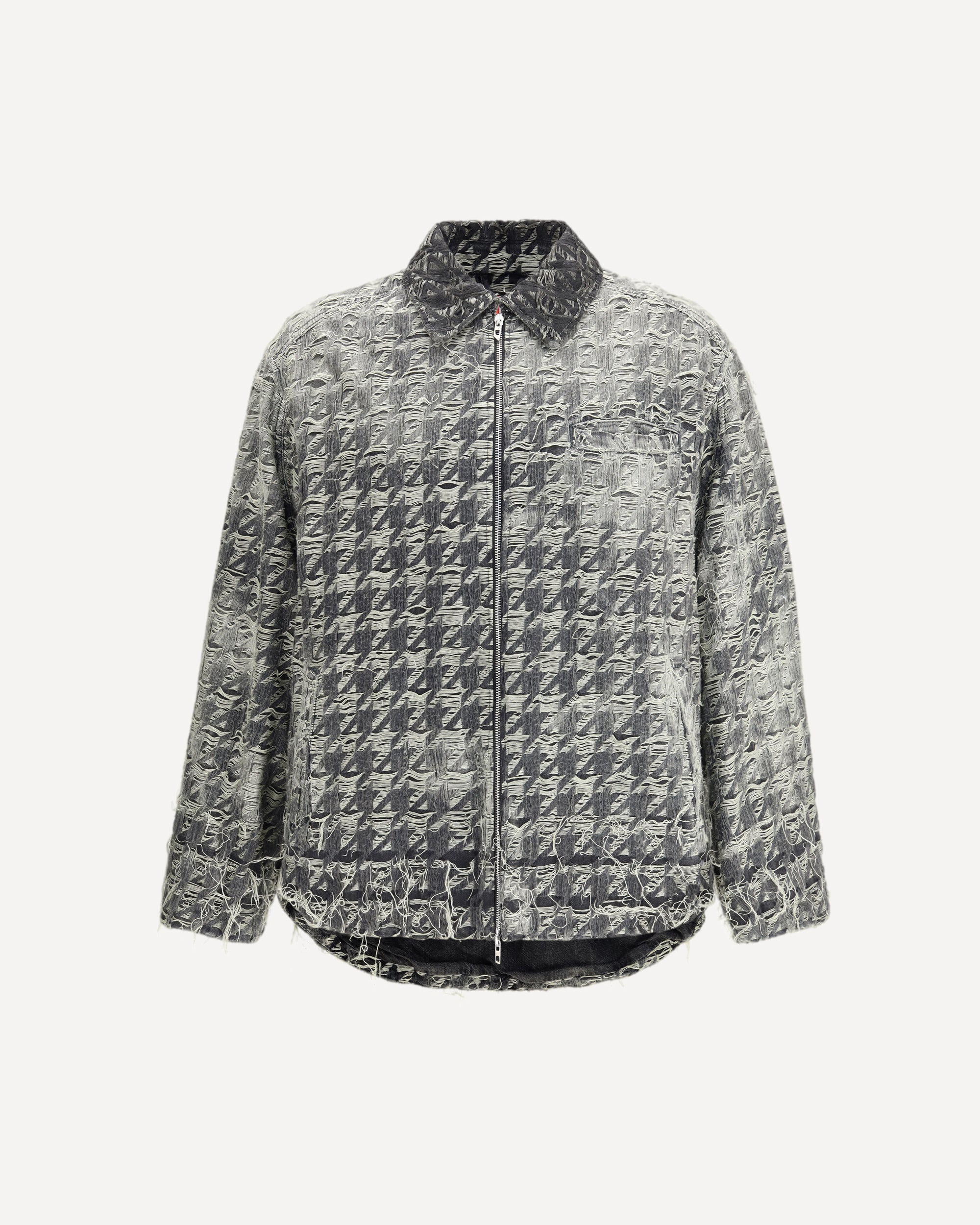 The D-ELMO-FSH Jacket by Diesel, a key piece from the Runway Show, is crafted from 100% cotton denim featuring a striking houndstooth pattern in black and grey tones. Designed with a relaxed straight-cut silhouette, dropped shoulders, and a shirt-style collar, it’s finished with a metal zip closure and D-shaped pullers. Laser techniques, burnt effects, and floating threads add a tactile texture and depth to the fabric, showcasing Diesel’s unconventional creativity and innovative craftsmanship.