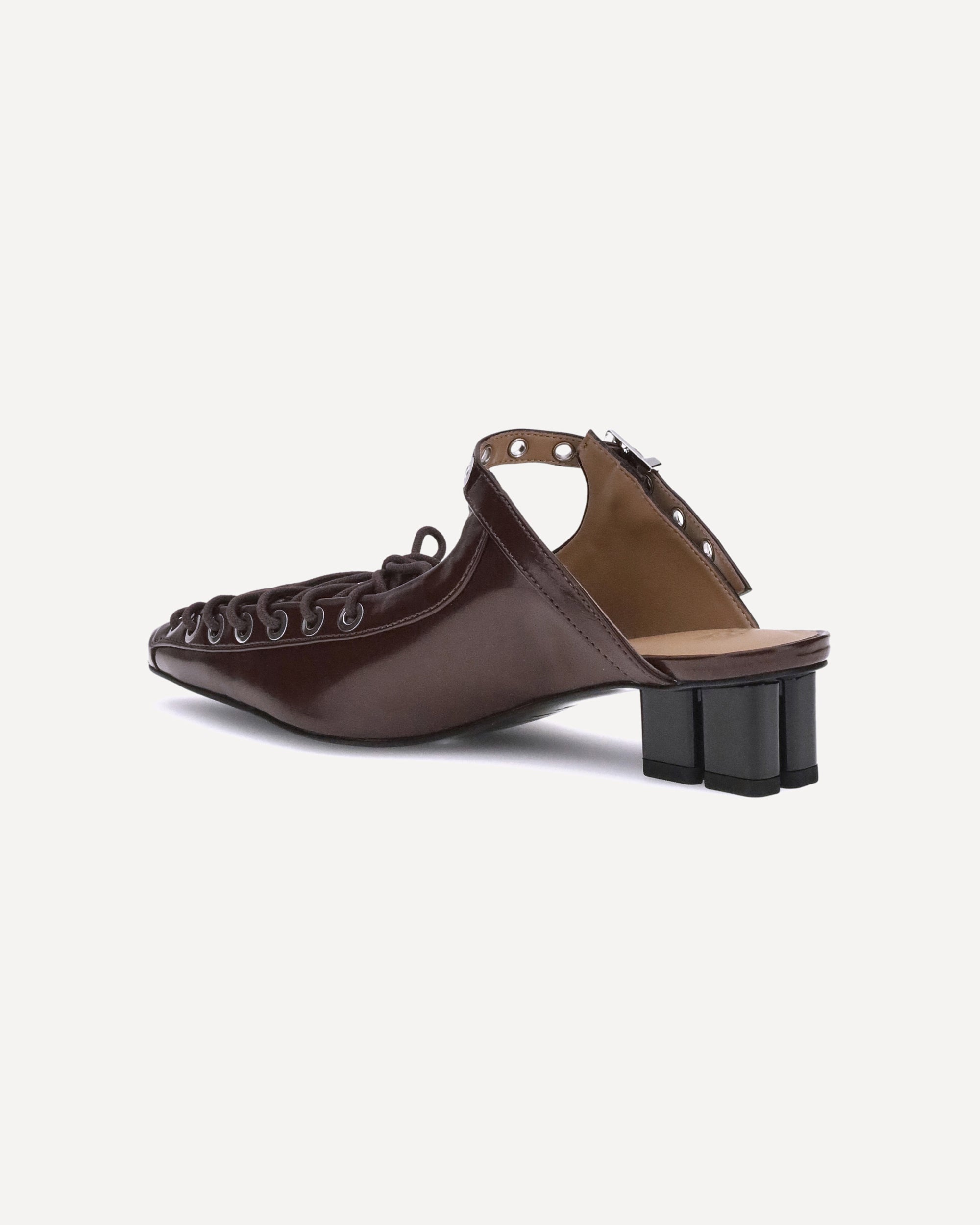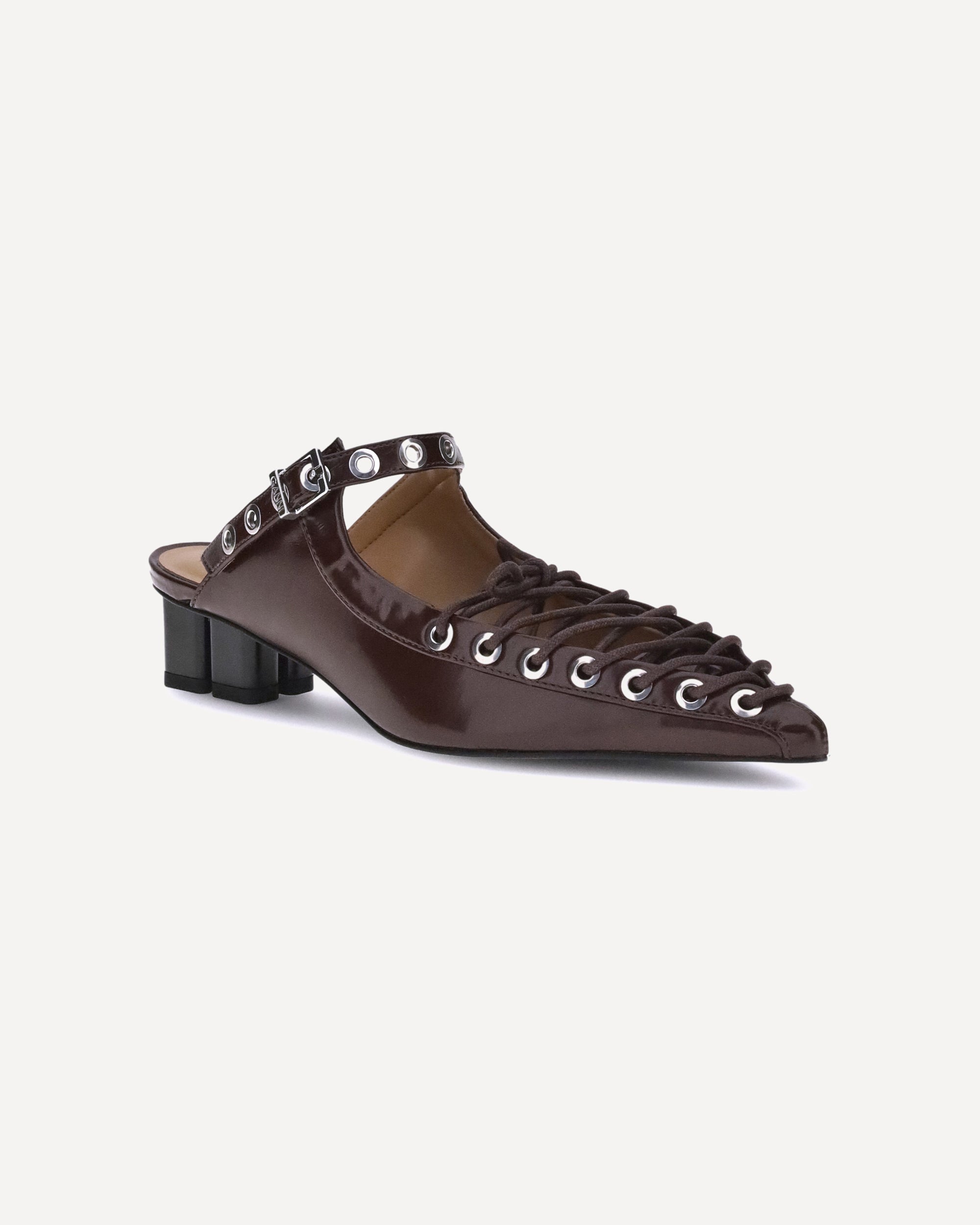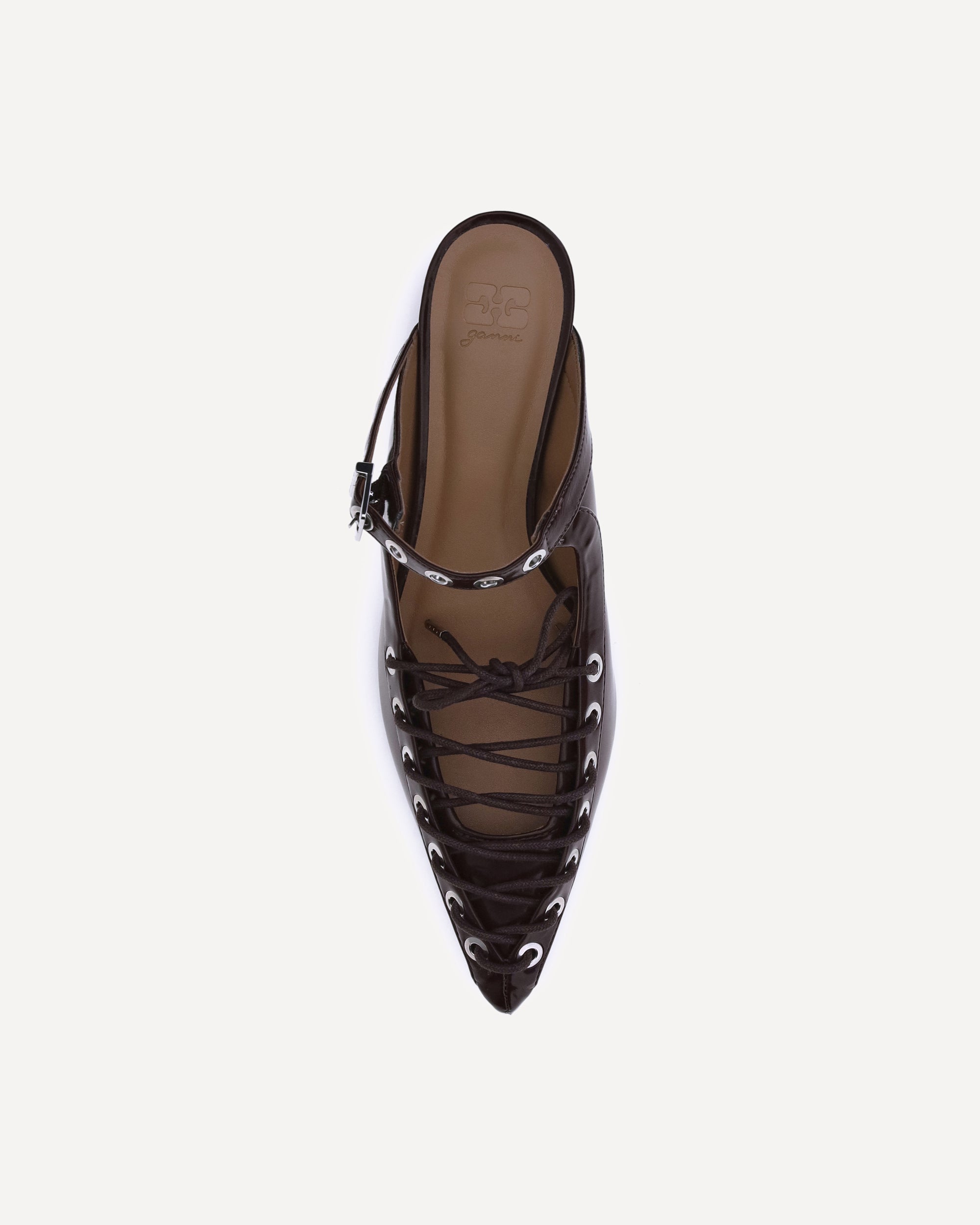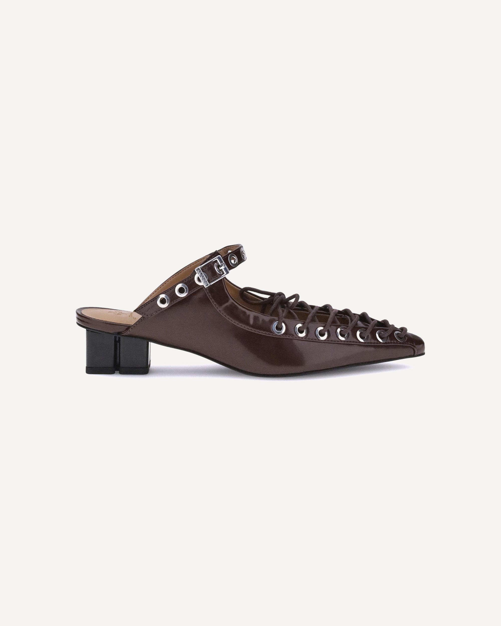 Ganni's Oleatex laced Mules are inspired by the lace-up boots of the 1920s, combining nostalgia and contemporary appeal. Made of crinkled Oleatex Fabrics of the Future, they feature metal eyelets, waxed crisscrossed laces, a long tapered toe, and an iconic mini heel with a GANNI butterfly logo and chrome finish for a distinctive, modern touch.