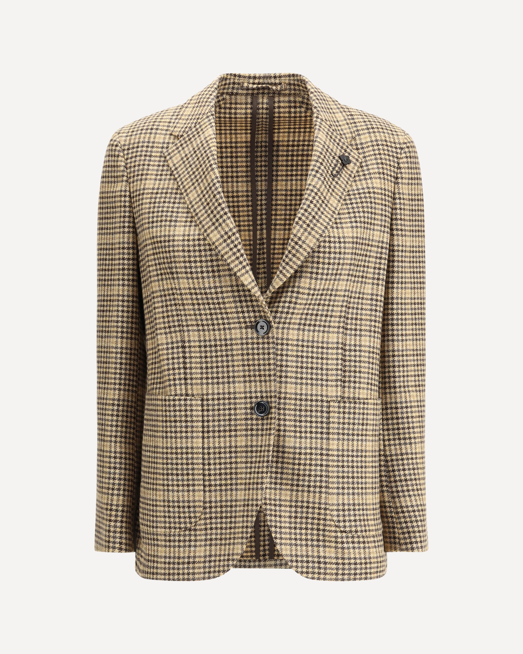 Lardini's Houndstooth Blazer is an elegant and contemporary piece perfect for those who love a refined yet timeless style. Featuring a single-breasted button closure and a classic lapel embellished with the iconic pin brooch, it has two patch pockets and unlined construction for a lighter, more natural look. A versatile piece that blends tradition and modernity with ease.