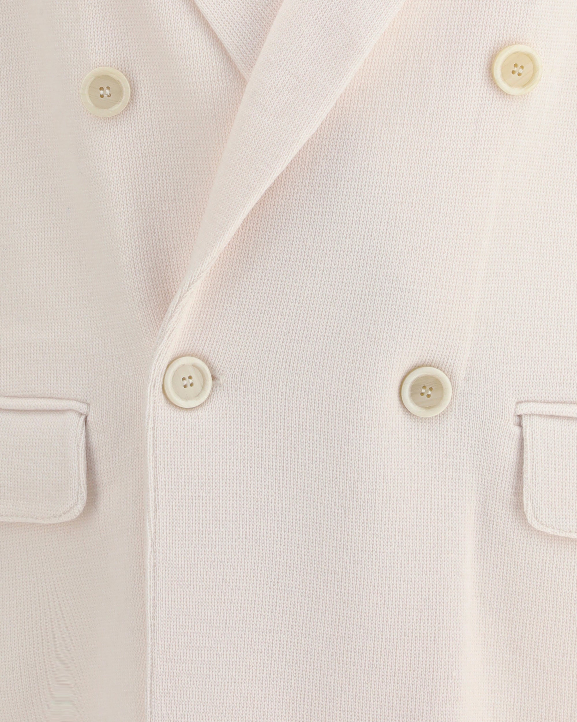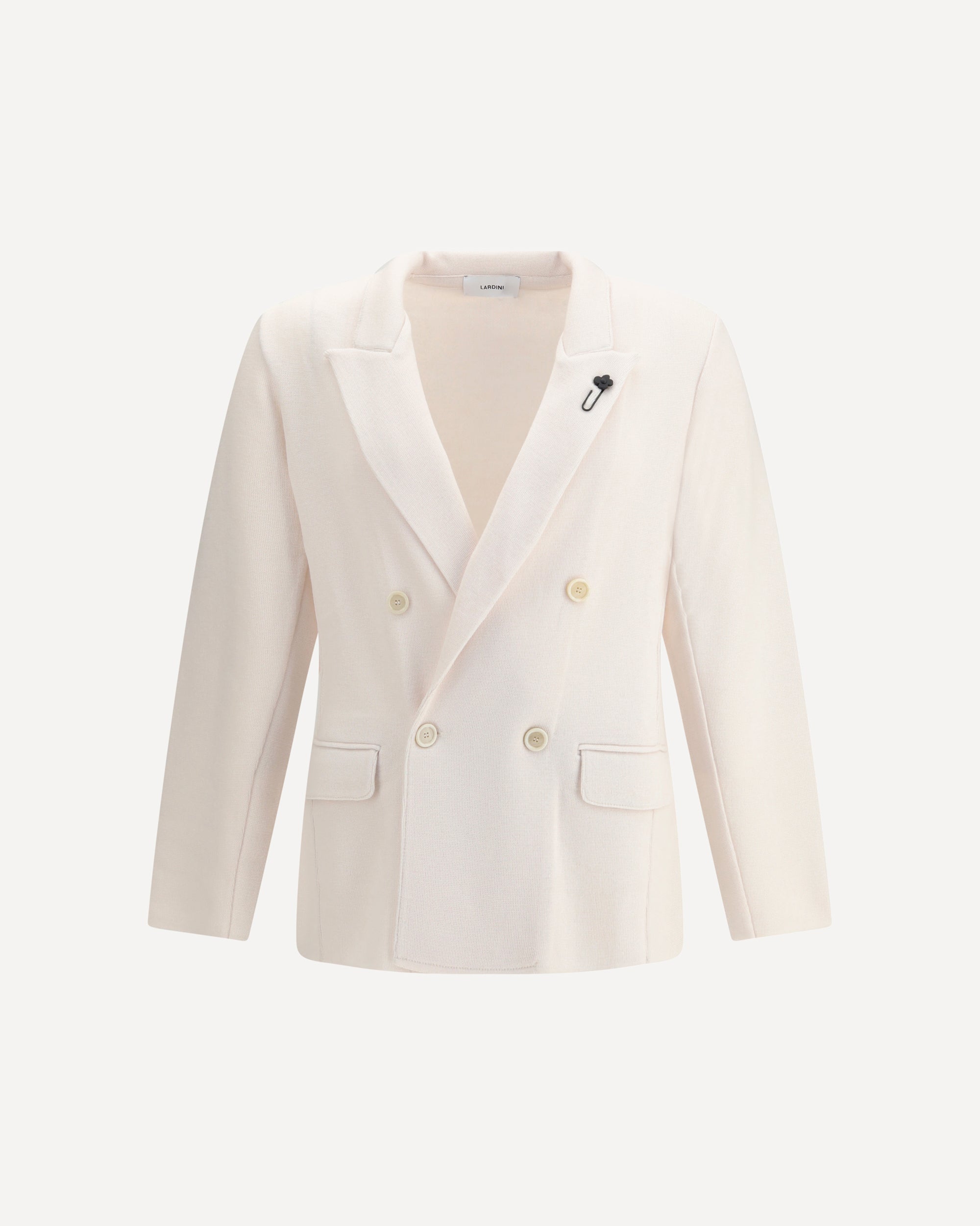The double-breasted knit Jacket by Lardini combines artisanal tradition with contemporary refinement. The design with peak lapels, four metal buttons, and flap pockets defines a balanced and sophisticated silhouette, enhanced by side vents that offer ease of movement. Crafted from an exclusive fabric with flat rib stitch and 12-gauge finish, it features a carded yarn certified RWS and free from mulesing — a testament to quality and ethical craftsmanship. A piece that embodies conscious elegance, where knitwear becomes a true expression of sartorial style.