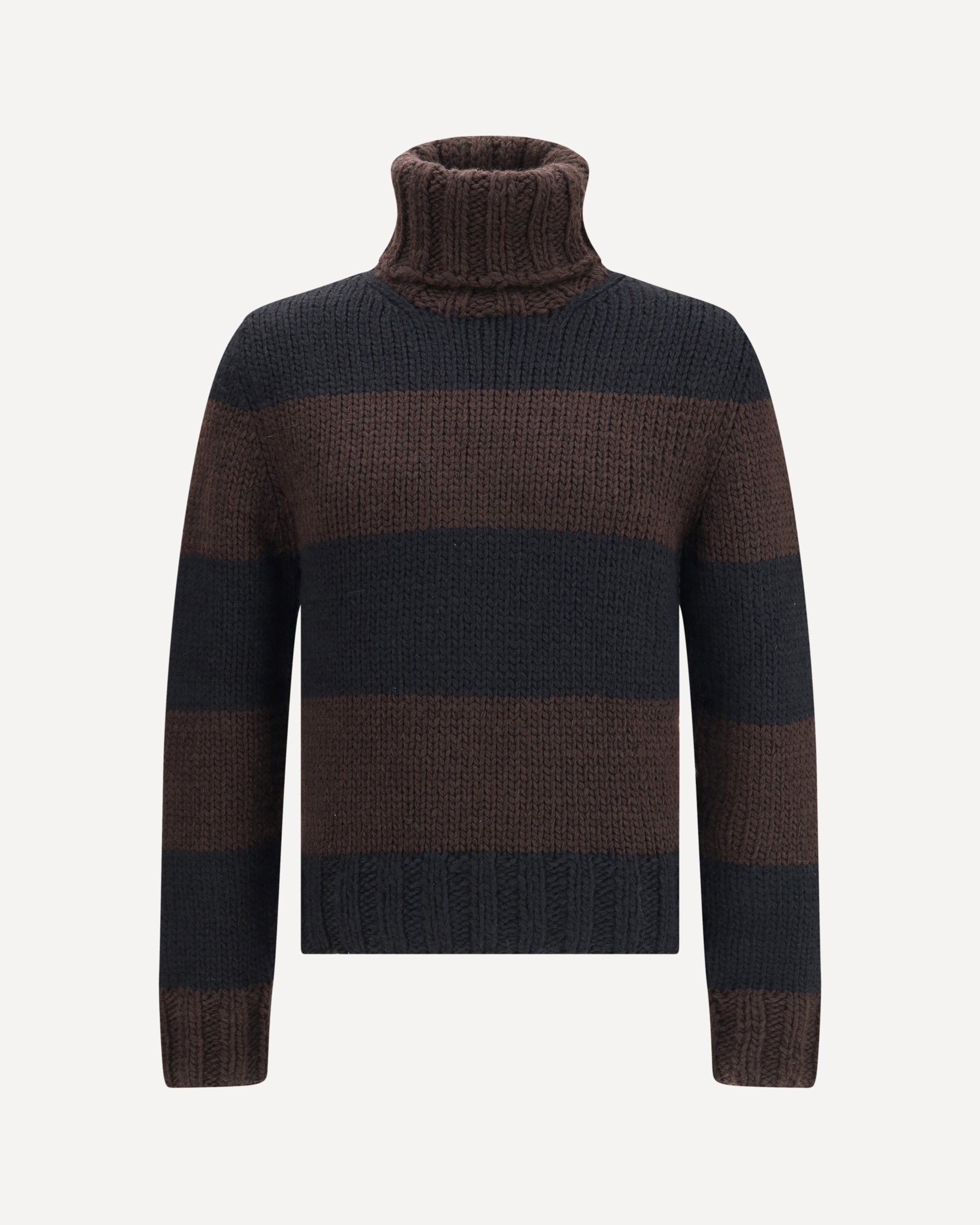 The Striped Wool-Blend Turtleneck by Dolce & Gabbana combines sophistication and practicality in a piece with a bold character. The multicolored design adds dynamism and personality, while the long sleeves and high neck provide warmth and comfort during colder days. A versatile sweater, designed to enrich both casual and more refined outfits with elegance.