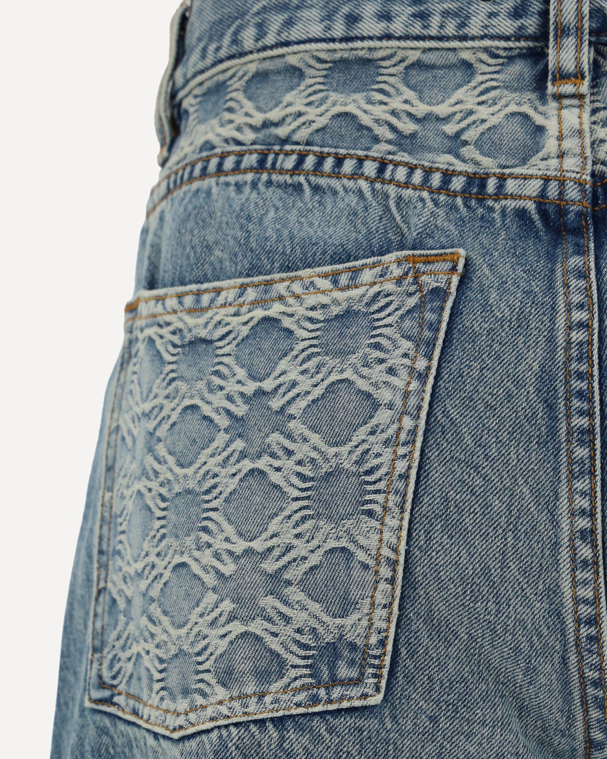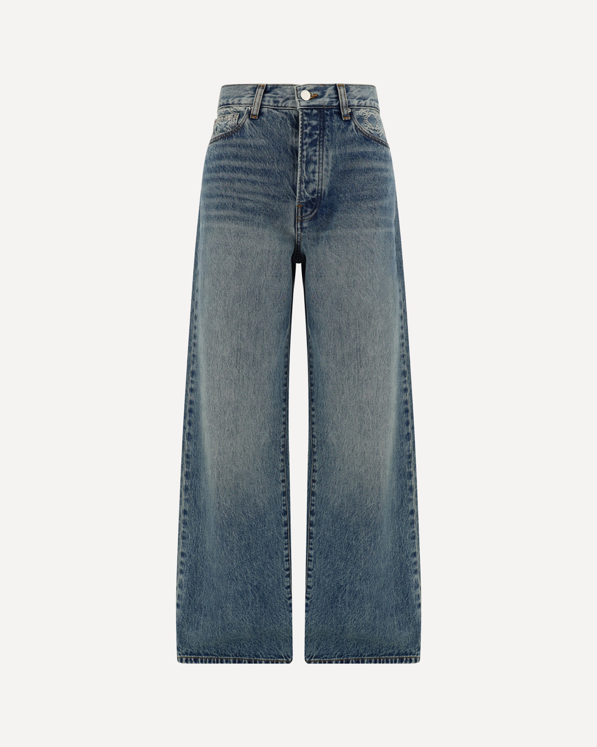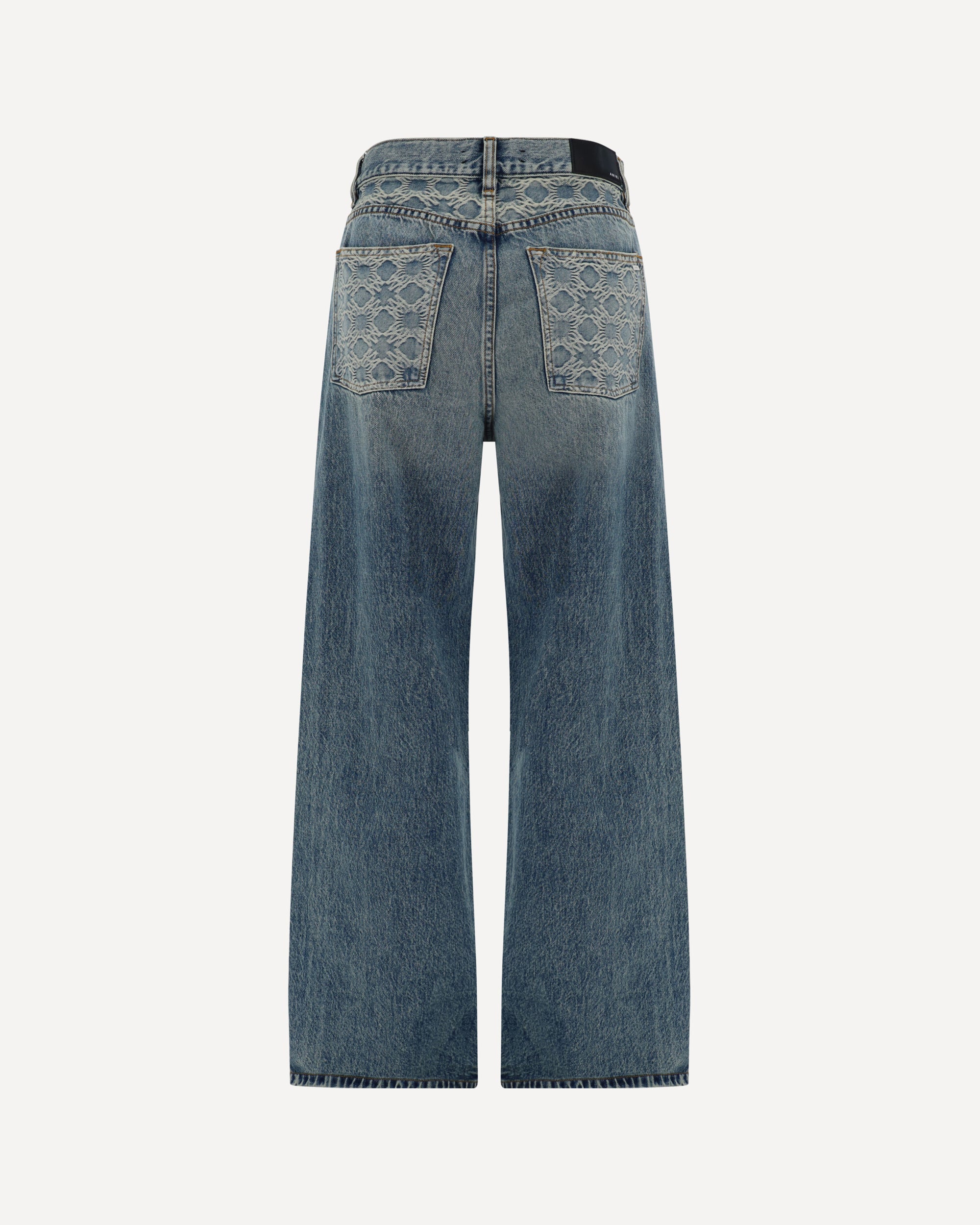 Amiri's Jeans reinterpret the palazzo style with a bold, contemporary aesthetic. Made from high-quality denim, they feature a classic five-pocket design with front zipper and button closure, belt loops at the waist, and a regular fit that ensures comfort and freedom of movement. Applied embossed details on the front and back pockets add character to the garment, enhancing the design with a distinctive touch. A versatile and refined model, perfect for defining urban looks with a strong stylistic impact.