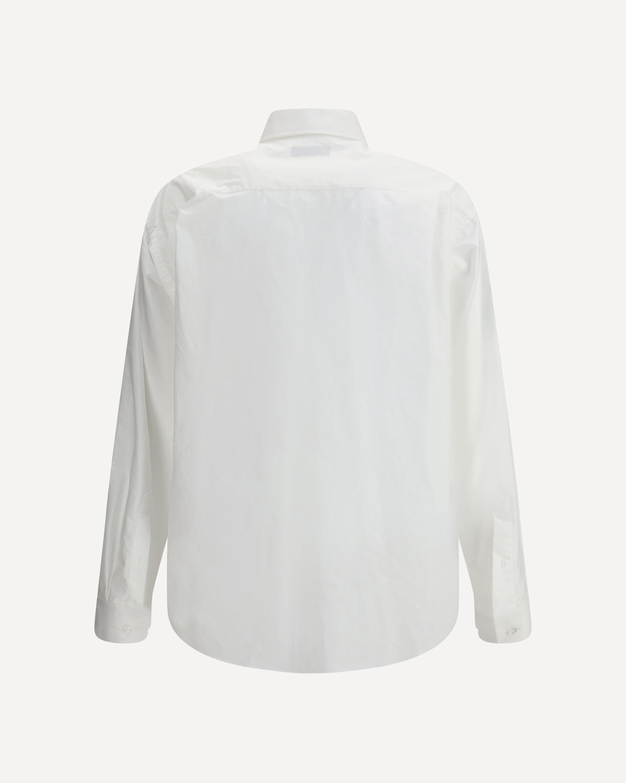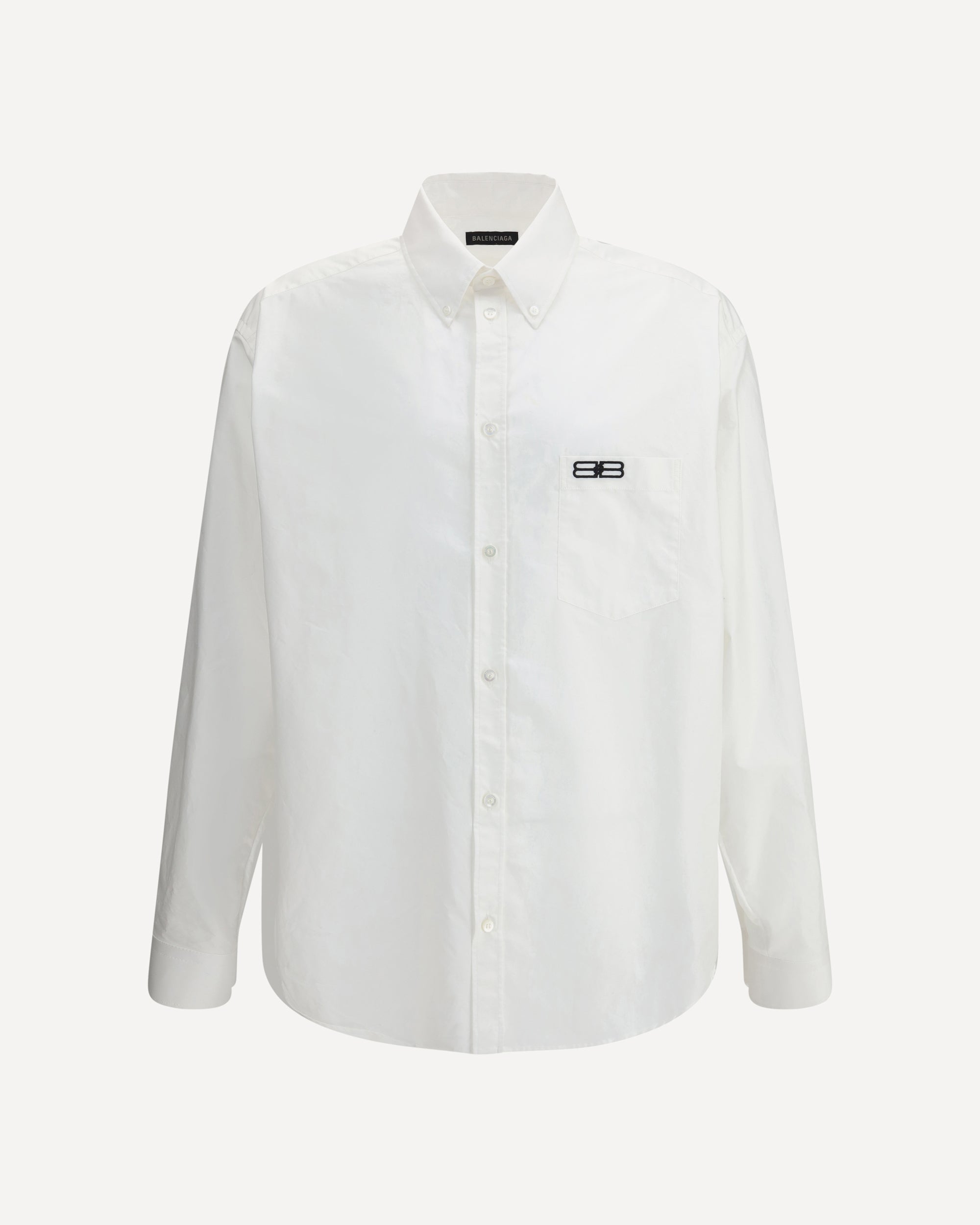 Balenciaga's oversized cotton Shirt features a contemporary and striking design. It features a front button closure, a classic collar and an asymmetrical hem that adds dynamism to the silhouette. A small patch pocket on the front, embellished with the embroidered logo, gives a distinctive and refined detail, perfect for those who love a modern and bold style.