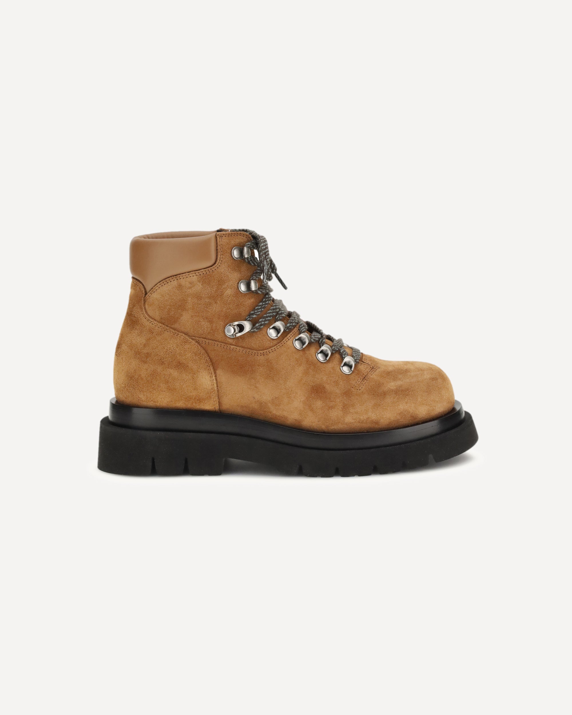 The Lug hiking Boots by Bottega Veneta reinterpret outdoor style with contemporary elegance. Made of rough suede, they feature a lace-up construction and a soft leather collar that ensures comfort and a snug fit. A rugged yet refined model, perfect for adding a bold and sophisticated touch to seasonal looks.