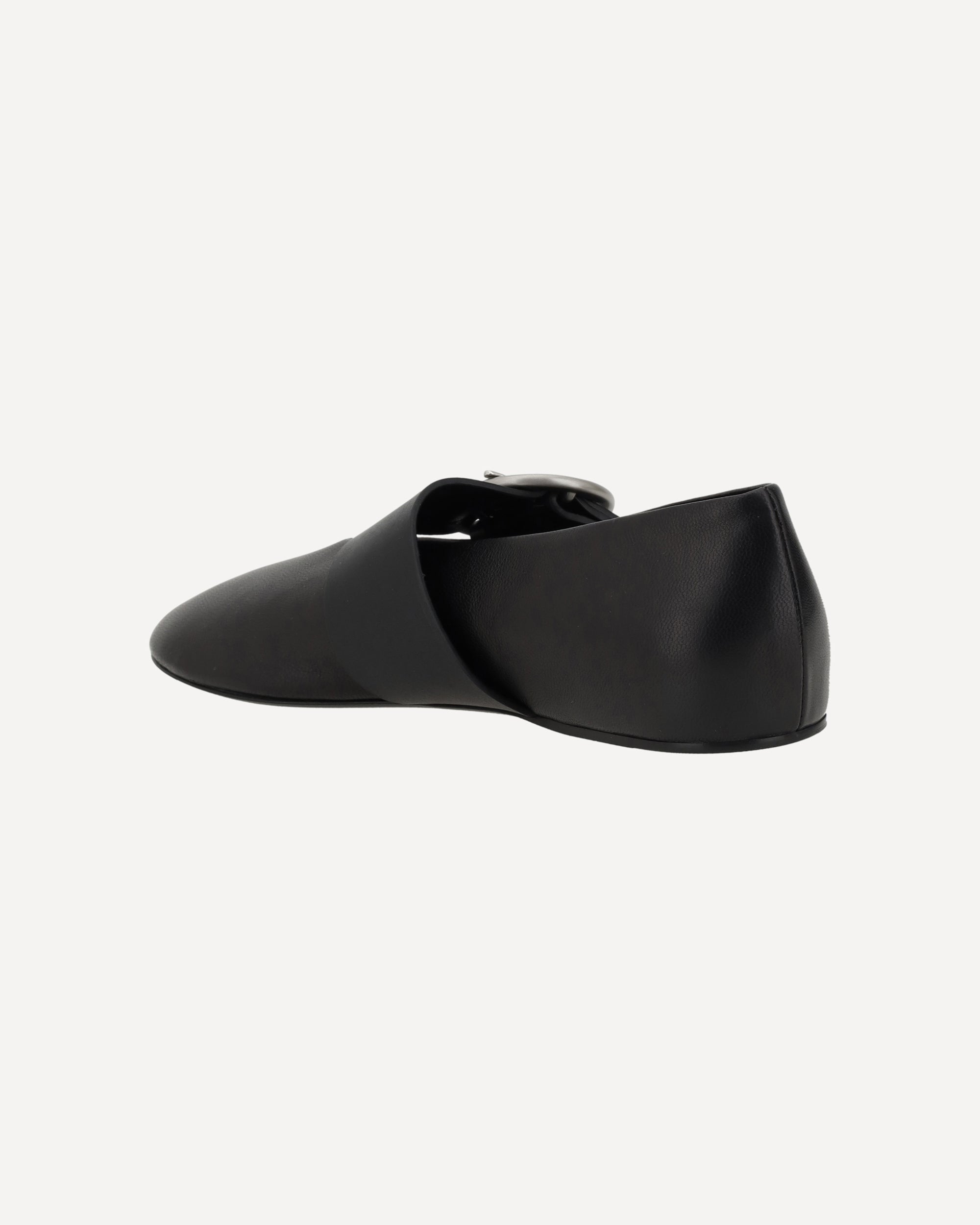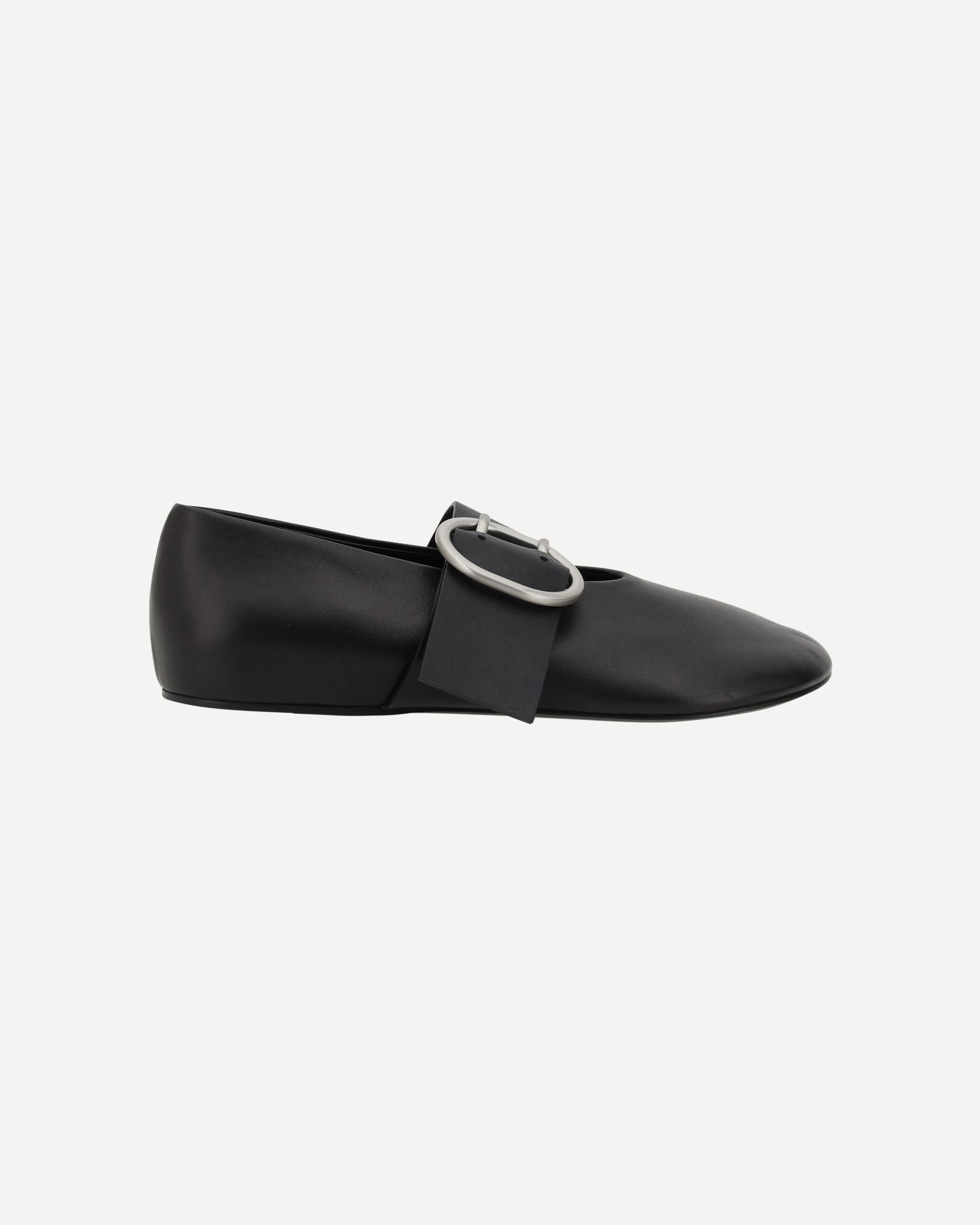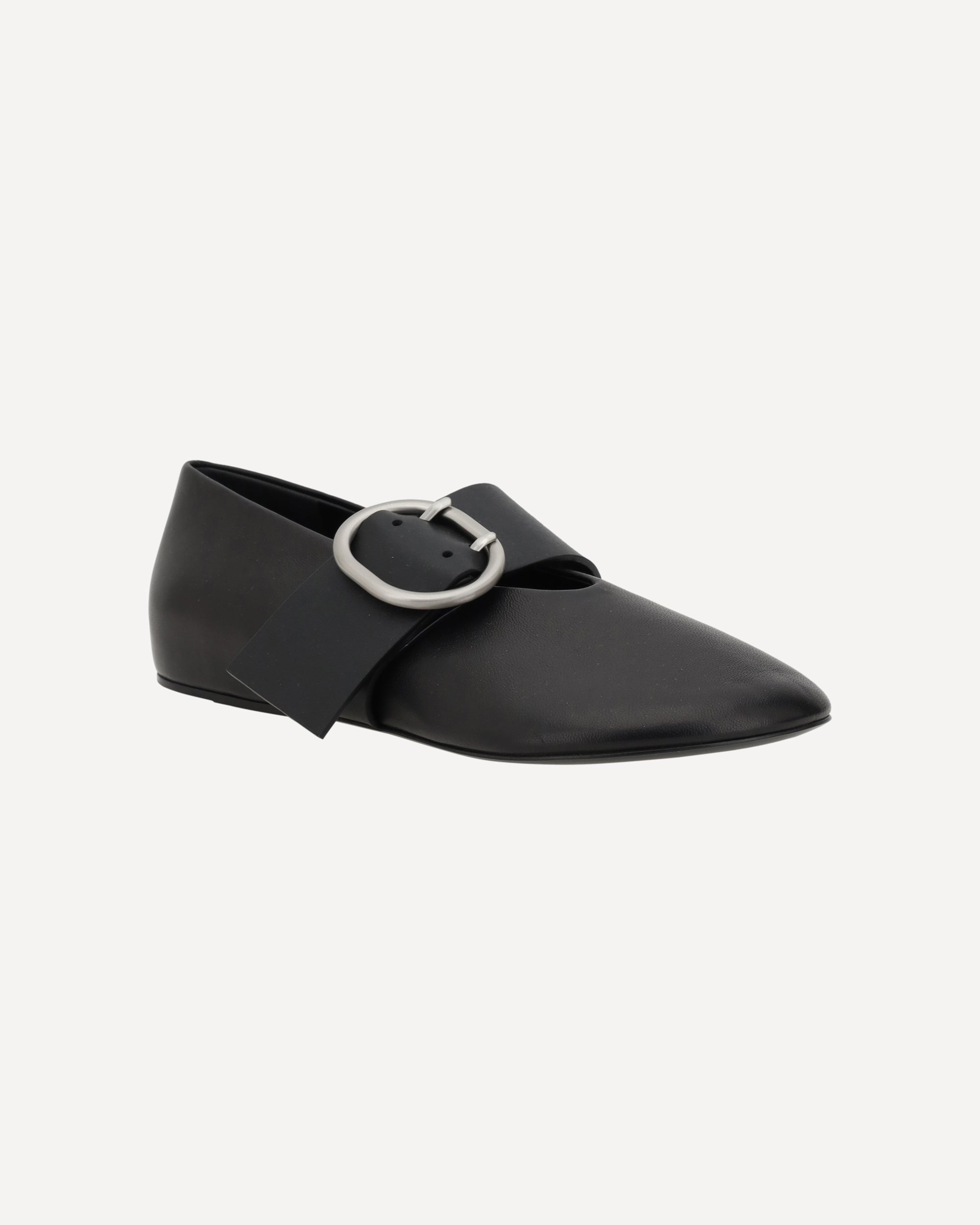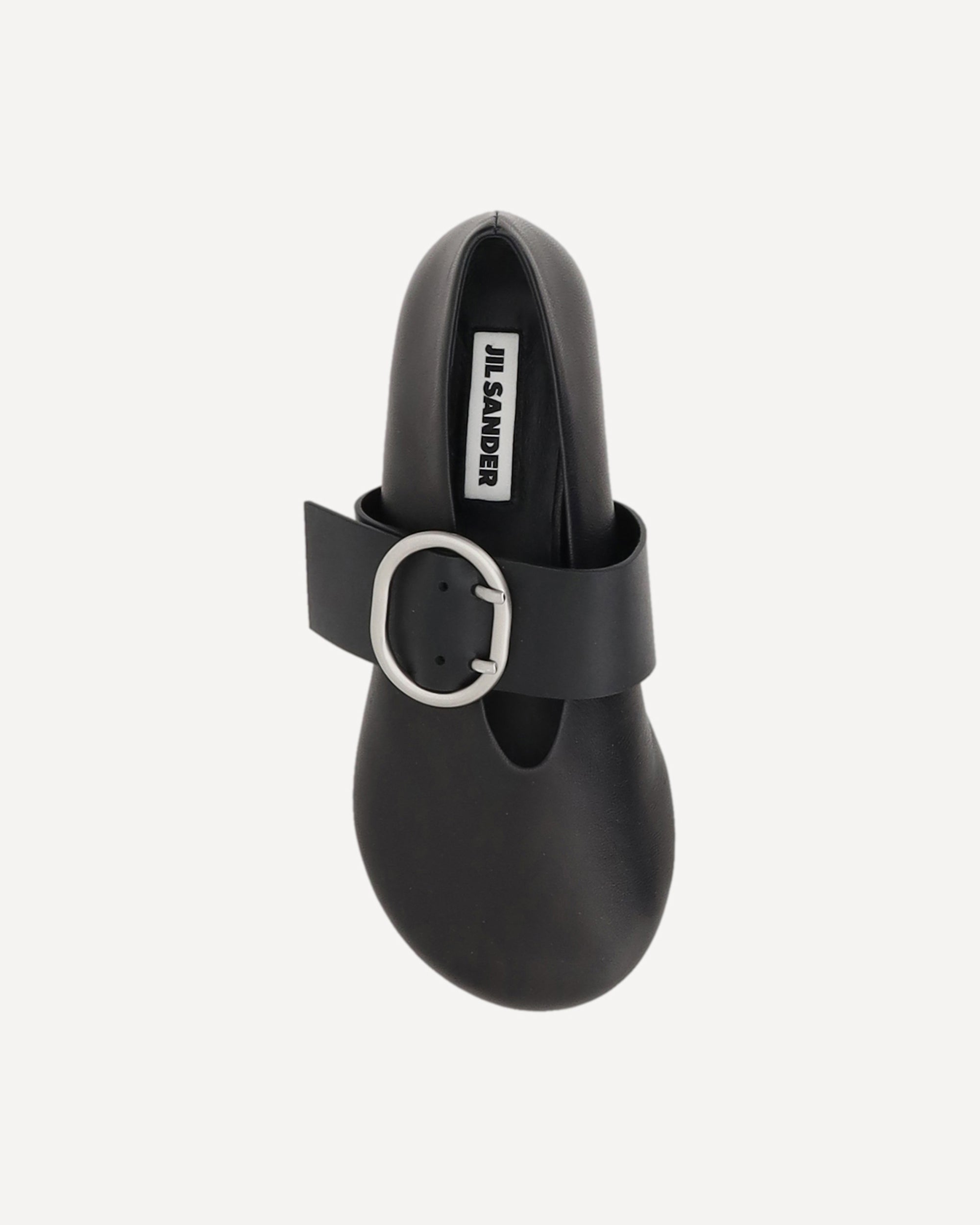 Jil Sander's leather Ballerinas feature an elongated toe and a refined design. The flat sole ensures comfort and versatility, while the contrasting wide applied buckle closure on the front adds a distinctive and modern touch. The contrasting branded insole completes the minimalist and elegant aesthetic, making these ballet flats ideal for a sophisticated and chic look.
